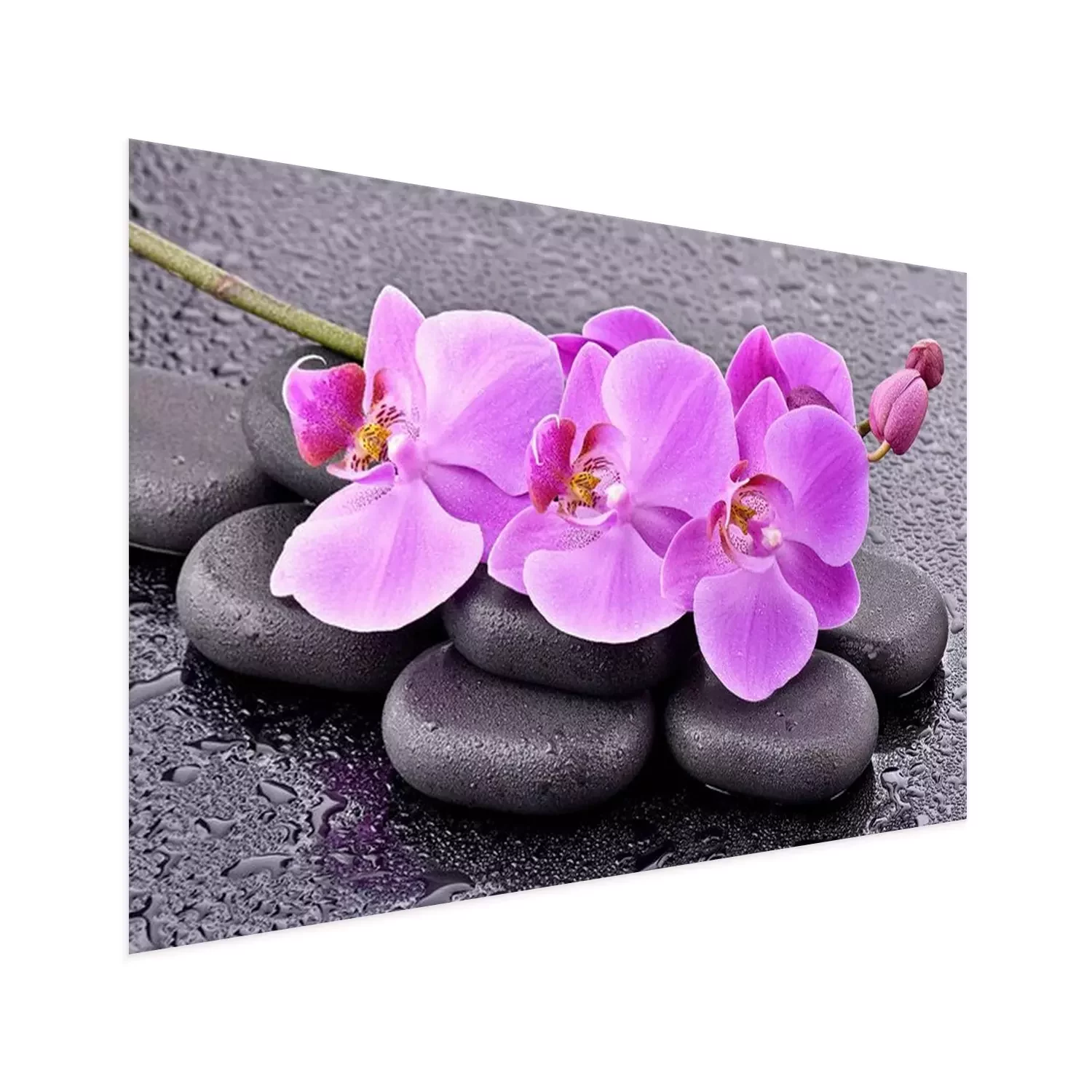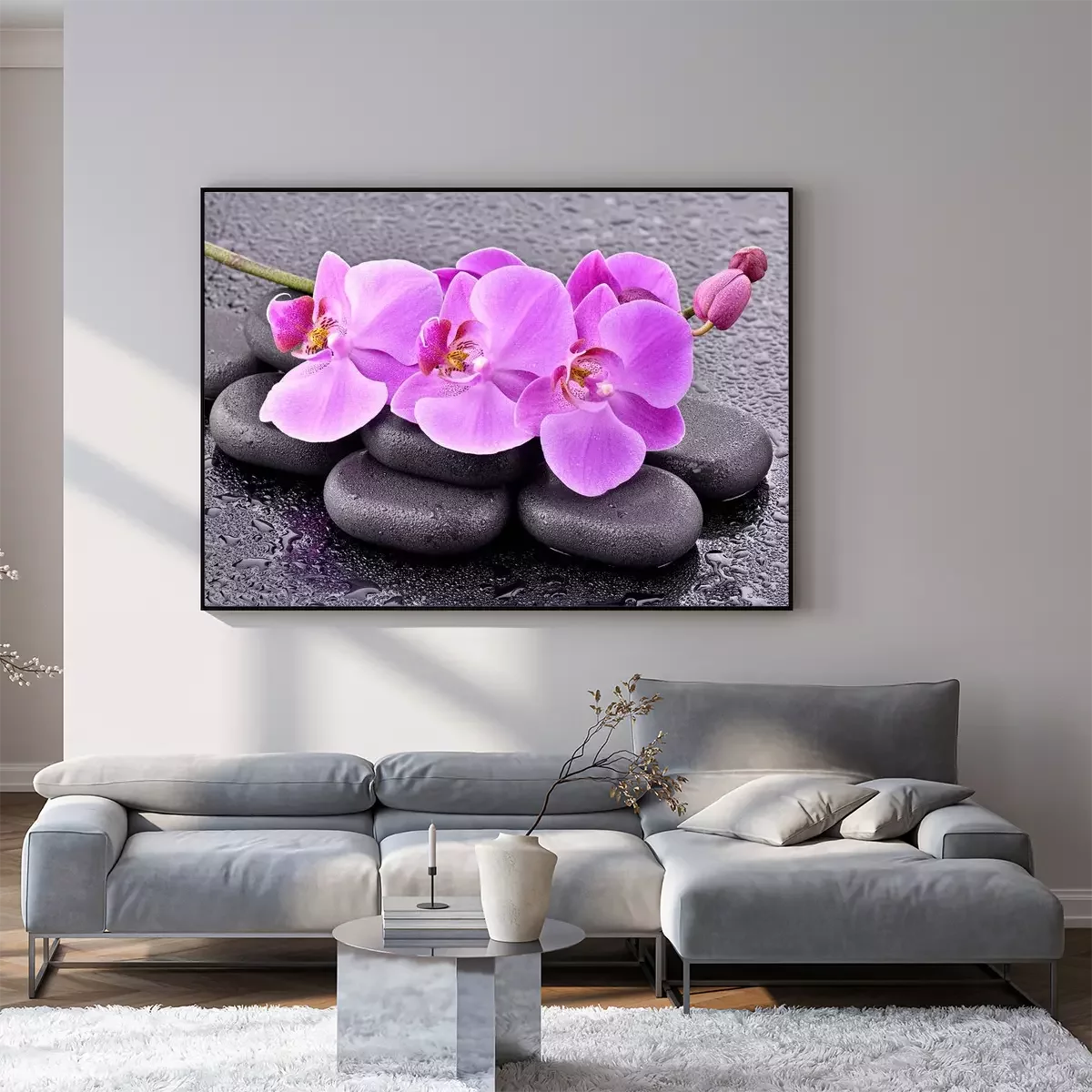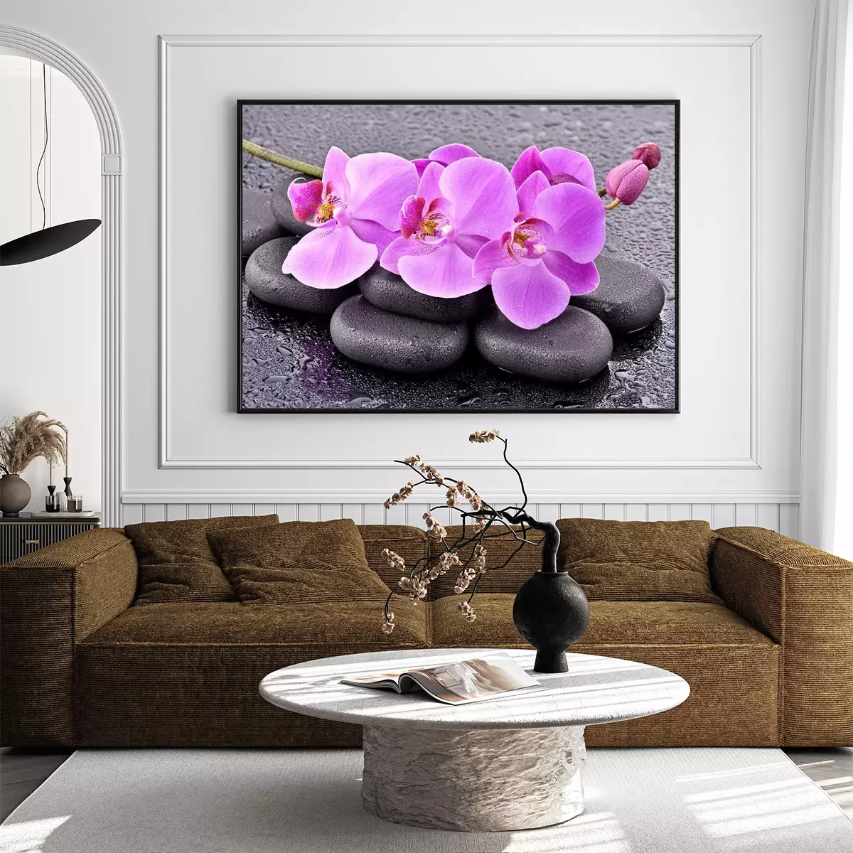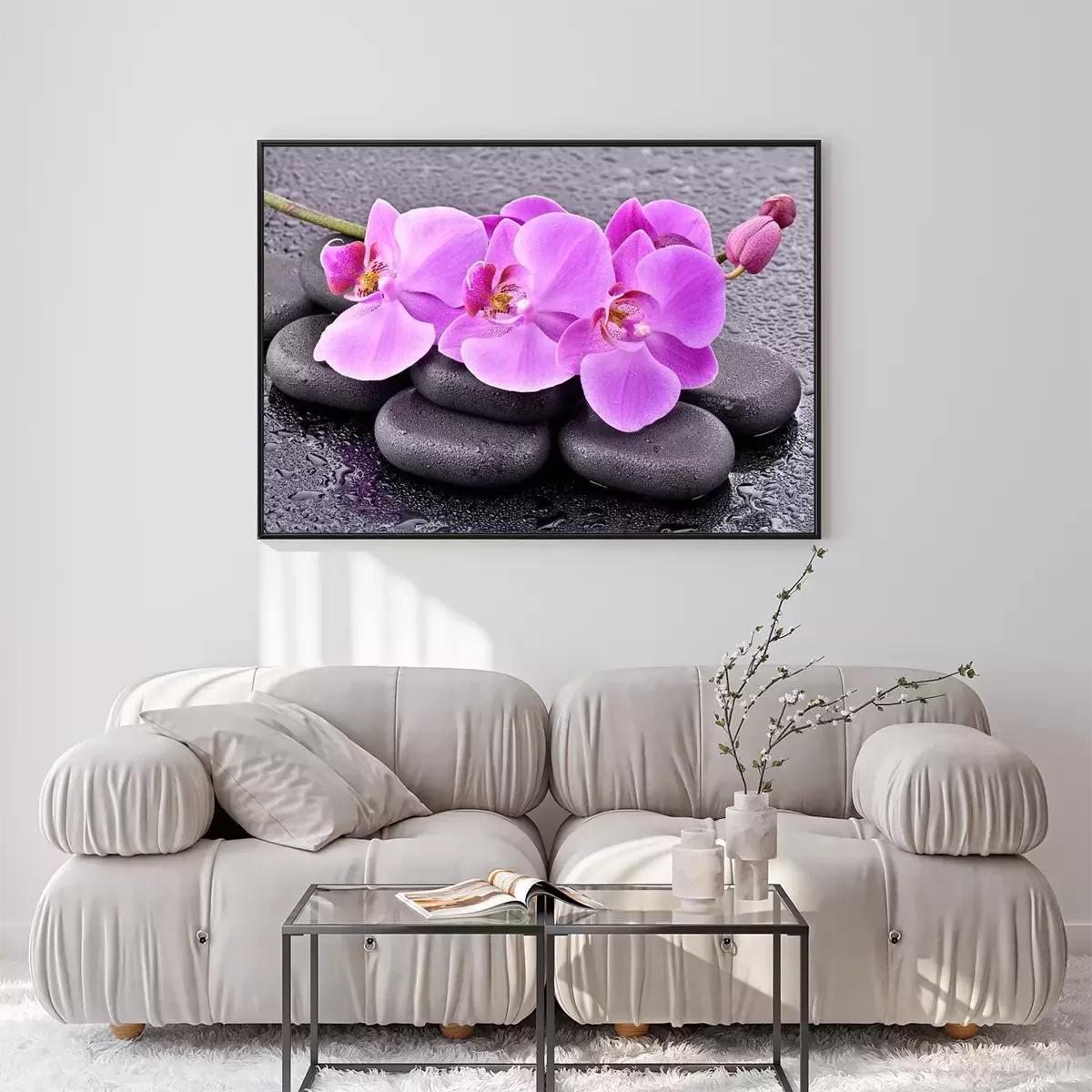 Poster: Roze bloemen gerangschikt op zwarte stenen