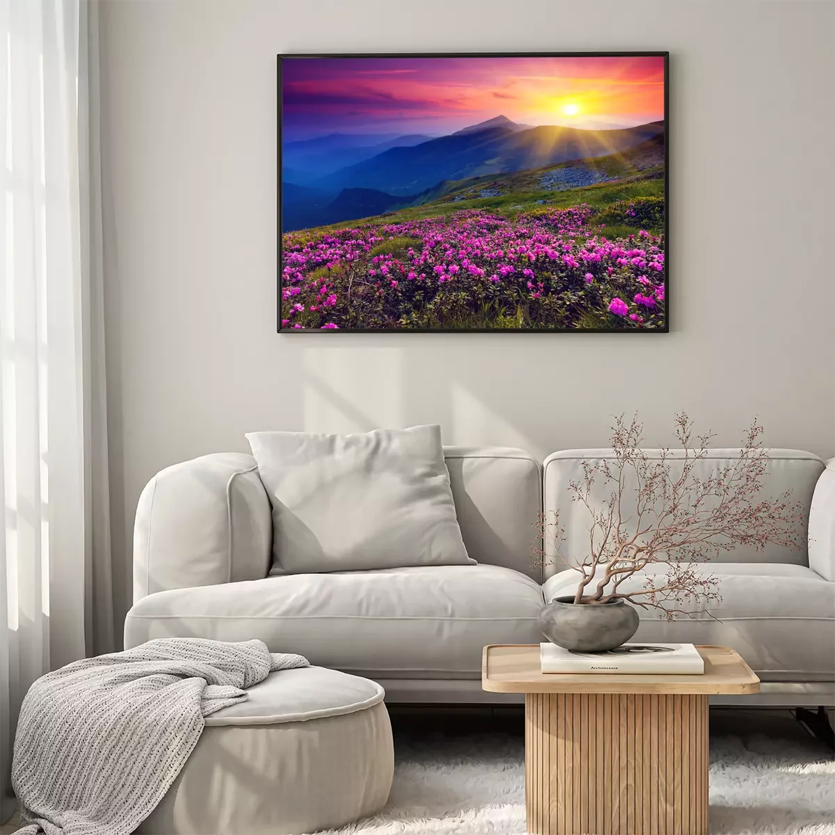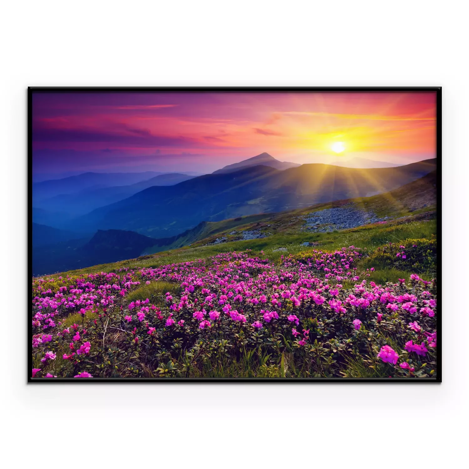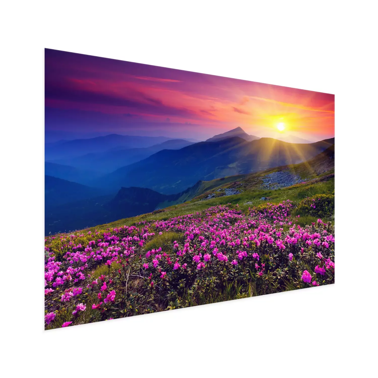Poster Roze bloemen tegen een berglandschap in het licht van de zonsondergang.