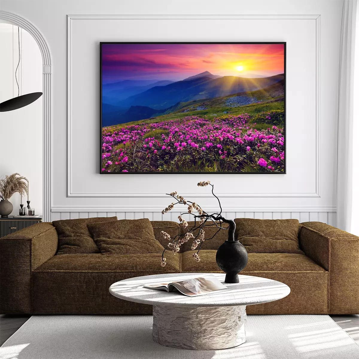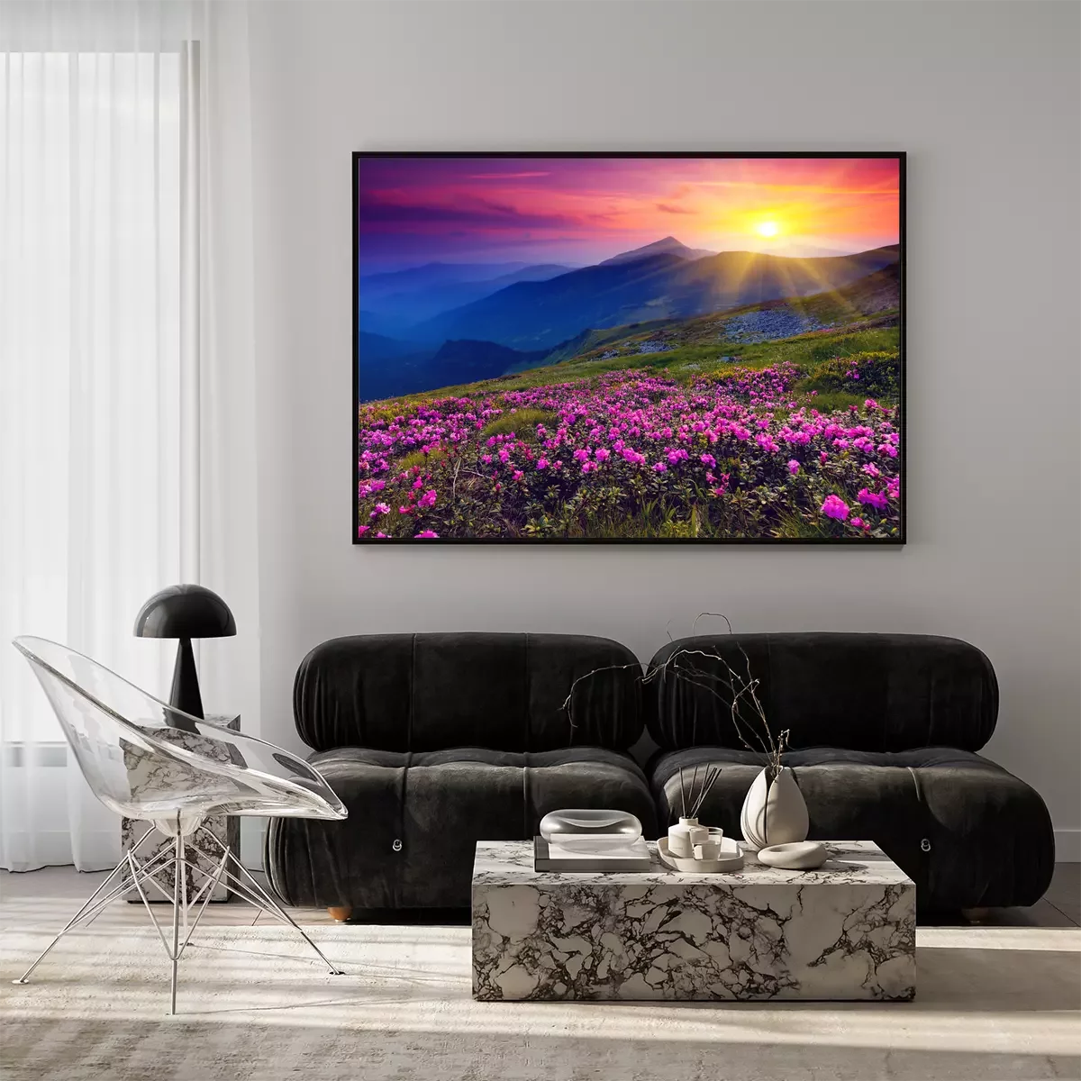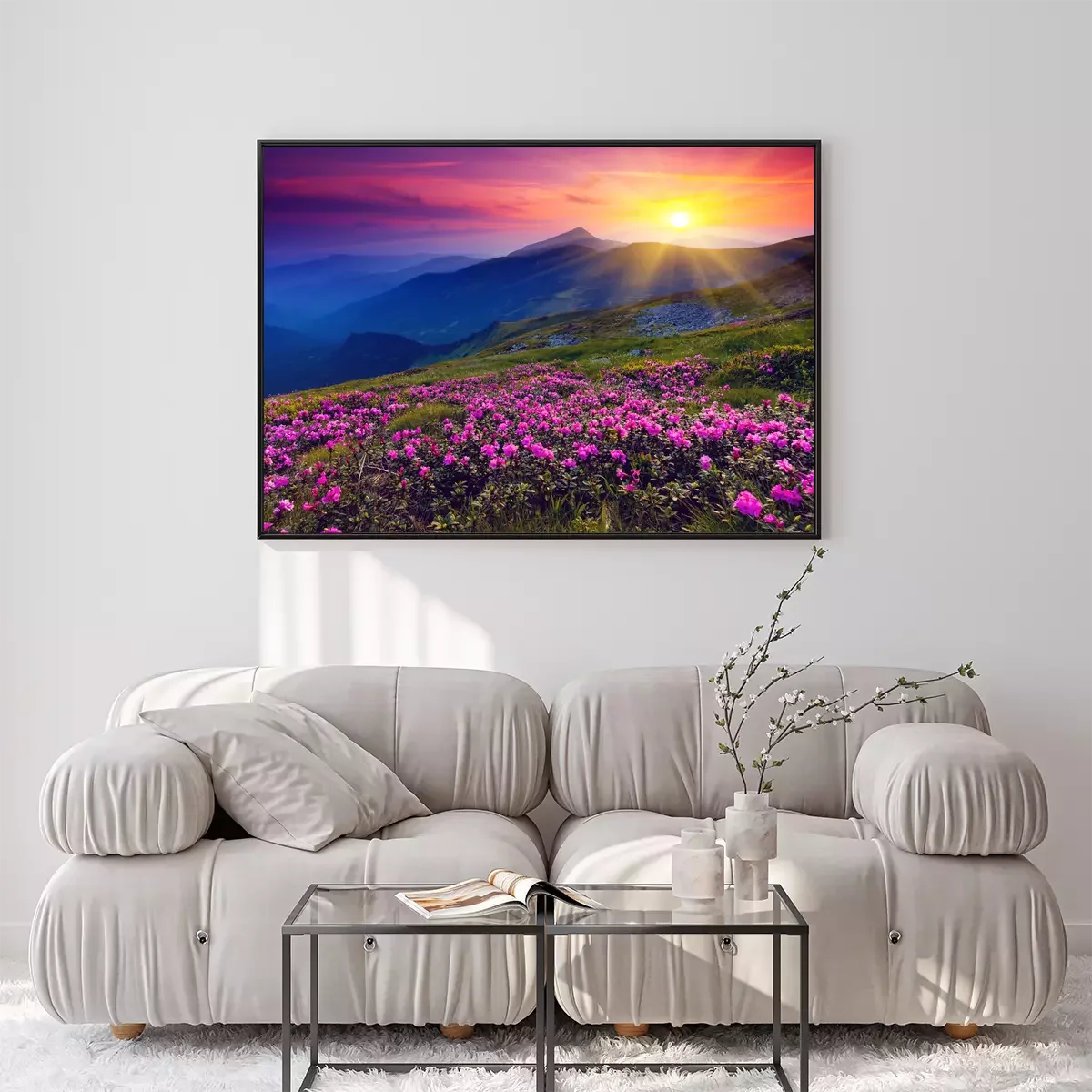 Poster Roze bloemen tegen een berglandschap in het licht van de zonsondergang.