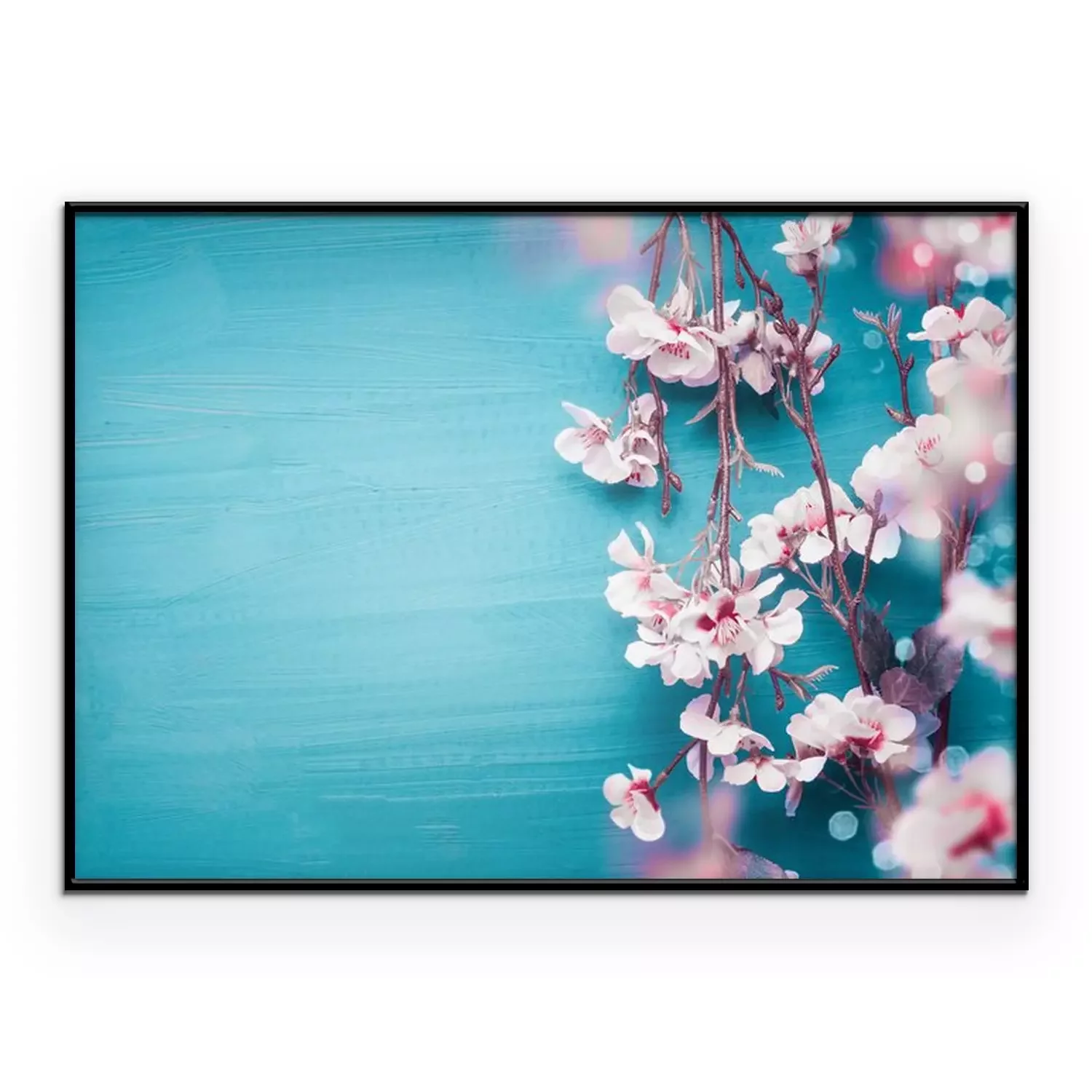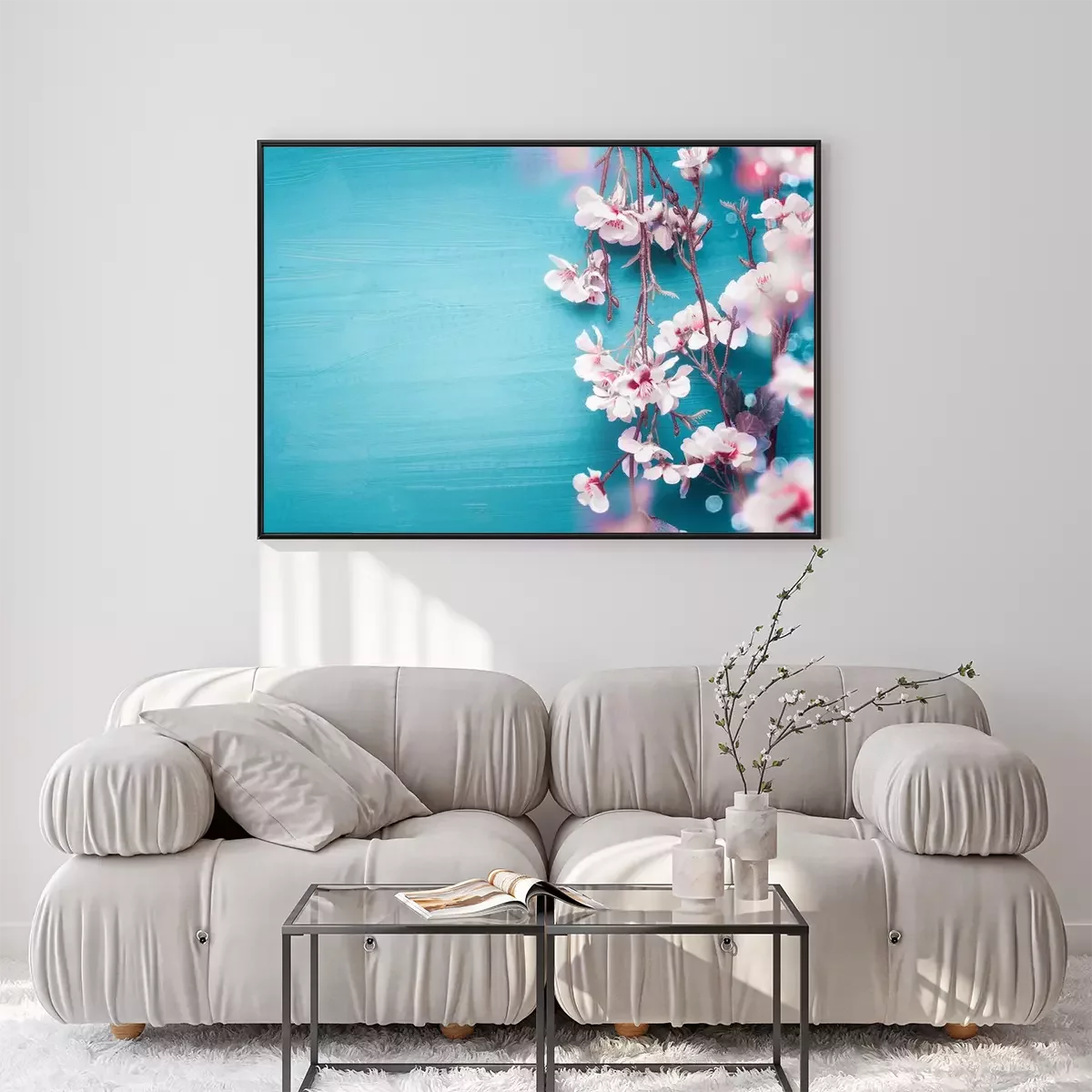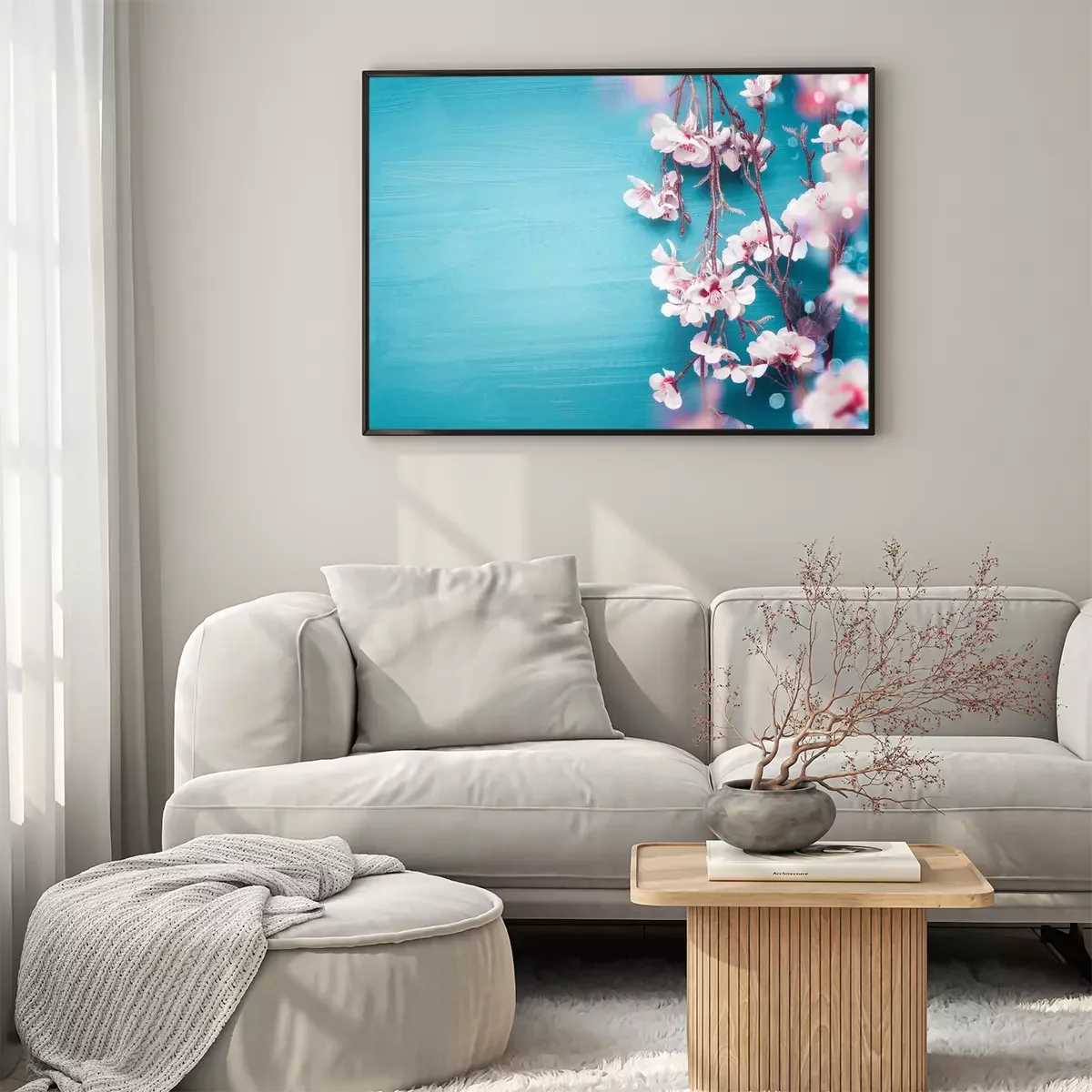 Poster: Roze lentetakjes op een blauwe achtergrond
