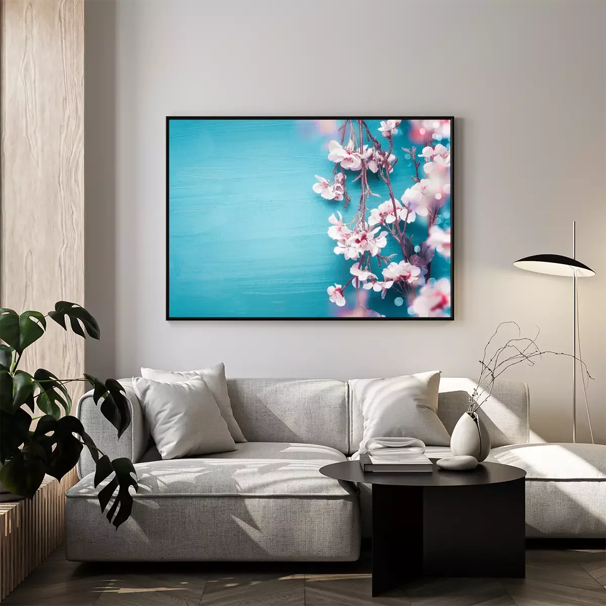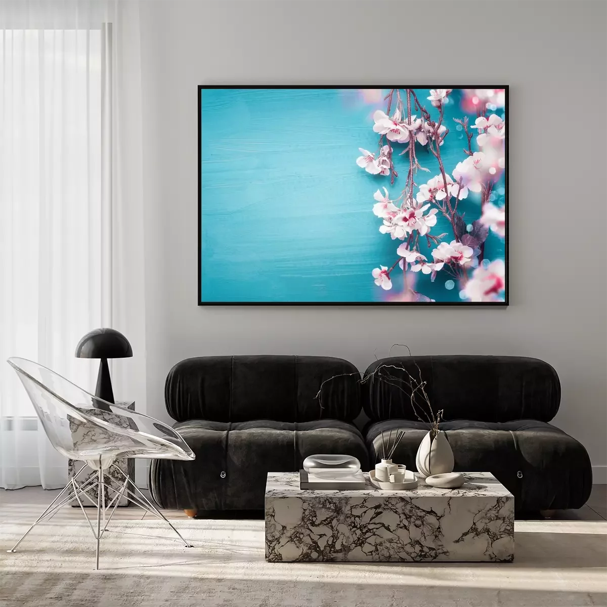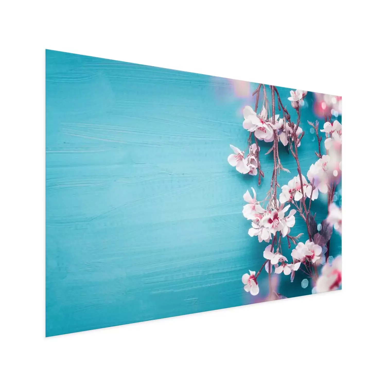 Poster: Roze lentetakjes op een blauwe achtergrond