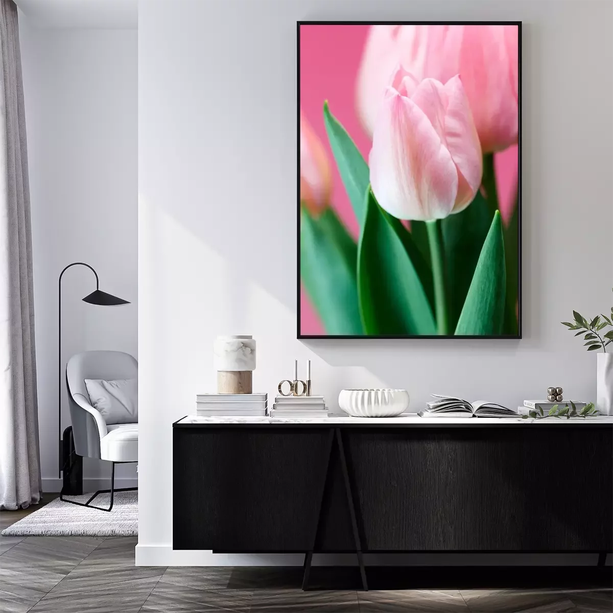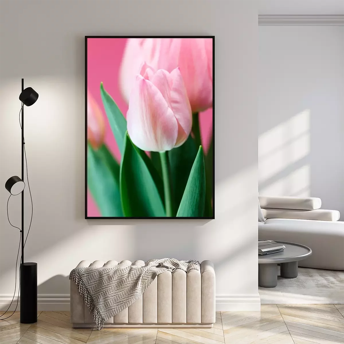 Poster: Roze tulpen op roze achtergrond
