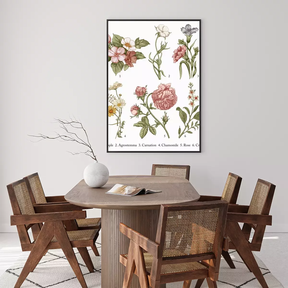 Seamless pattern. Realistic blooming isolated flowers Vintage fabric background. Beautiful Rosehip chamomile croton wildflowers. Wallpaper baroque. Drawing engraving. Vector victorian Illustration