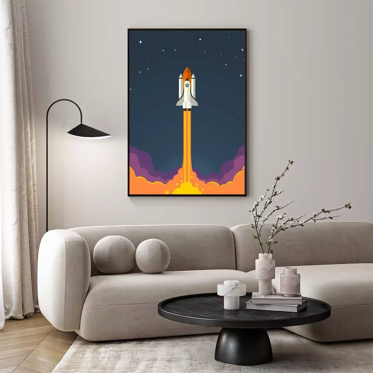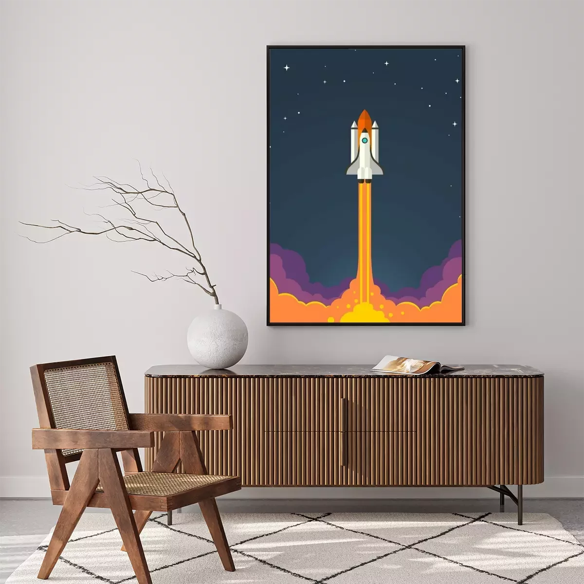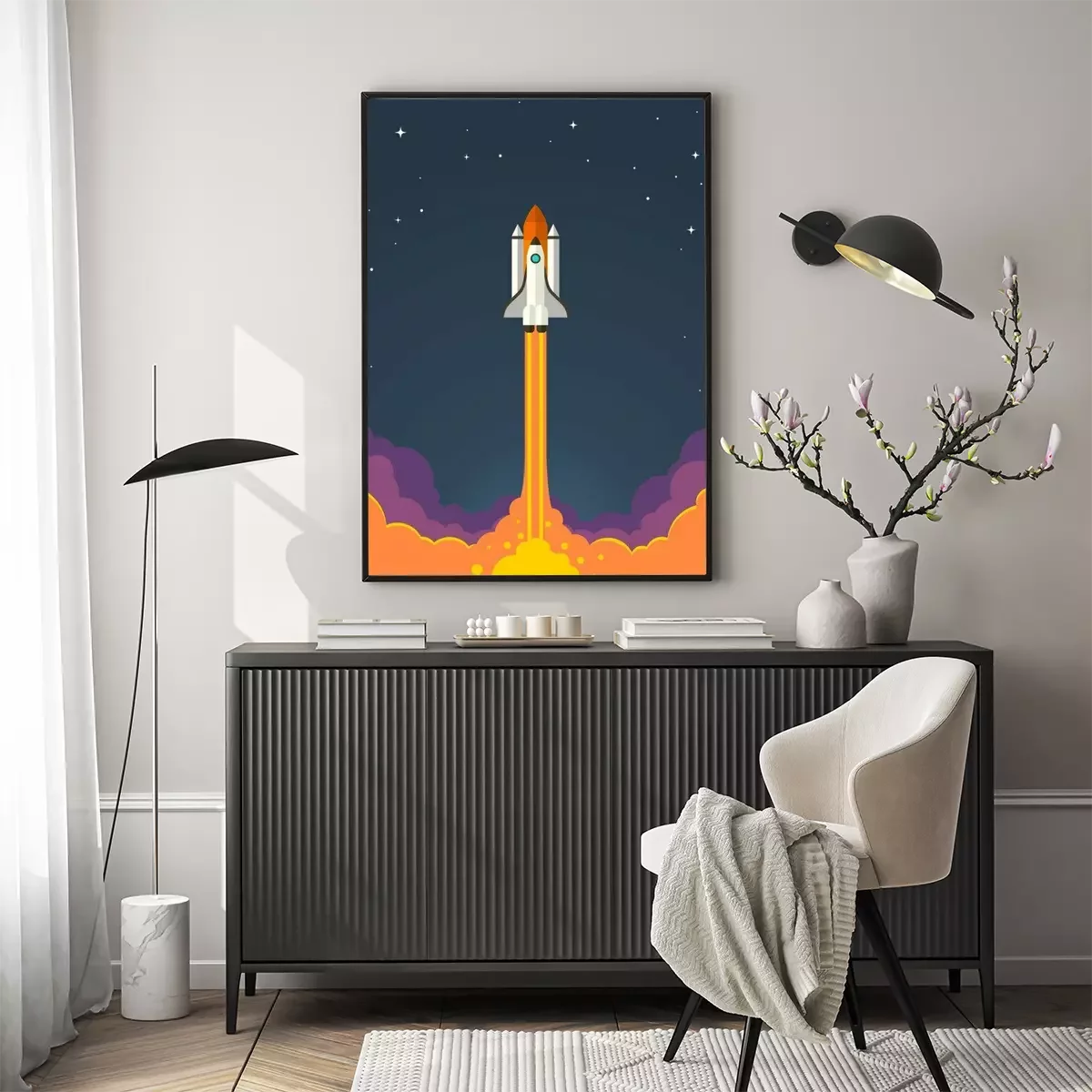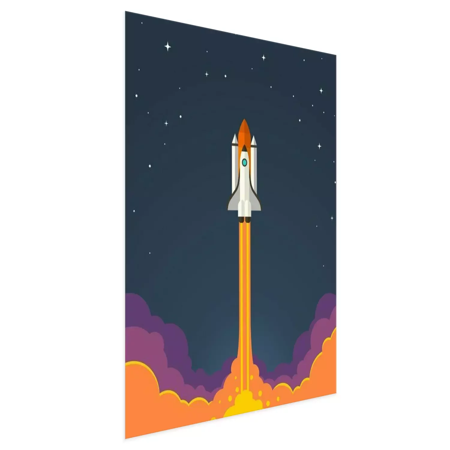 Poster Ruimteraketlancering. Vectorillustratie van startruimte raket met rookwolken op donkere nachthemel achtergrond.