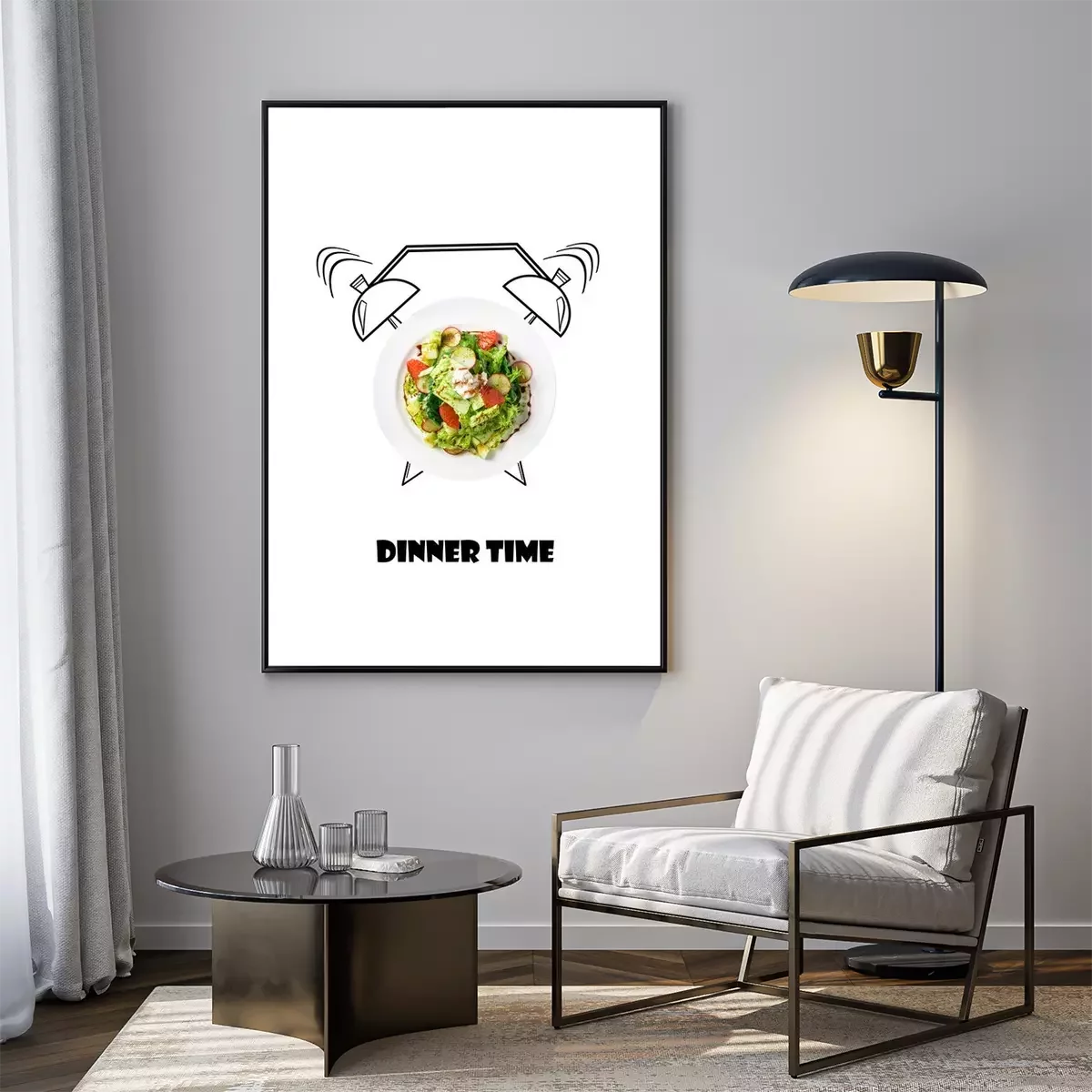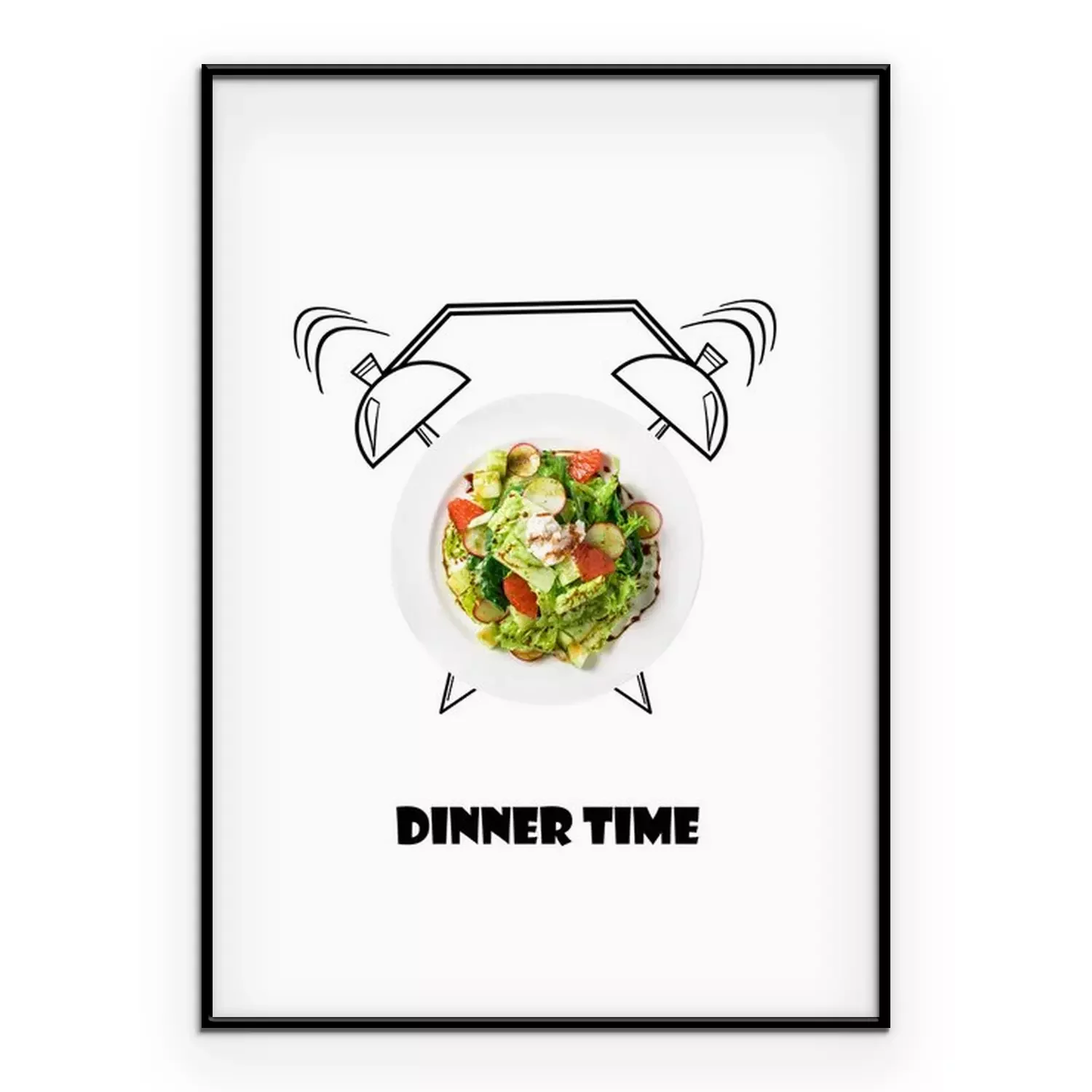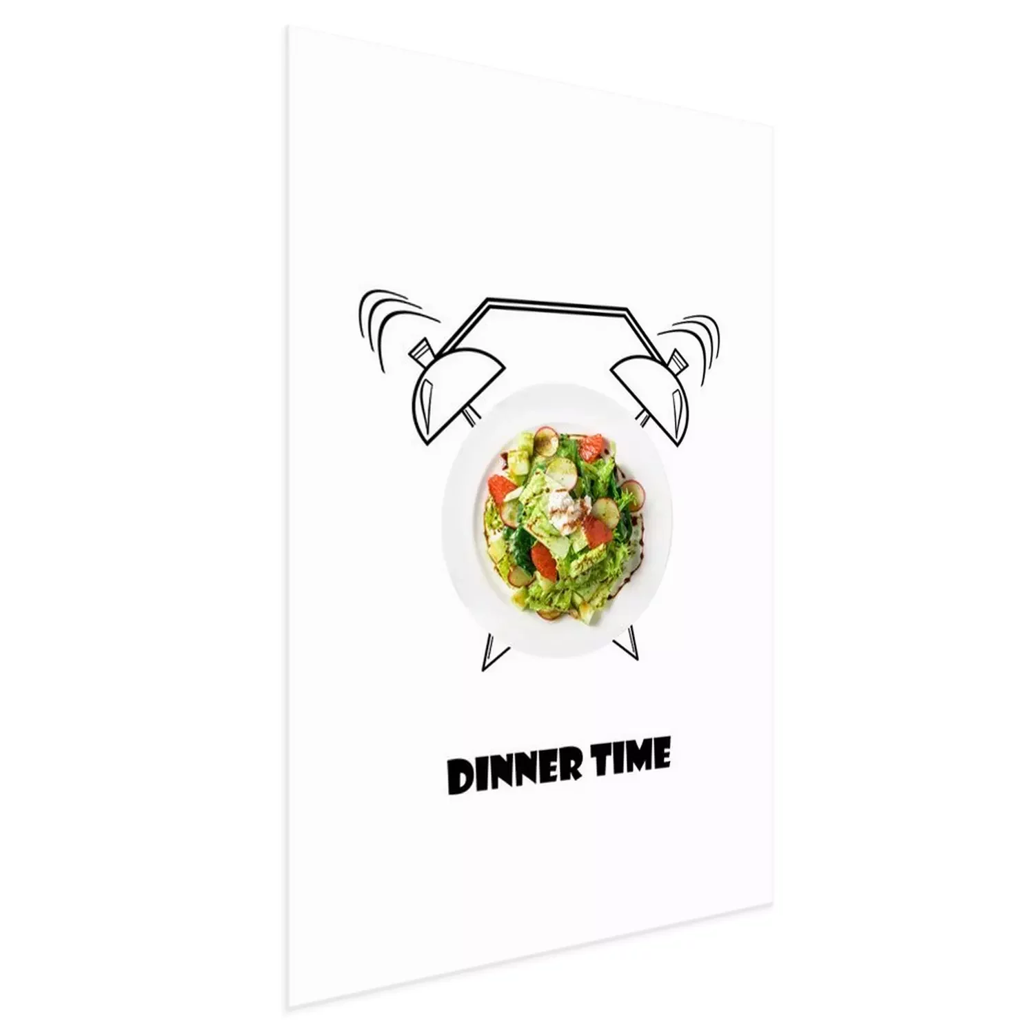 Poster: Salade op plaat met wekker. Tijd concept van het diner. Voedselillustratie op witte achtergrond wordt geïsoleerd die.