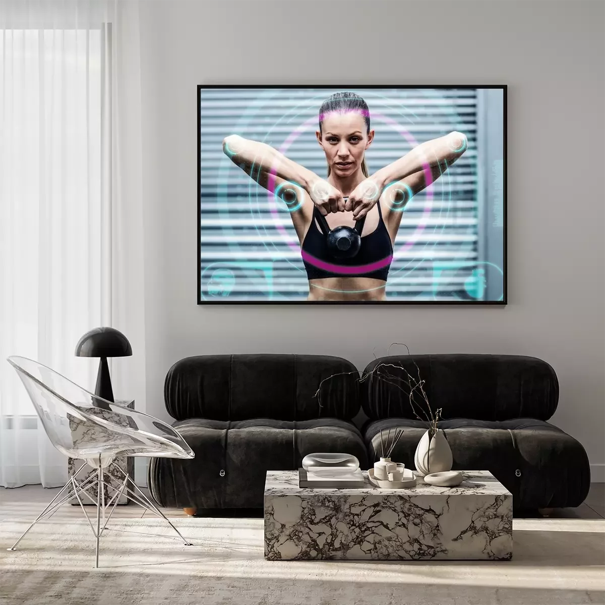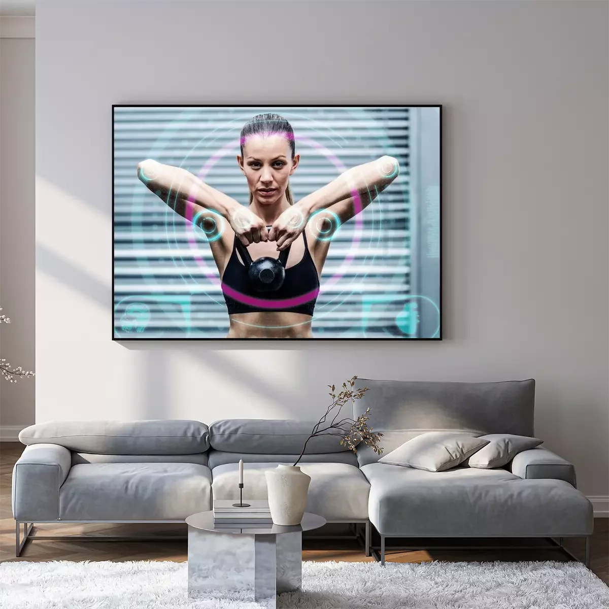 Poster: Samengesteld beeld van een gespierde vrouw tillen kettlebells