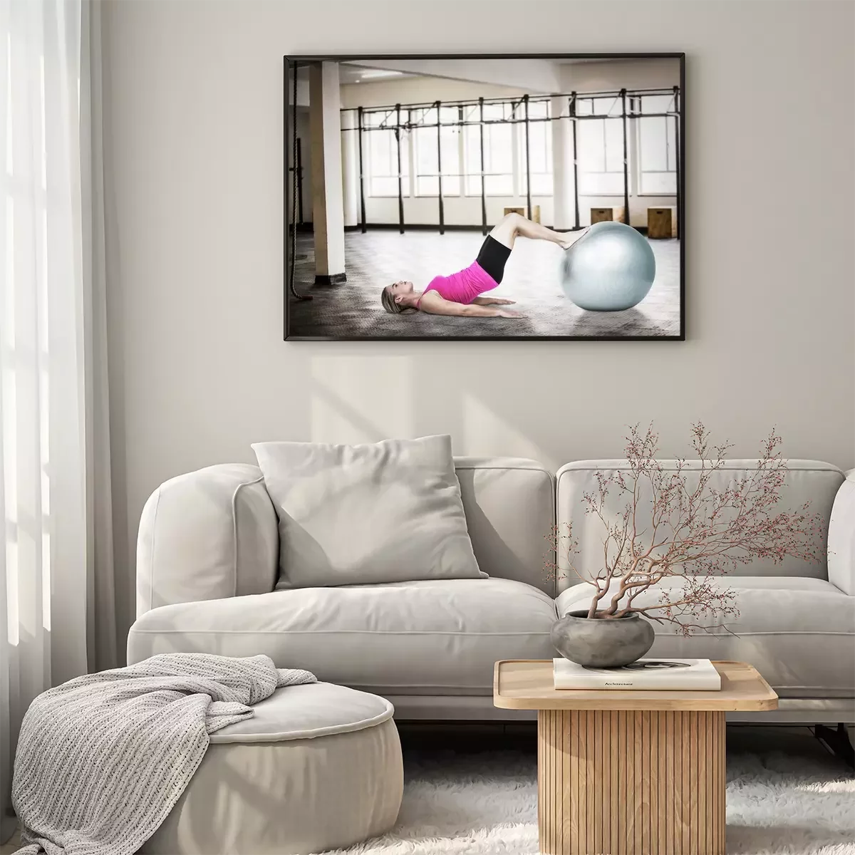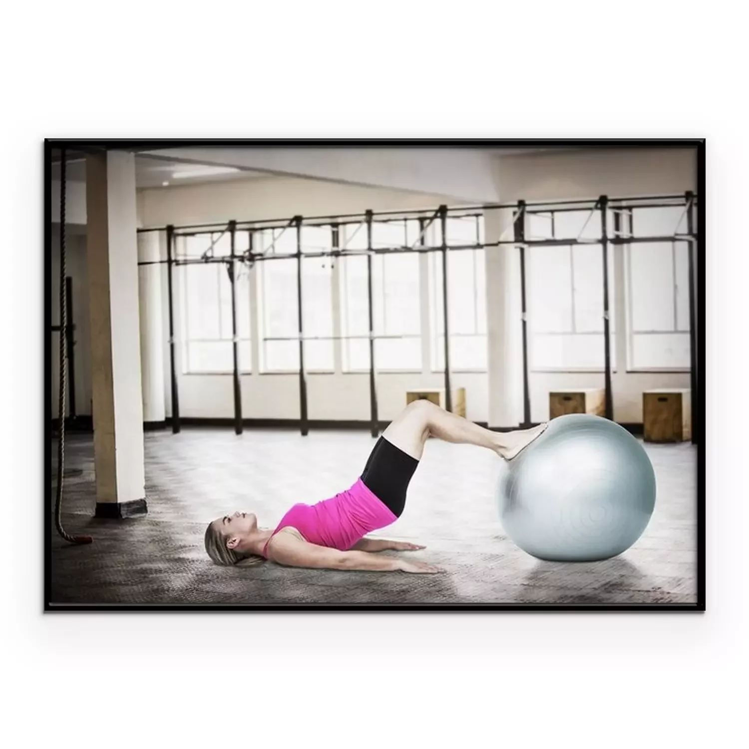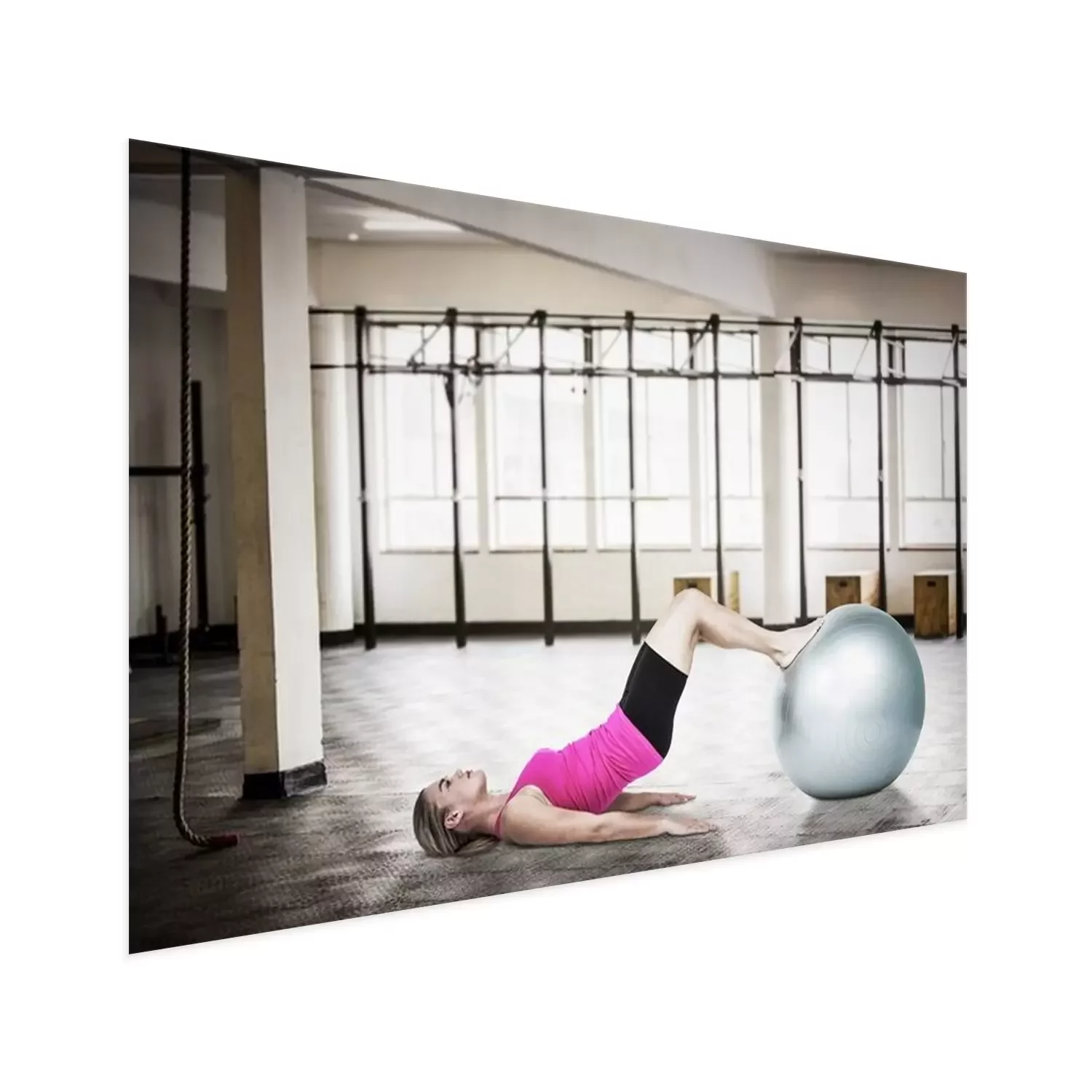 Poster: Samengesteld beeld van zijaanzicht van de vrouw te oefenen met bal