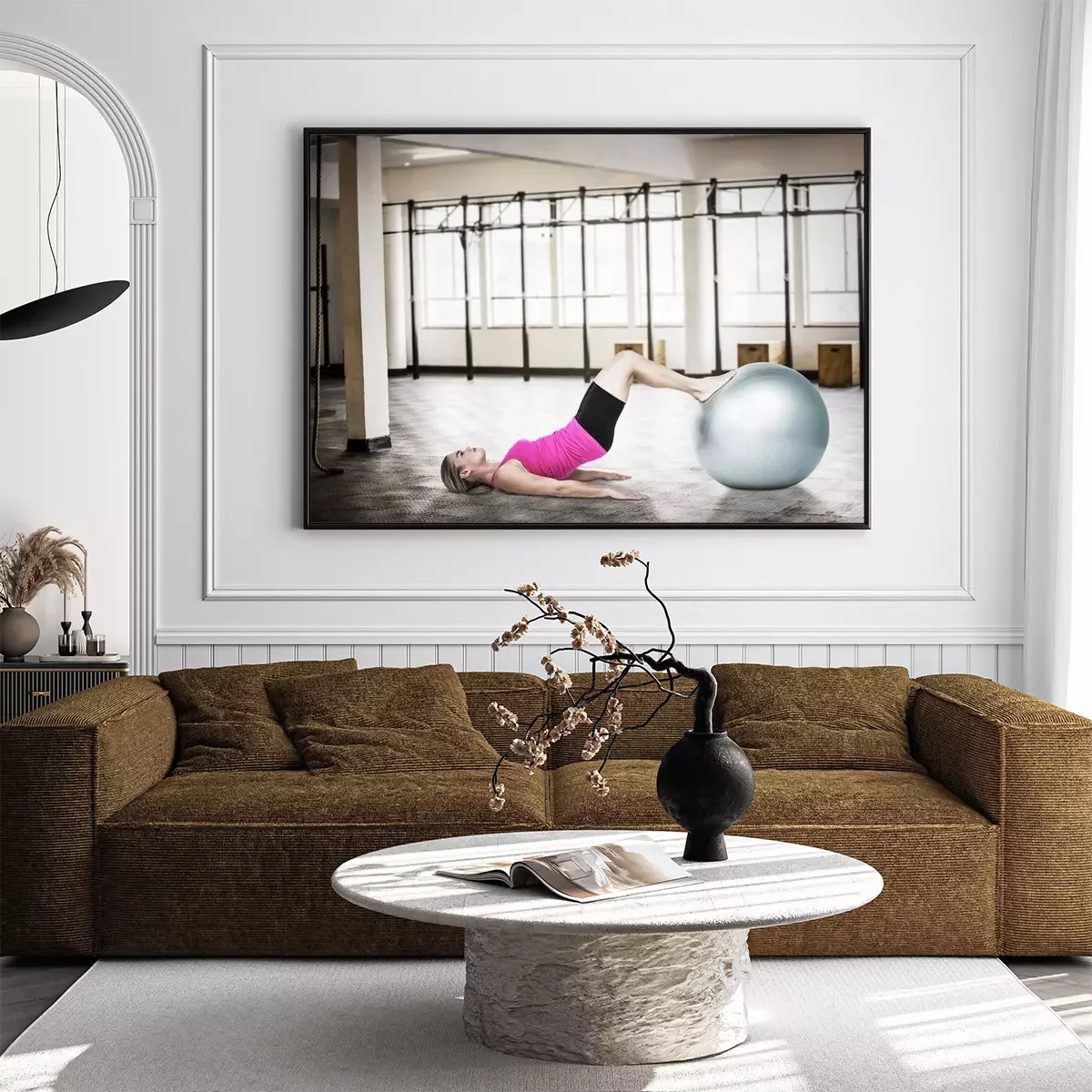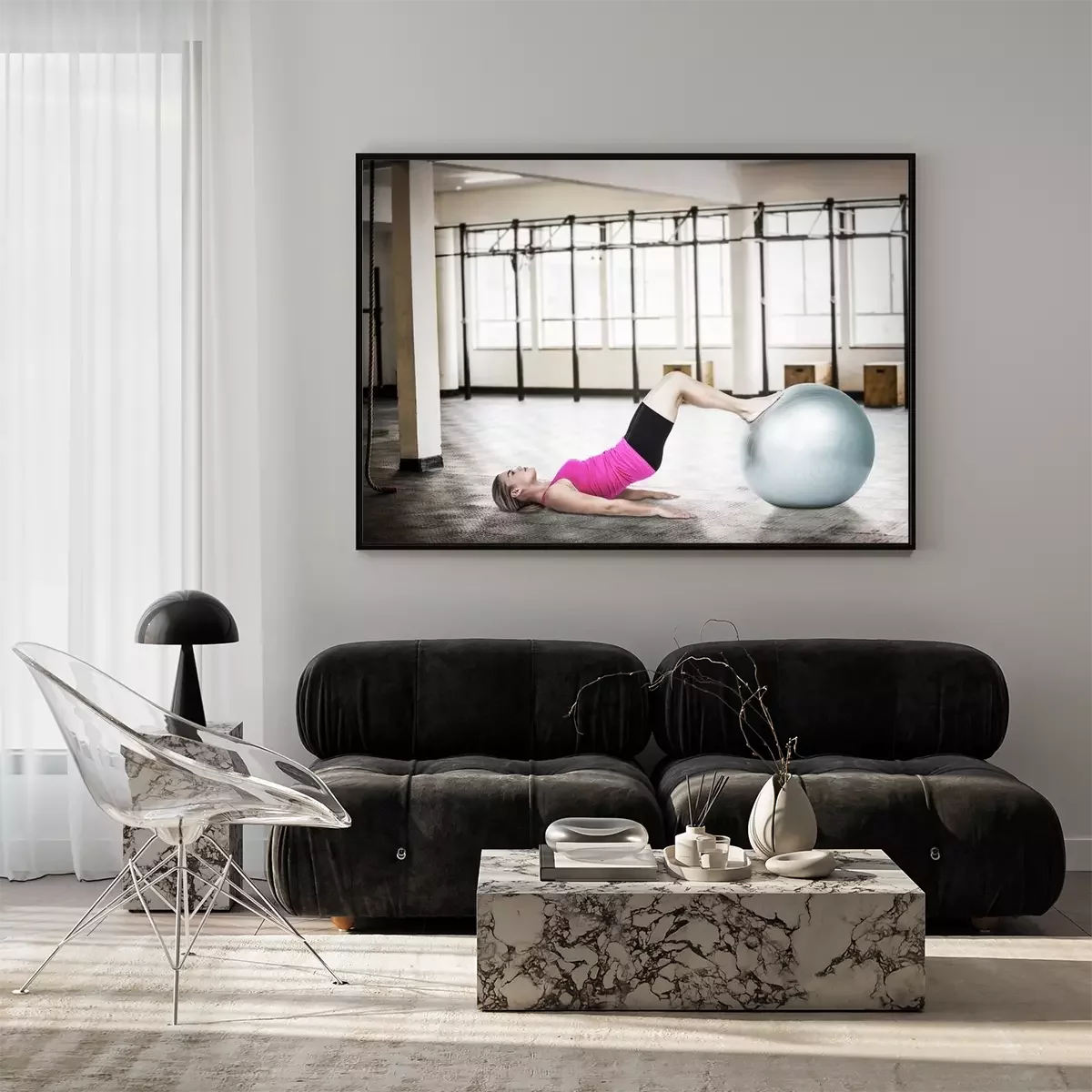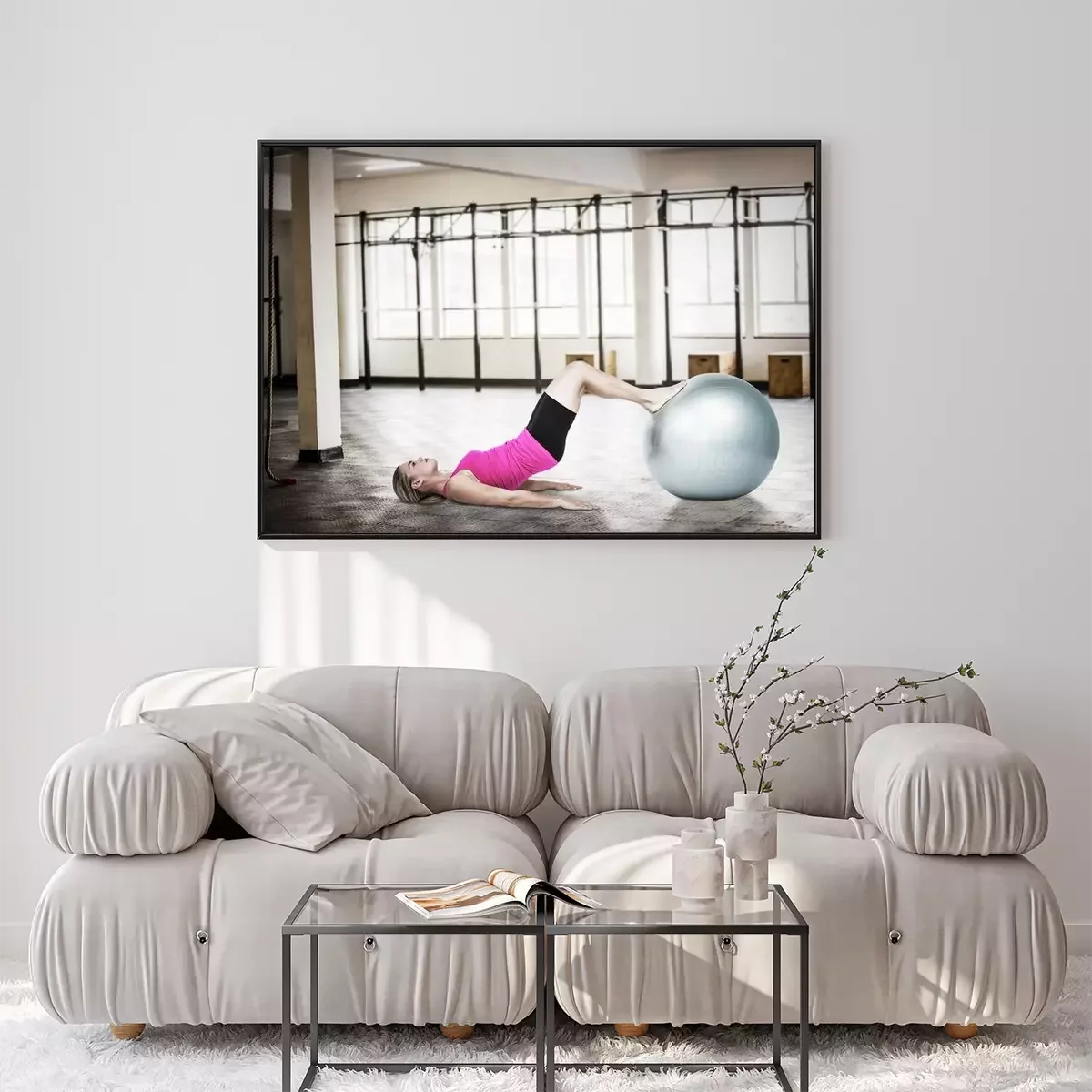Poster: Samengesteld beeld van zijaanzicht van de vrouw te oefenen met bal