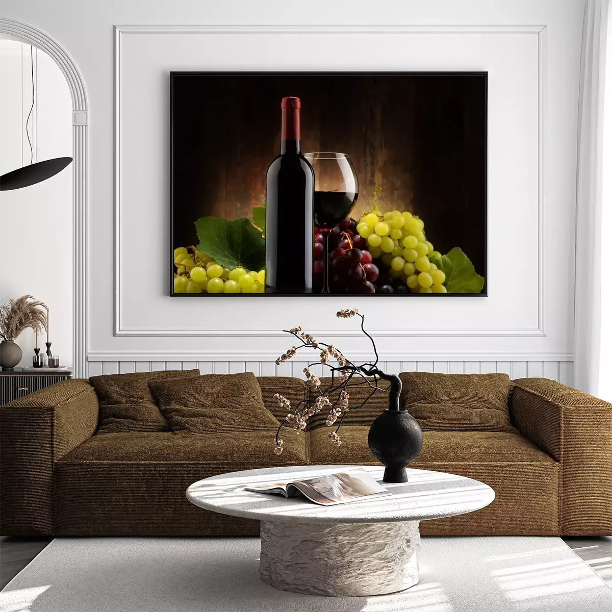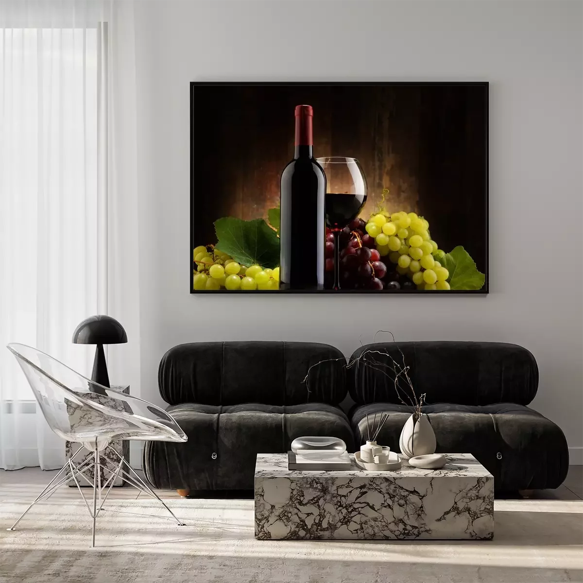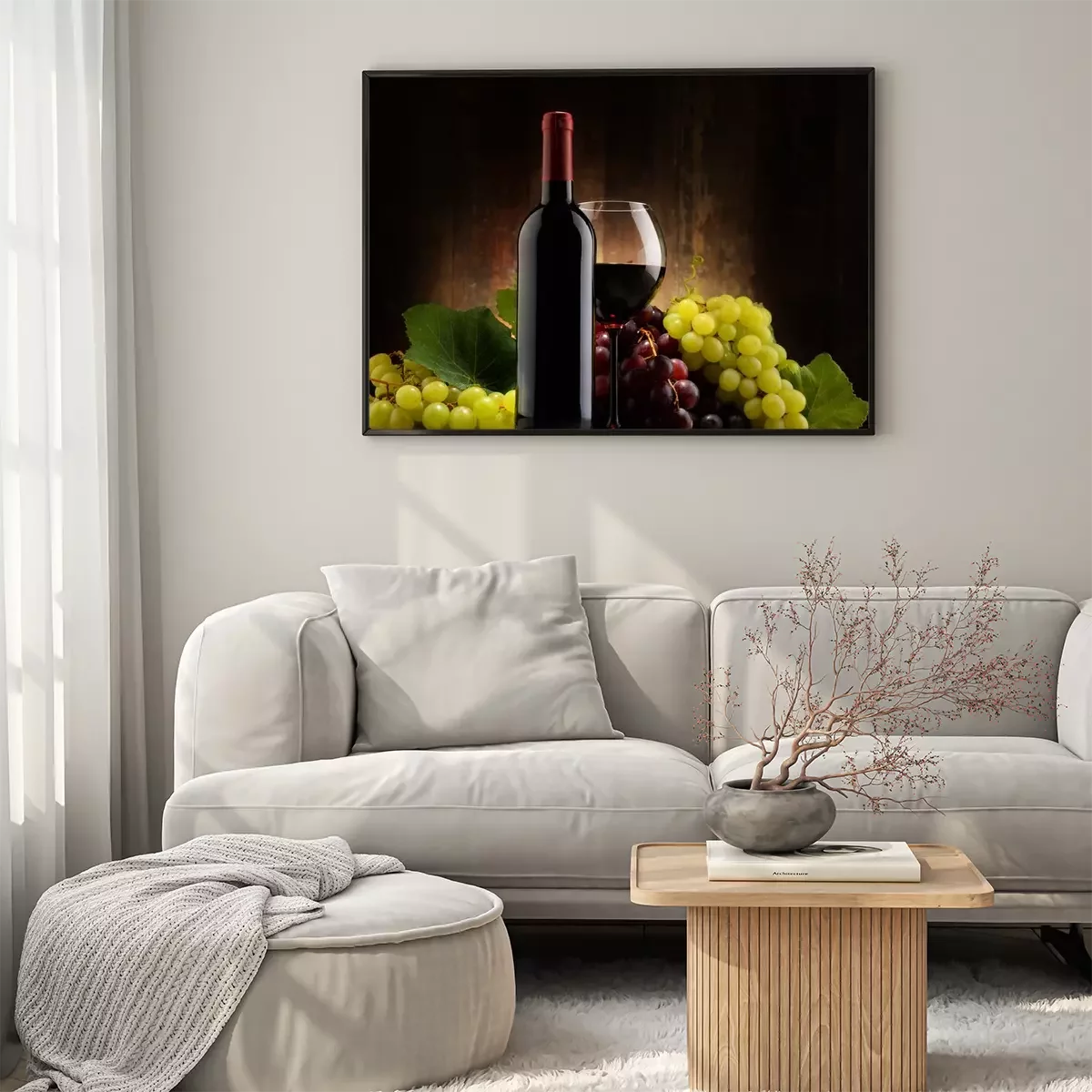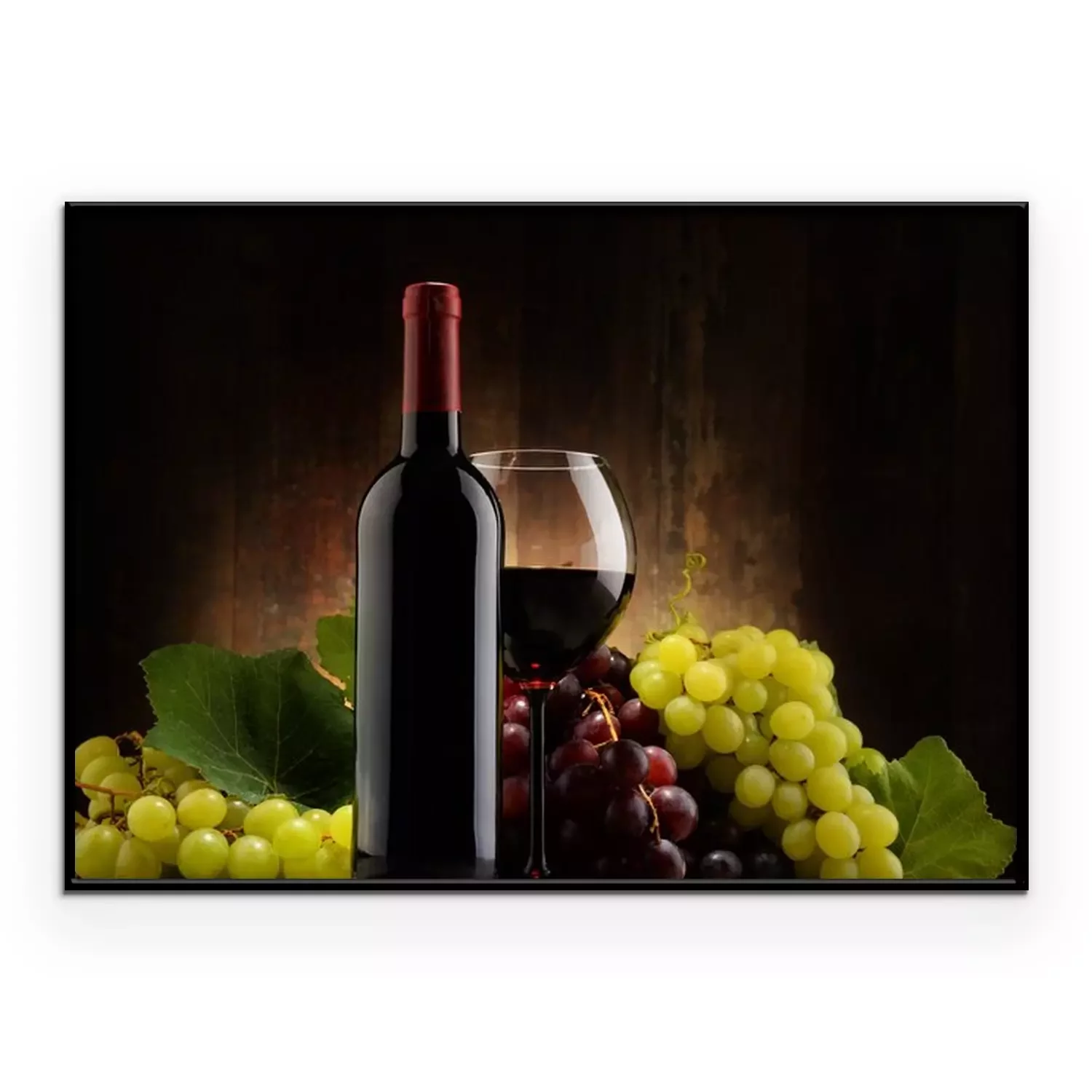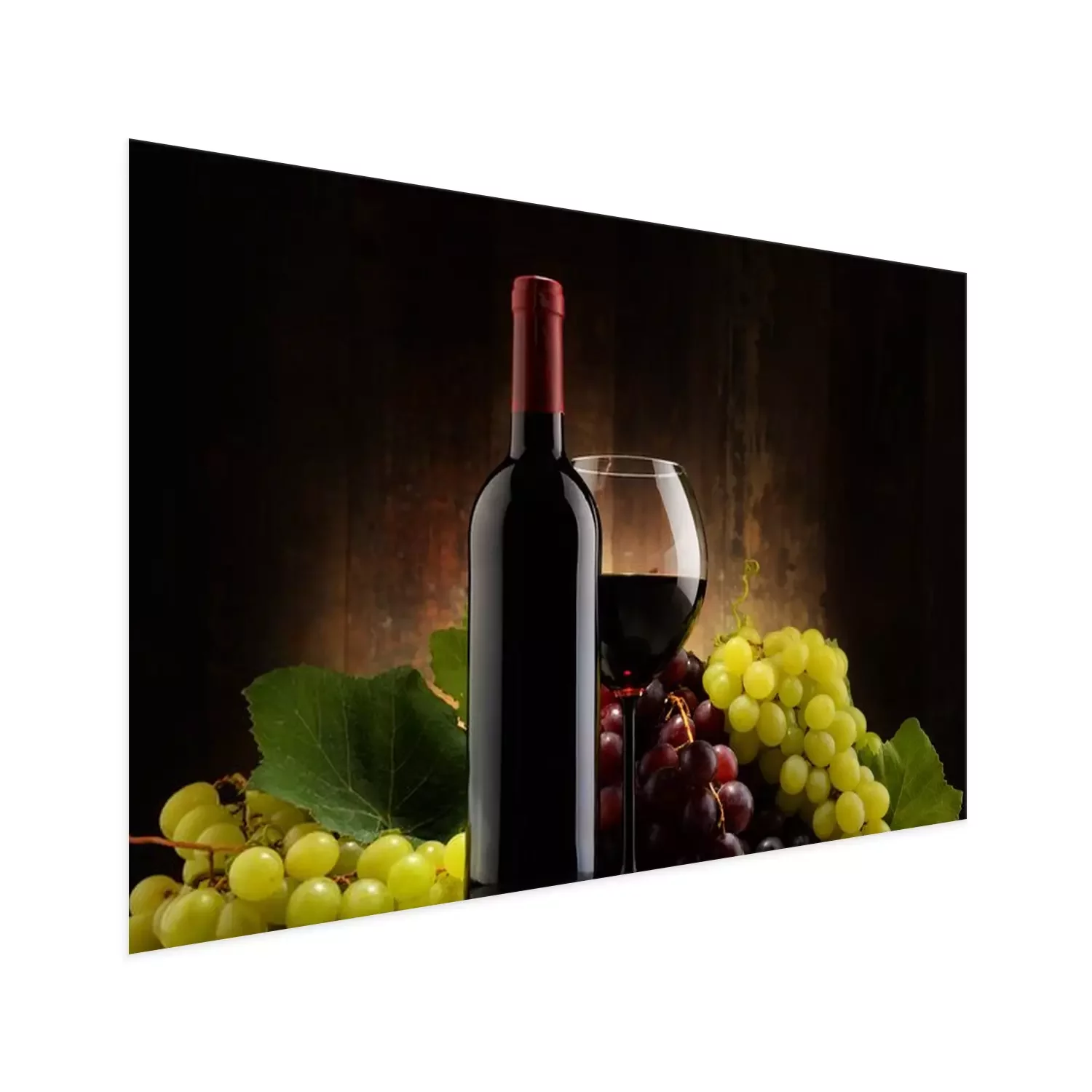 Poster: Samenstelling met glas, fles rode wijn en verse druiven