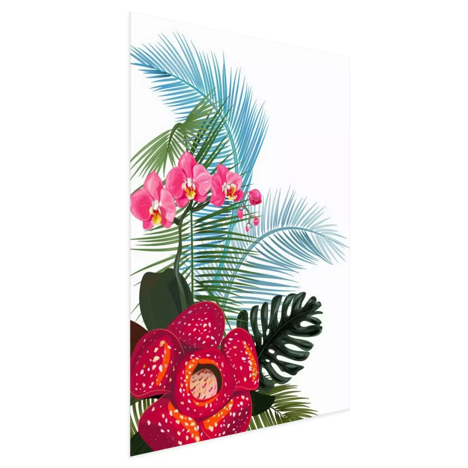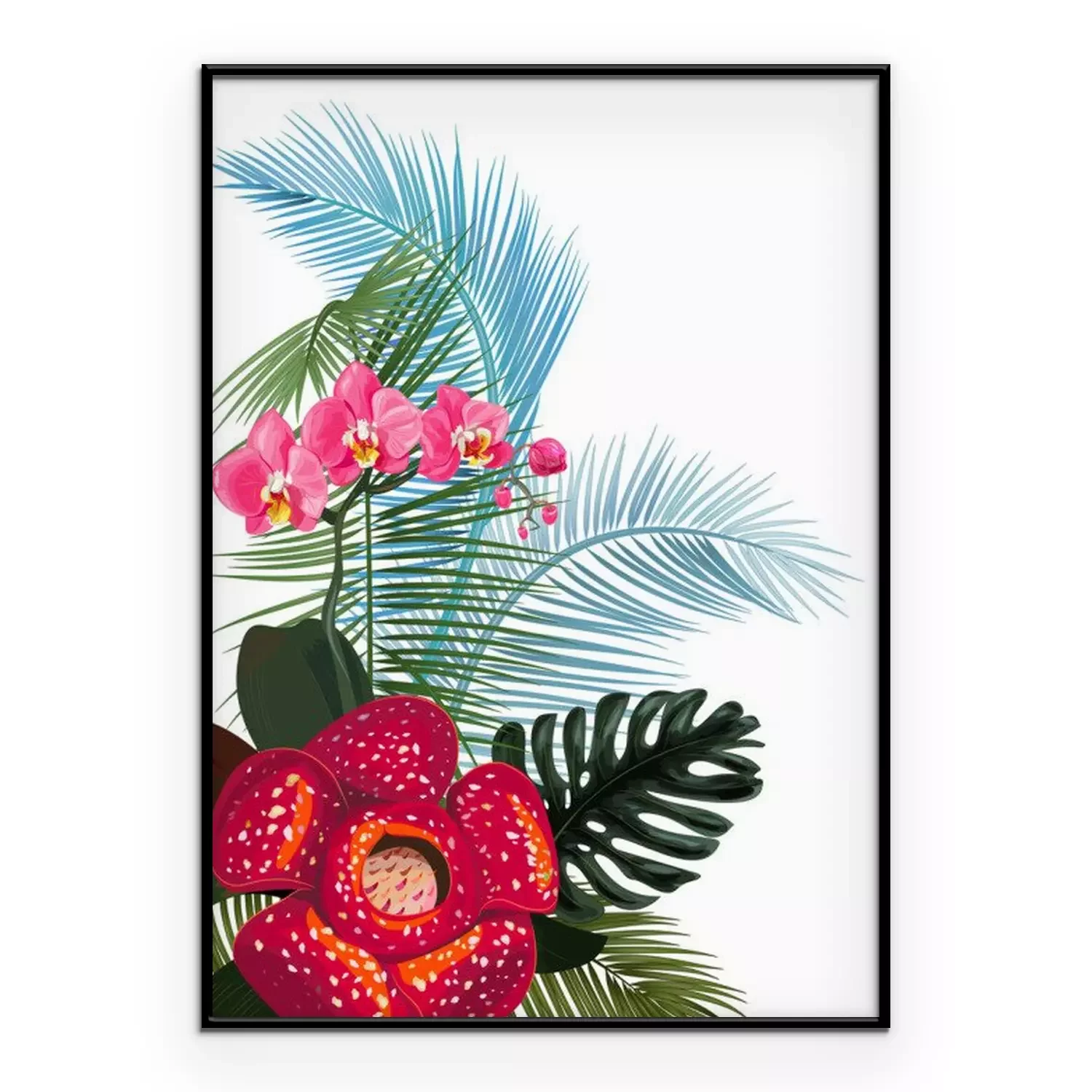 Poster: Samenstelling van exotische bloemen en bladeren van monstera en varens