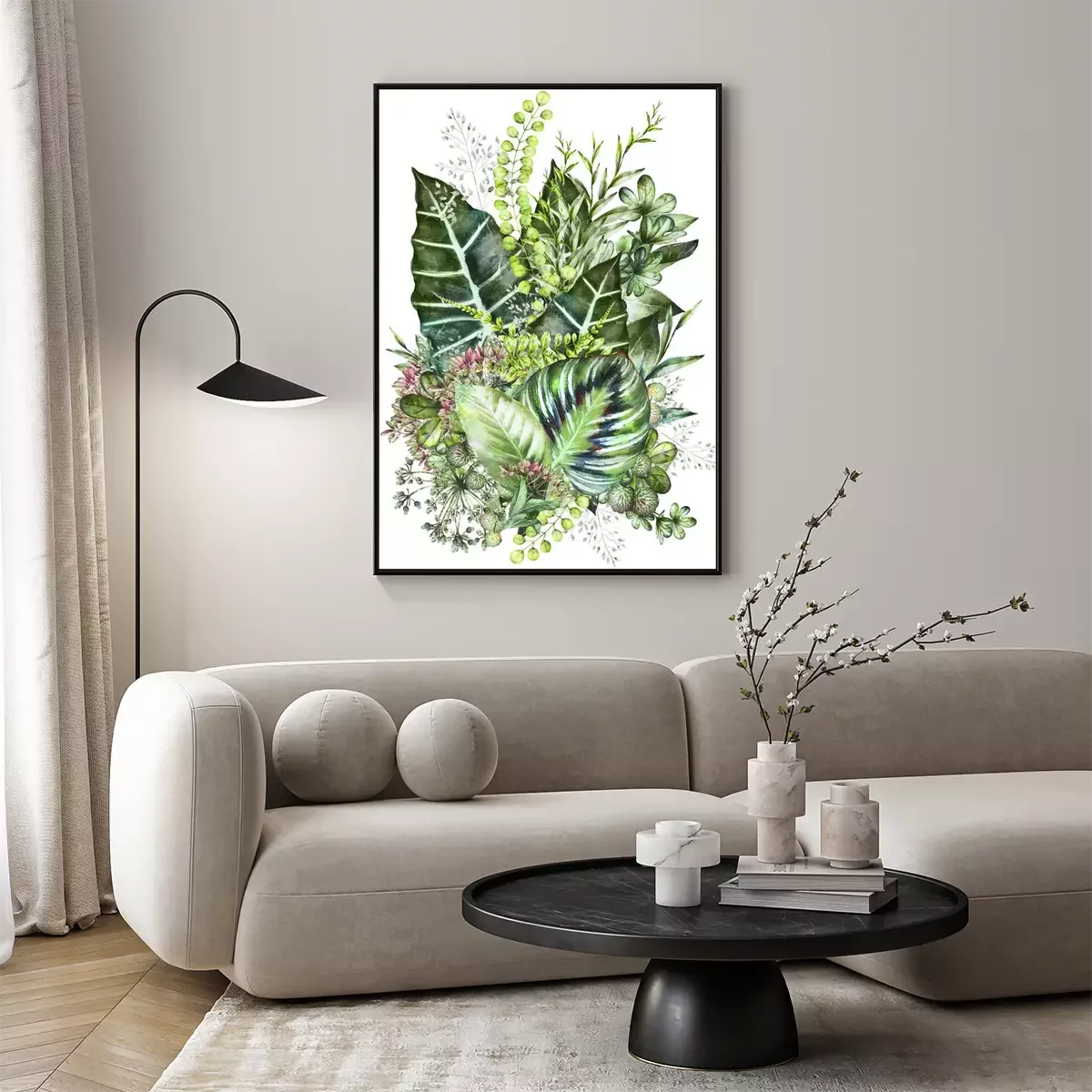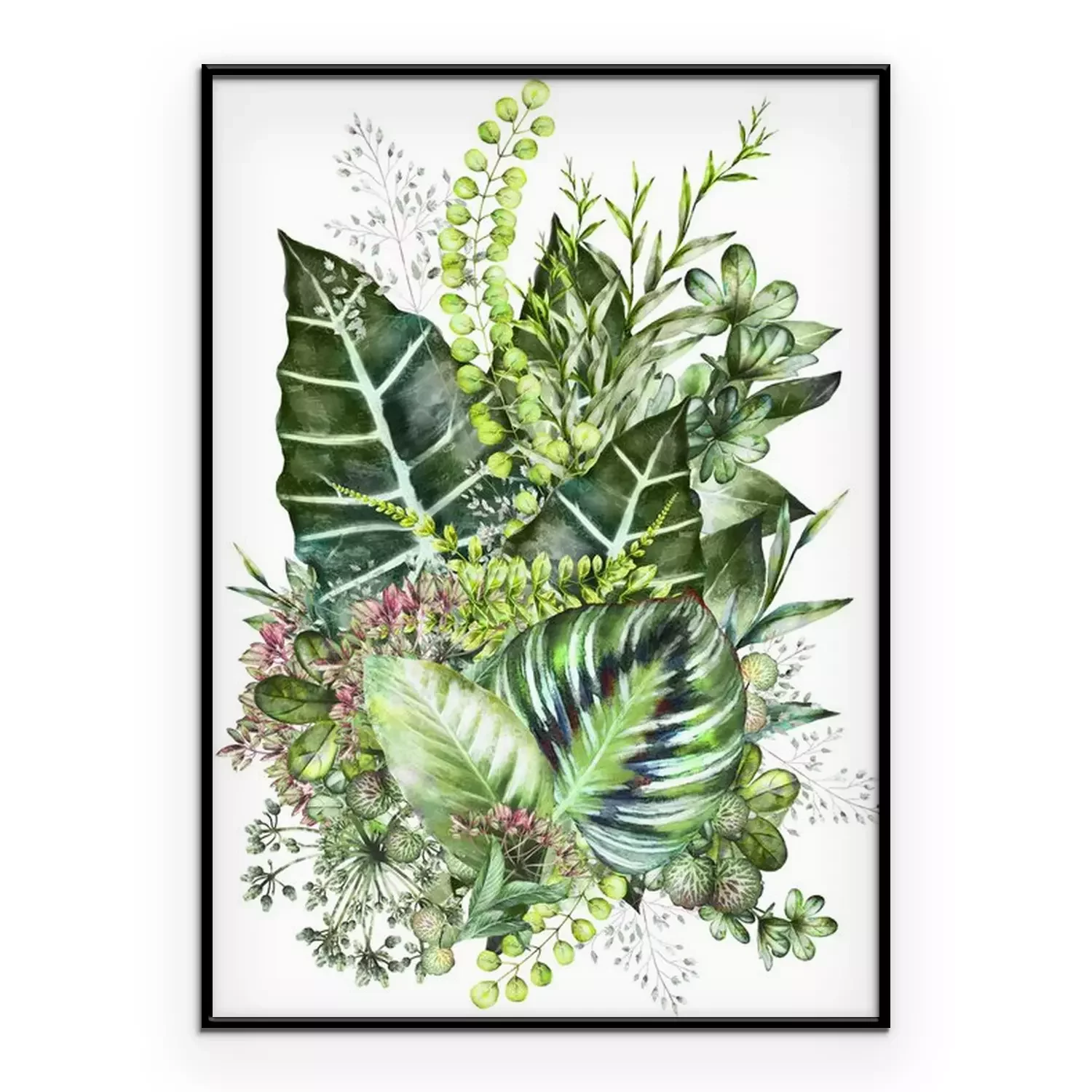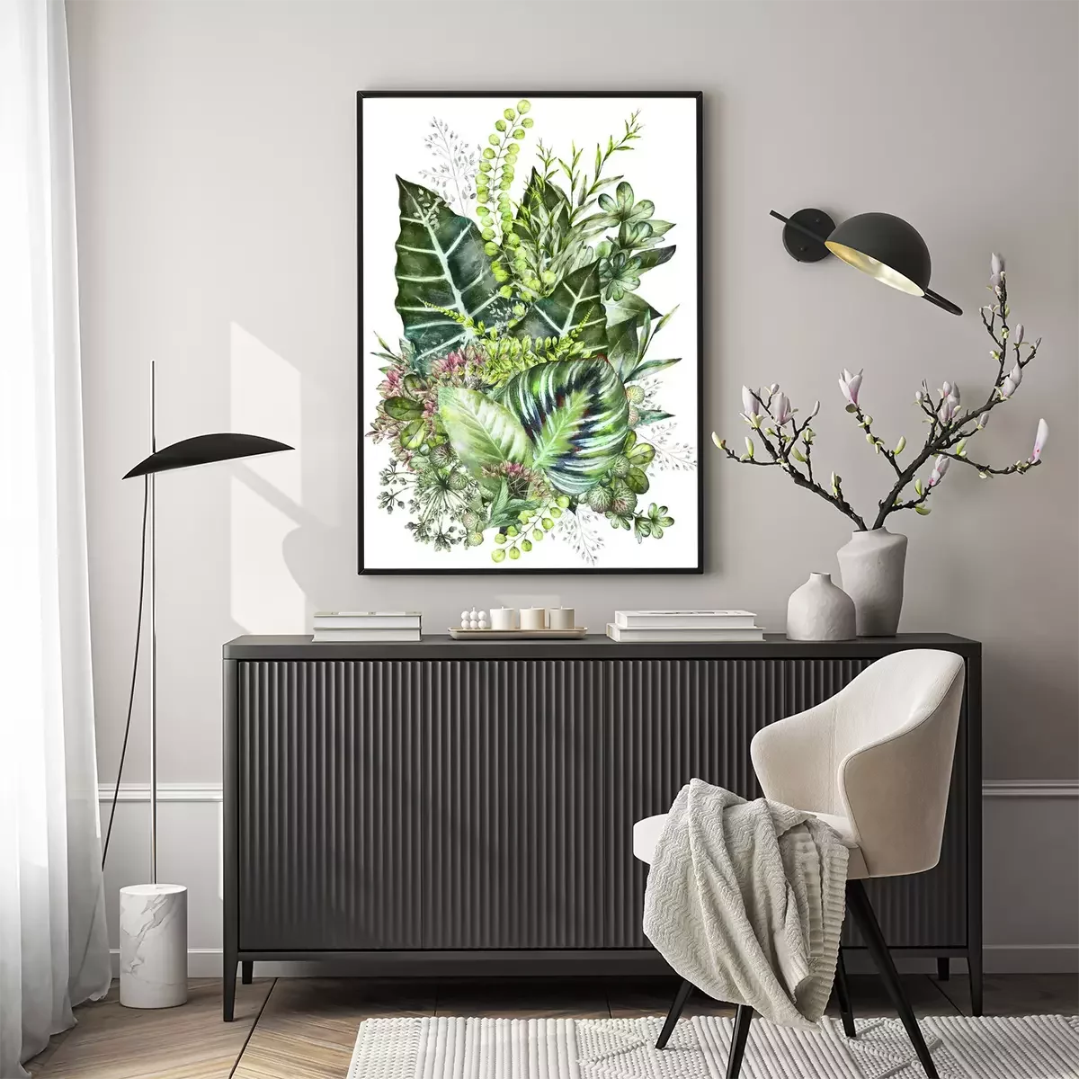 Wat denk je van een beproefde wanddecoratie die je gemakkelijk kunt aanpassen aan verschillende interieurs? Een goed idee is een Botanische poster bestaande uit een compositie van bladeren van verschillende tropische soorten. Dankzij de witte achtergrond oogt het ontwerp heel licht en fris. Dit maakt het mogelijk om deze decoratie zelfs in een zeer kleine kamer te gebruiken, omdat het de ruimte niet zal overbelasten. Daarom is een grootformaat poster een geweldige oplossing. Bladeren in een groot formaat zorgen ervoor dat het interieur groener oogt, en deze kleur staat bekend om zijn positieve effecten, wat dit niet alleen tot een esthetische, maar ook een functionele keuze maakt. Wat de aandacht trekt, is het schilderachtige karakter van deze poster. Tropische bladeren zijn in de stijl van een Botanische aquarel, wat het geheel een subtiele uitstraling geeft. Omdat natuurgeïnspireerde motieven tijdloos zijn, is dit een universeel decoratie-idee dat nooit uit de mode raakt. Daarnaast zal zo'n Botanische poster in veel verschillende ruimtes goed tot zijn recht komen. Het kan worden opgehangen in de woonkamer bij het koffietafelhoekje of boven een boekenplank, maar het zal ook prachtig staan in de slaapkamer boven het nachtkastje of in de hal boven een console. Deze decoratie brengt variatie in de ruimte, zonder zelfs een kleine kamer te overweldigen. Het is ook belangrijk om aandacht te besteden aan de lijst waarin de poster wordt geplaatst. Tropische bladeren op een delicate aquarel komen anders over, afhankelijk van het frame. In een kamer met veel houten meubels is een houten lijst in bijpassende kleur een geweldige optie. Maar als de kamer modern en minimalistisch is ingericht, kan een zwart aluminium model een betere keuze zijn. Als je niet zeker weet of een wanddecoratie met plantenmotief in je woning past, is het een goed idee om kamerplanten of bloemstukken in de kamer te plaatsen. Grote planten zoals palmen of monstera's, of artistieke arrangementen in vazen met enkele takken, zoals gedroogde eucalyptus, zullen perfect passen bij deze poster. Bladeren worden het leidmotief van de gedecoreerde kamer.
