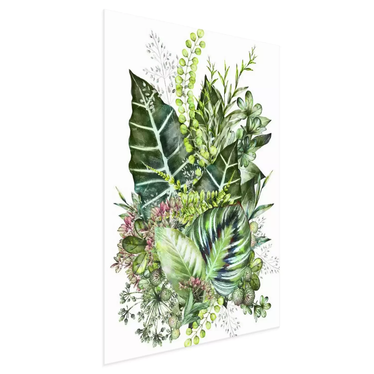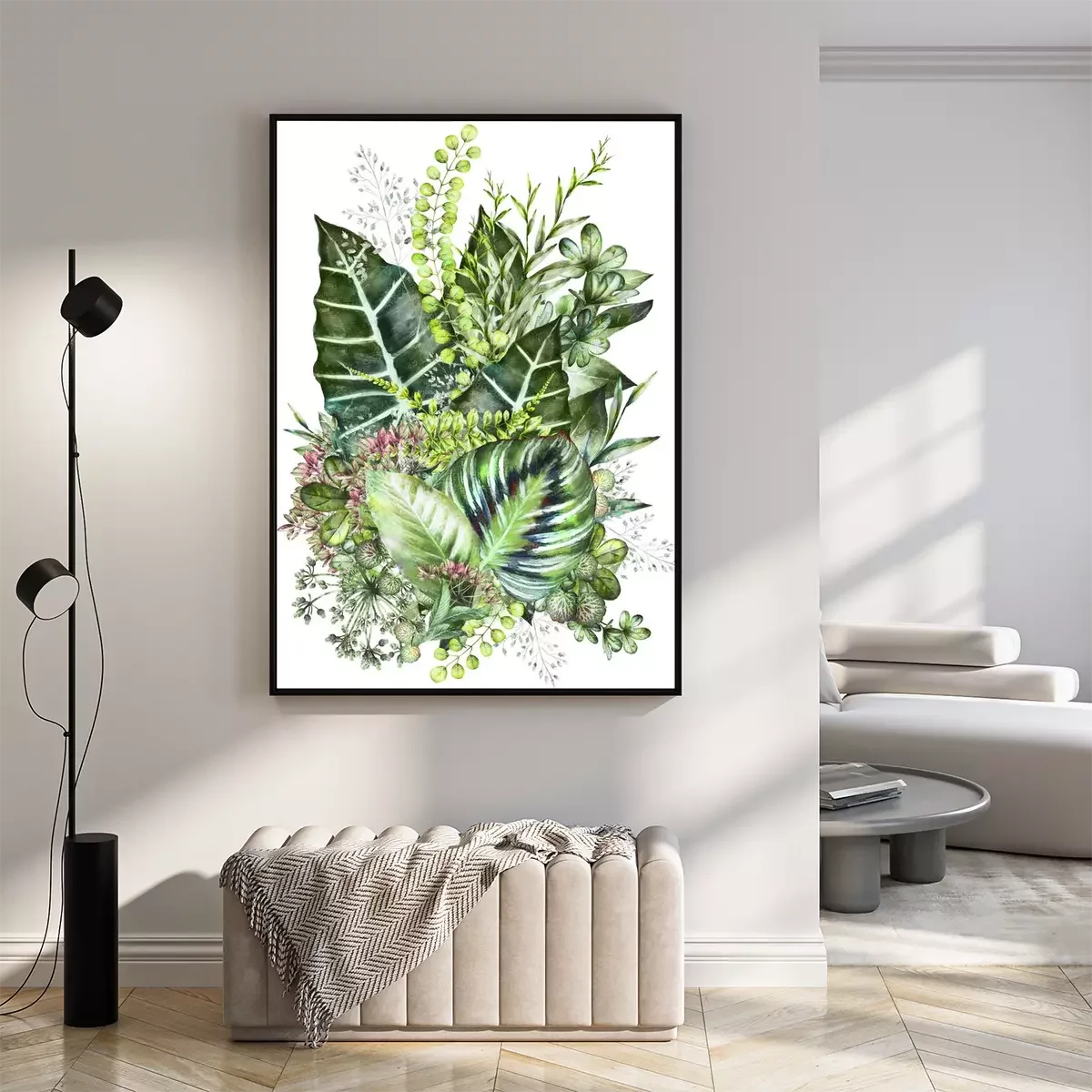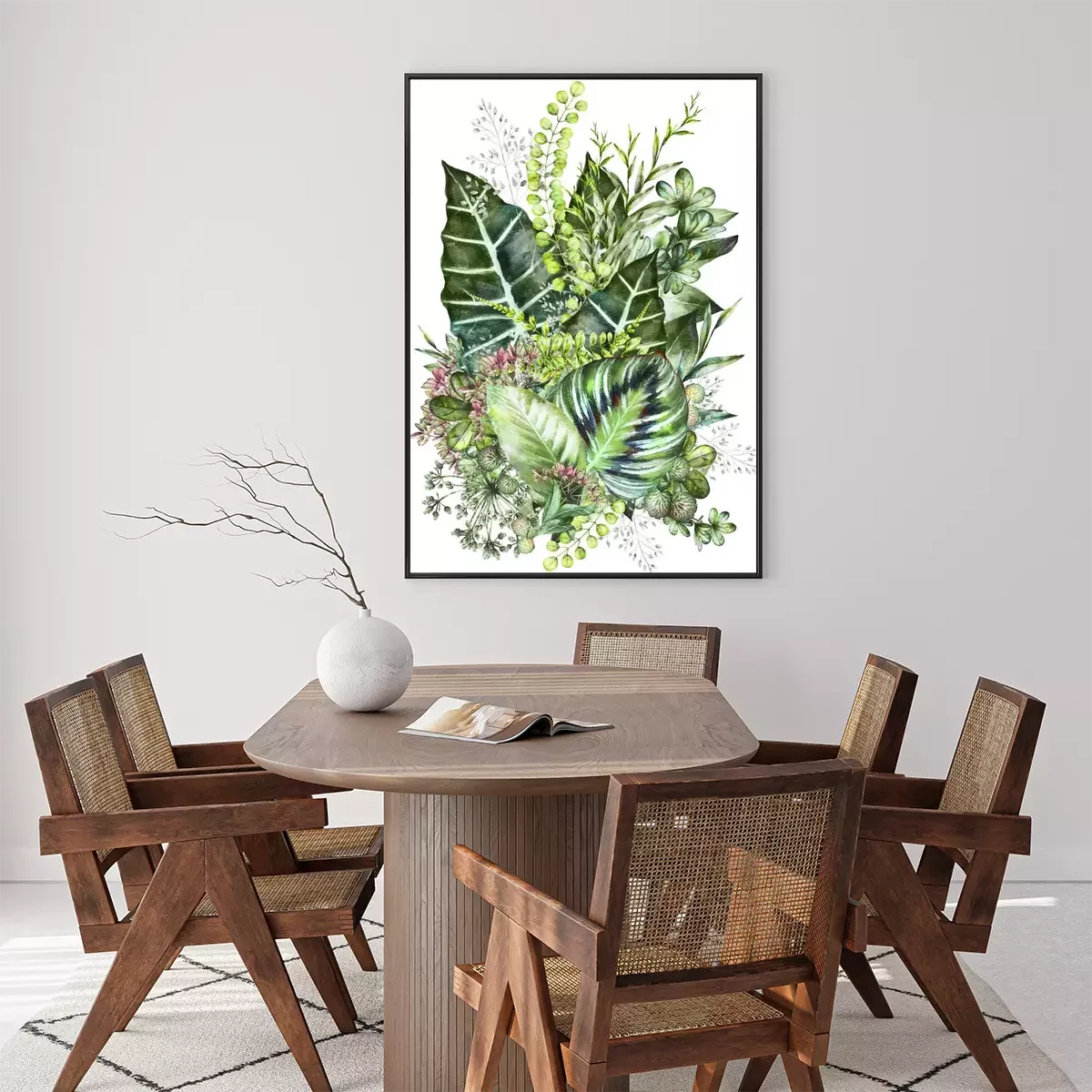 Wat denk je van een beproefde wanddecoratie die je gemakkelijk kunt aanpassen aan verschillende interieurs? Een goed idee is een Botanische poster bestaande uit een compositie van bladeren van verschillende tropische soorten. Dankzij de witte achtergrond oogt het ontwerp heel licht en fris. Dit maakt het mogelijk om deze decoratie zelfs in een zeer kleine kamer te gebruiken, omdat het de ruimte niet zal overbelasten. Daarom is een grootformaat poster een geweldige oplossing. Bladeren in een groot formaat zorgen ervoor dat het interieur groener oogt, en deze kleur staat bekend om zijn positieve effecten, wat dit niet alleen tot een esthetische, maar ook een functionele keuze maakt. Wat de aandacht trekt, is het schilderachtige karakter van deze poster. Tropische bladeren zijn in de stijl van een Botanische aquarel, wat het geheel een subtiele uitstraling geeft. Omdat natuurgeïnspireerde motieven tijdloos zijn, is dit een universeel decoratie-idee dat nooit uit de mode raakt. Daarnaast zal zo'n Botanische poster in veel verschillende ruimtes goed tot zijn recht komen. Het kan worden opgehangen in de woonkamer bij het koffietafelhoekje of boven een boekenplank, maar het zal ook prachtig staan in de slaapkamer boven het nachtkastje of in de hal boven een console. Deze decoratie brengt variatie in de ruimte, zonder zelfs een kleine kamer te overweldigen. Het is ook belangrijk om aandacht te besteden aan de lijst waarin de poster wordt geplaatst. Tropische bladeren op een delicate aquarel komen anders over, afhankelijk van het frame. In een kamer met veel houten meubels is een houten lijst in bijpassende kleur een geweldige optie. Maar als de kamer modern en minimalistisch is ingericht, kan een zwart aluminium model een betere keuze zijn. Als je niet zeker weet of een wanddecoratie met plantenmotief in je woning past, is het een goed idee om kamerplanten of bloemstukken in de kamer te plaatsen. Grote planten zoals palmen of monstera's, of artistieke arrangementen in vazen met enkele takken, zoals gedroogde eucalyptus, zullen perfect passen bij deze poster. Bladeren worden het leidmotief van de gedecoreerde kamer.