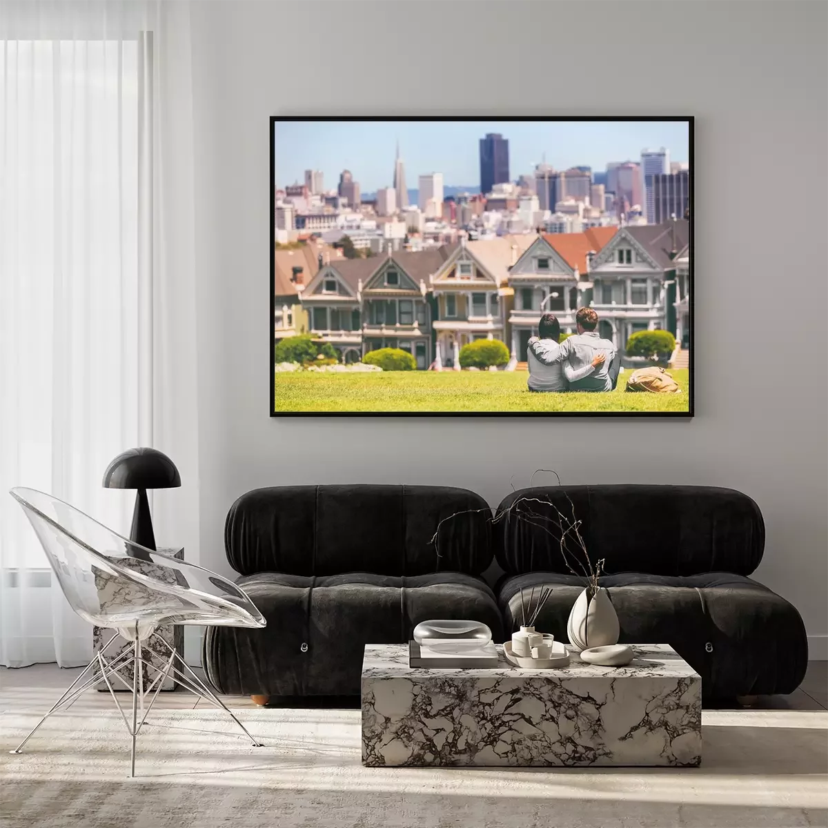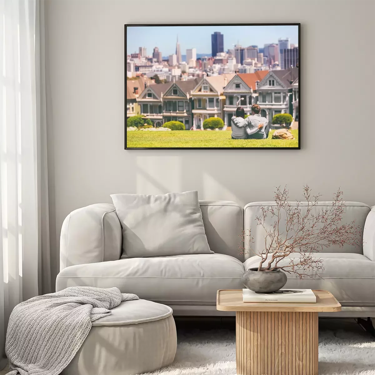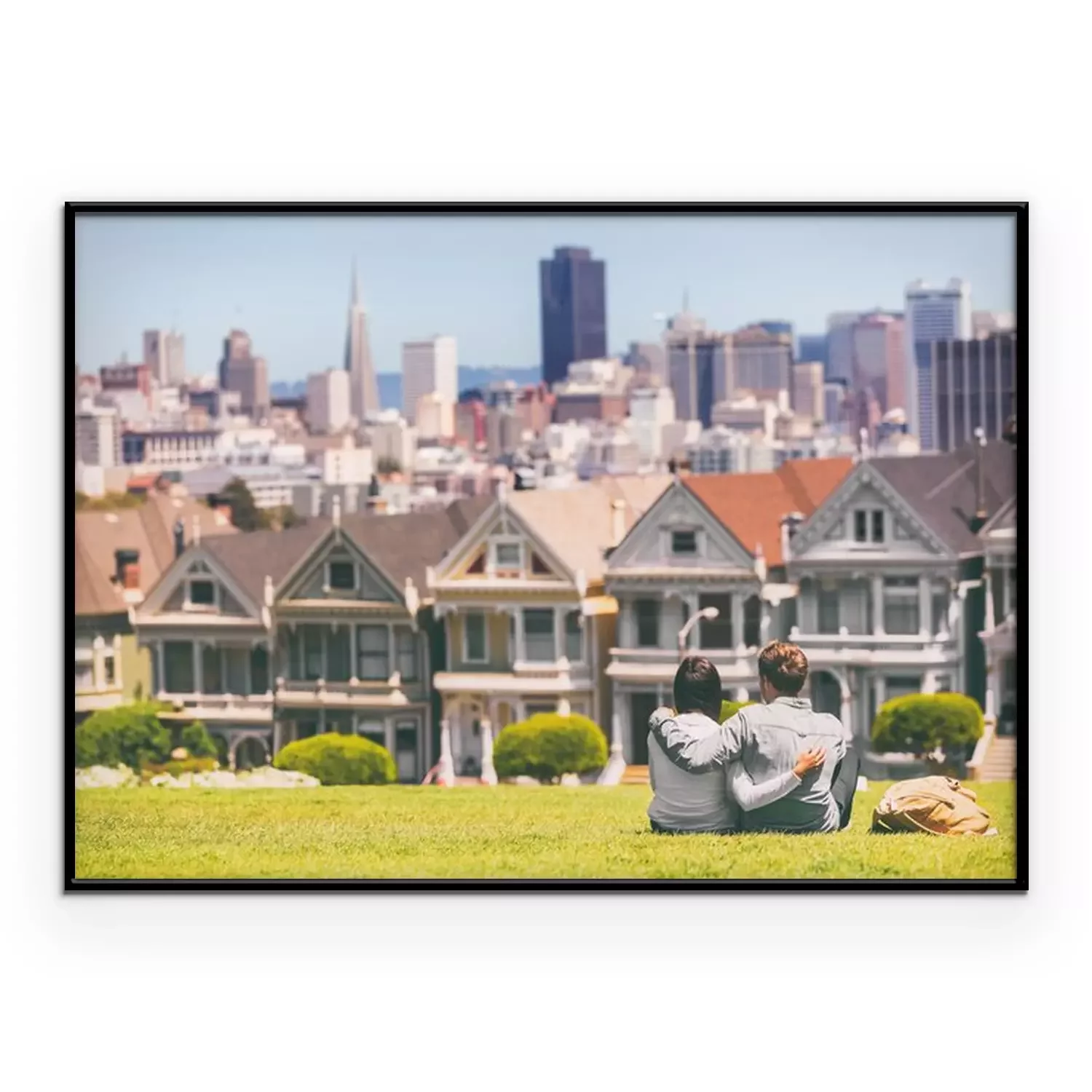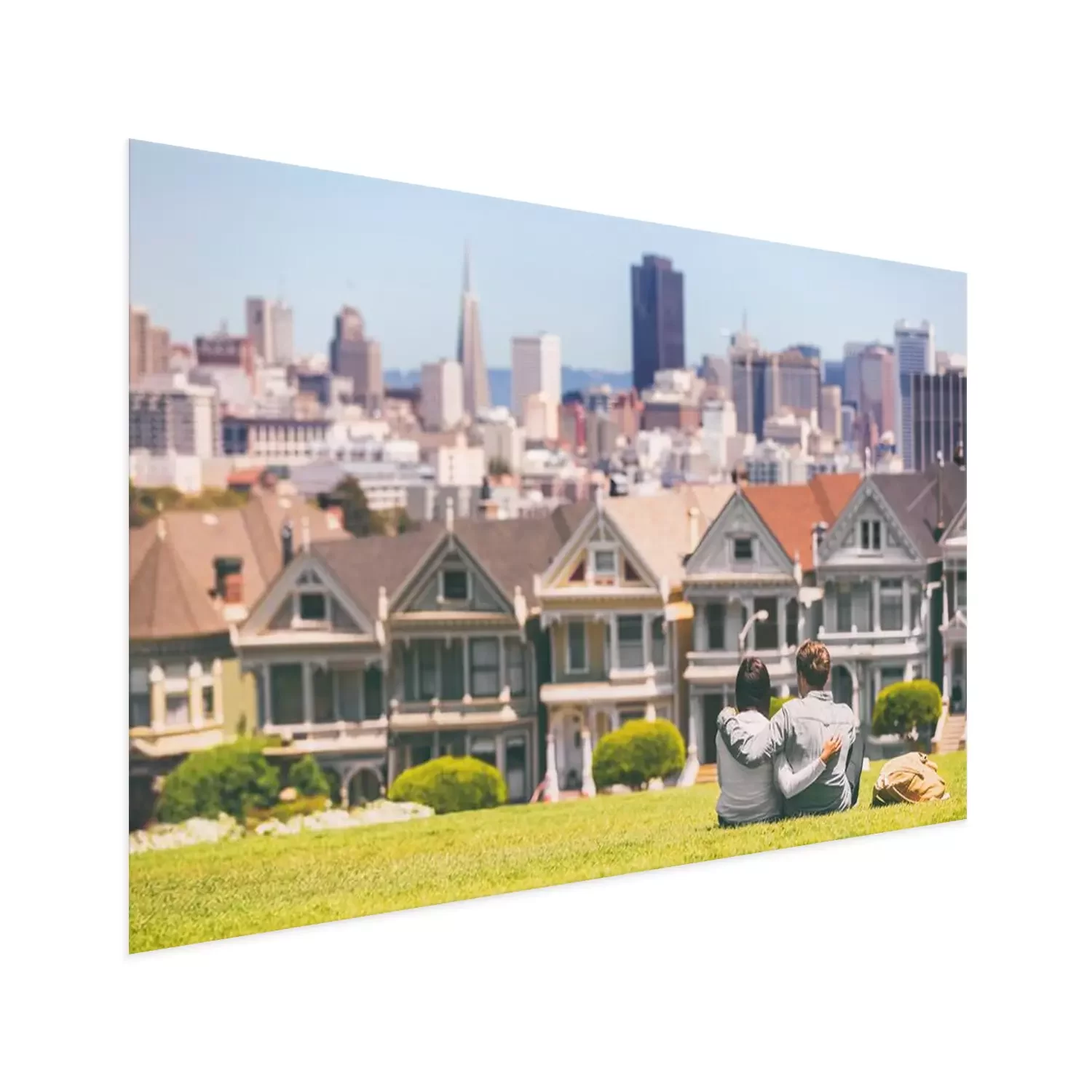 Poster: San Francisco - Alamo Square-mensen. De paartoeristen die in Alamo-Park door de Geschilderde Dames ontspannen huisvest iconisch landschap, de Zeven Zusters, San Francisco, Californië, de VS