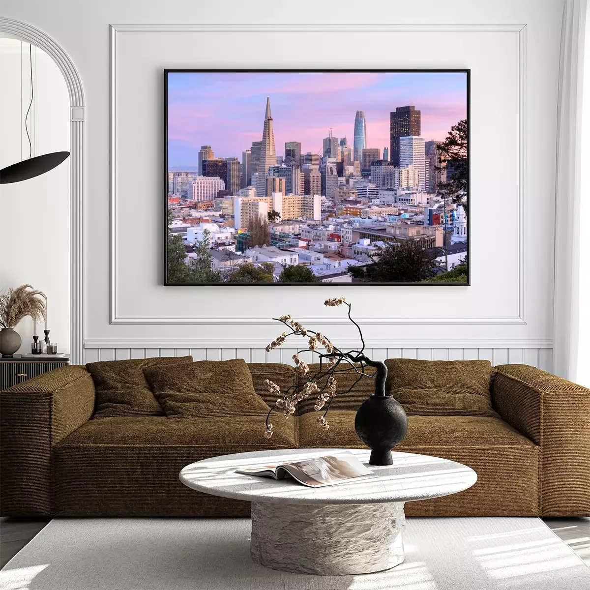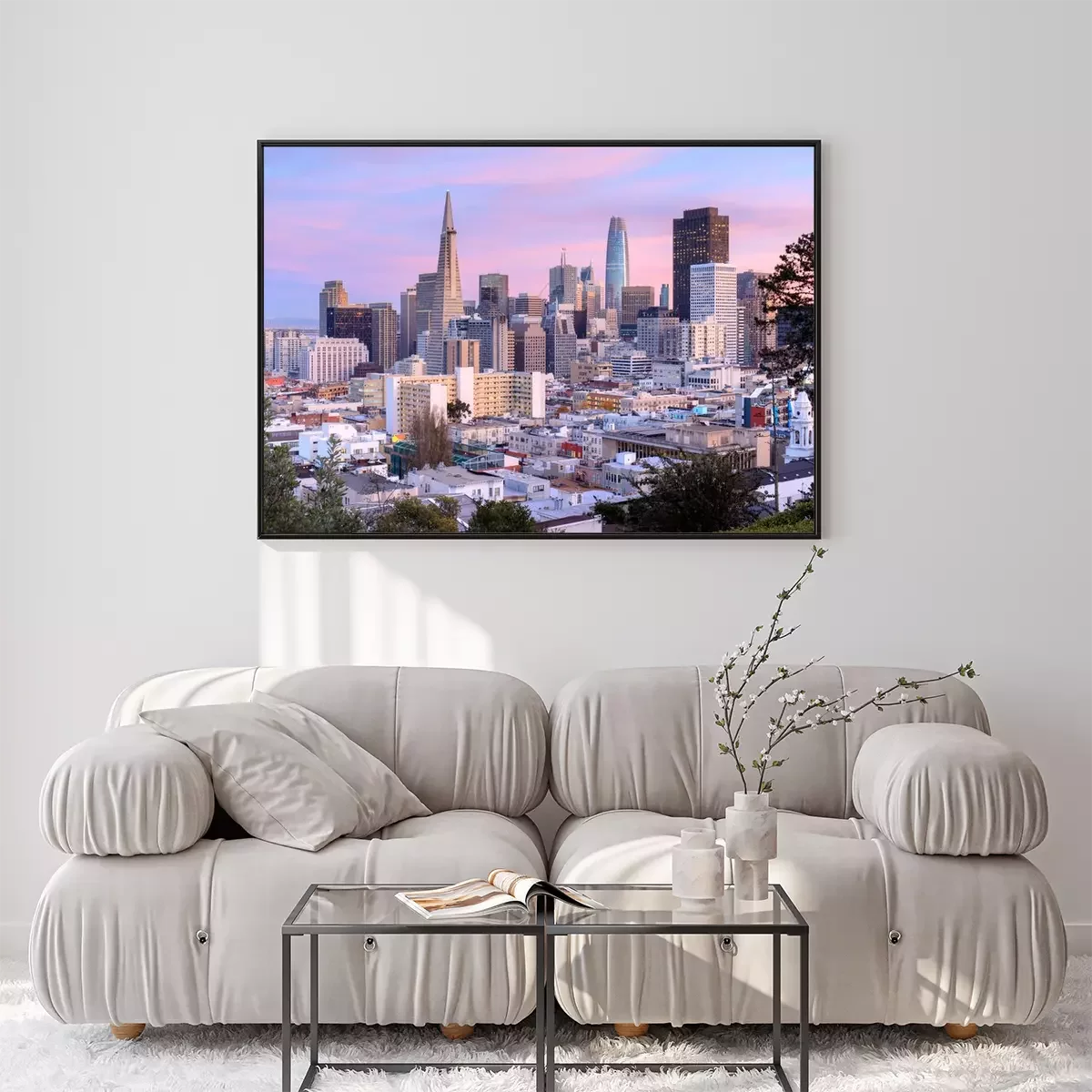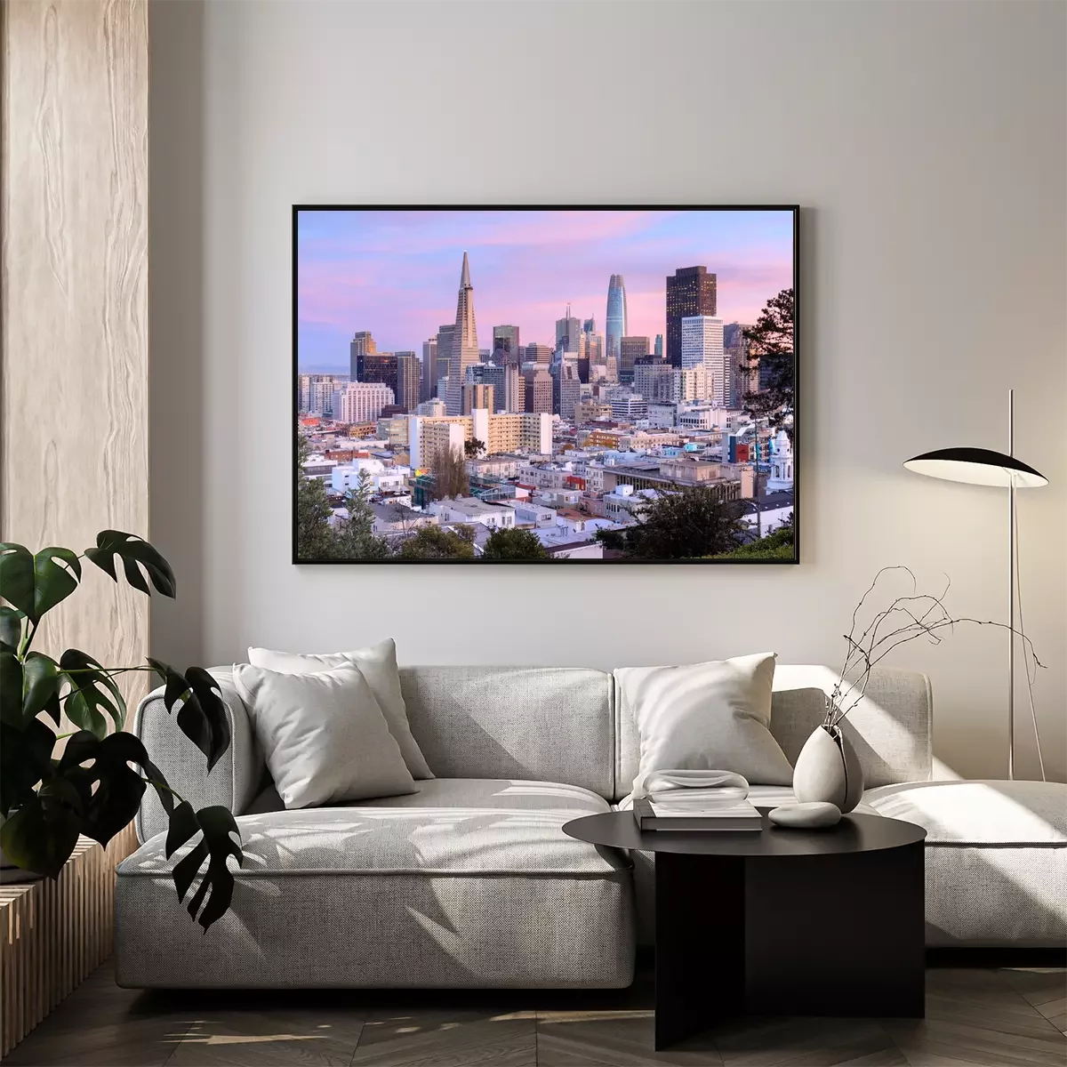 Poster San Francisco Skyline in roze en blauwe luchten. Ina Coolbrith Park, San Francisco, Californië, VS.
