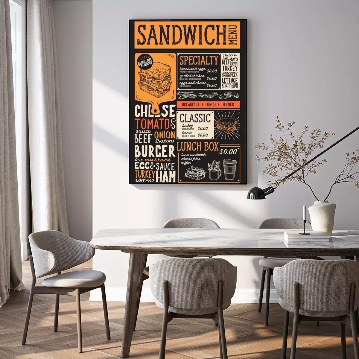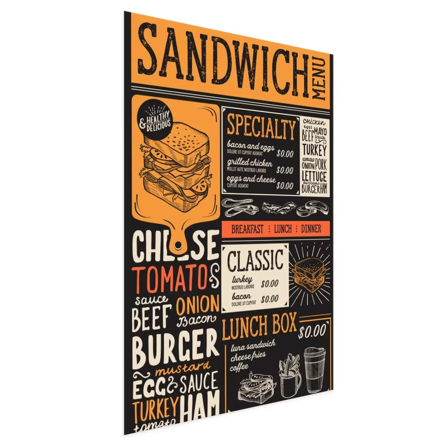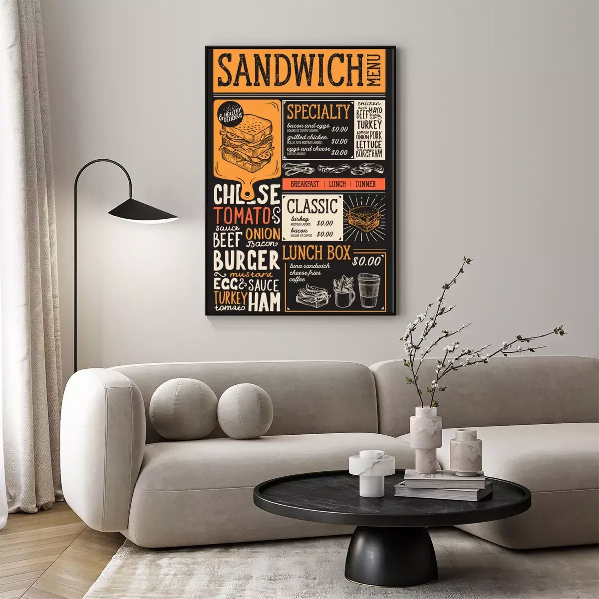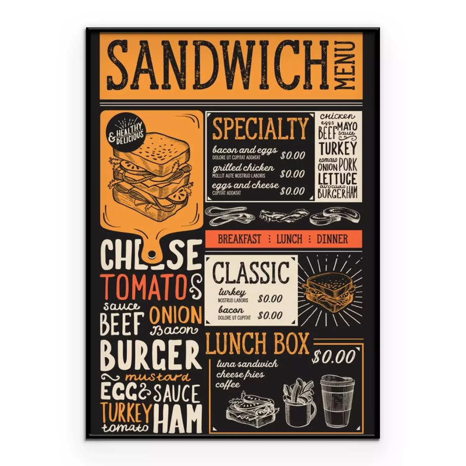 Poster Sandwich restaurant menu. Vector food flyer for bar and cafe. Design template with vintage hand-drawn illustrations.