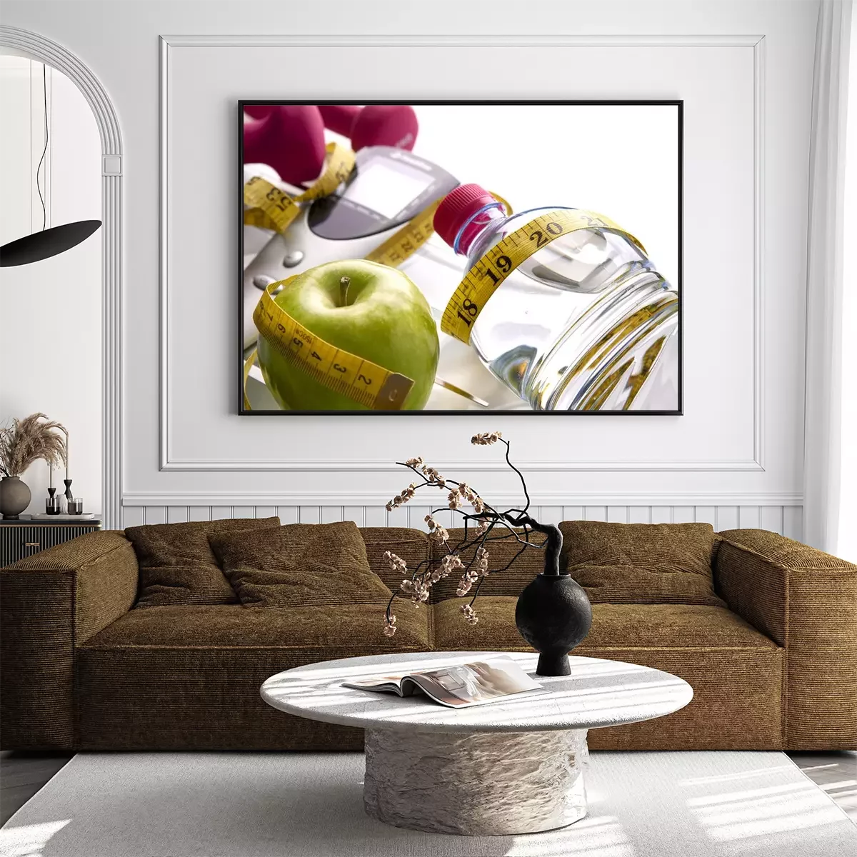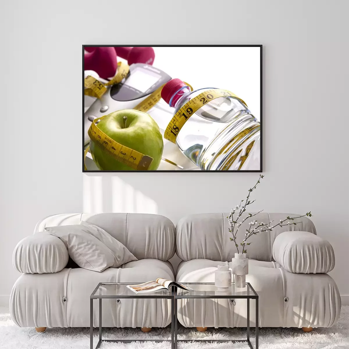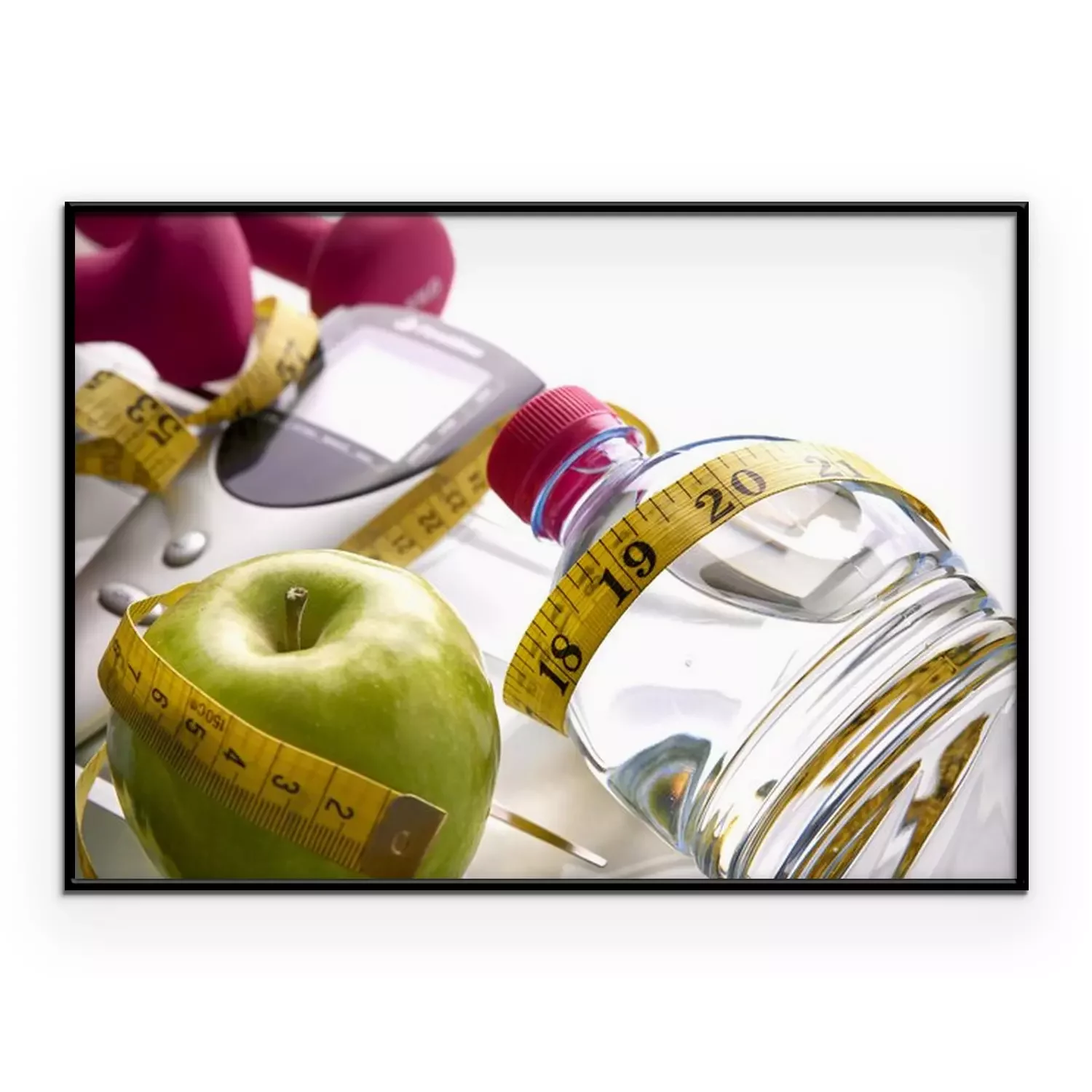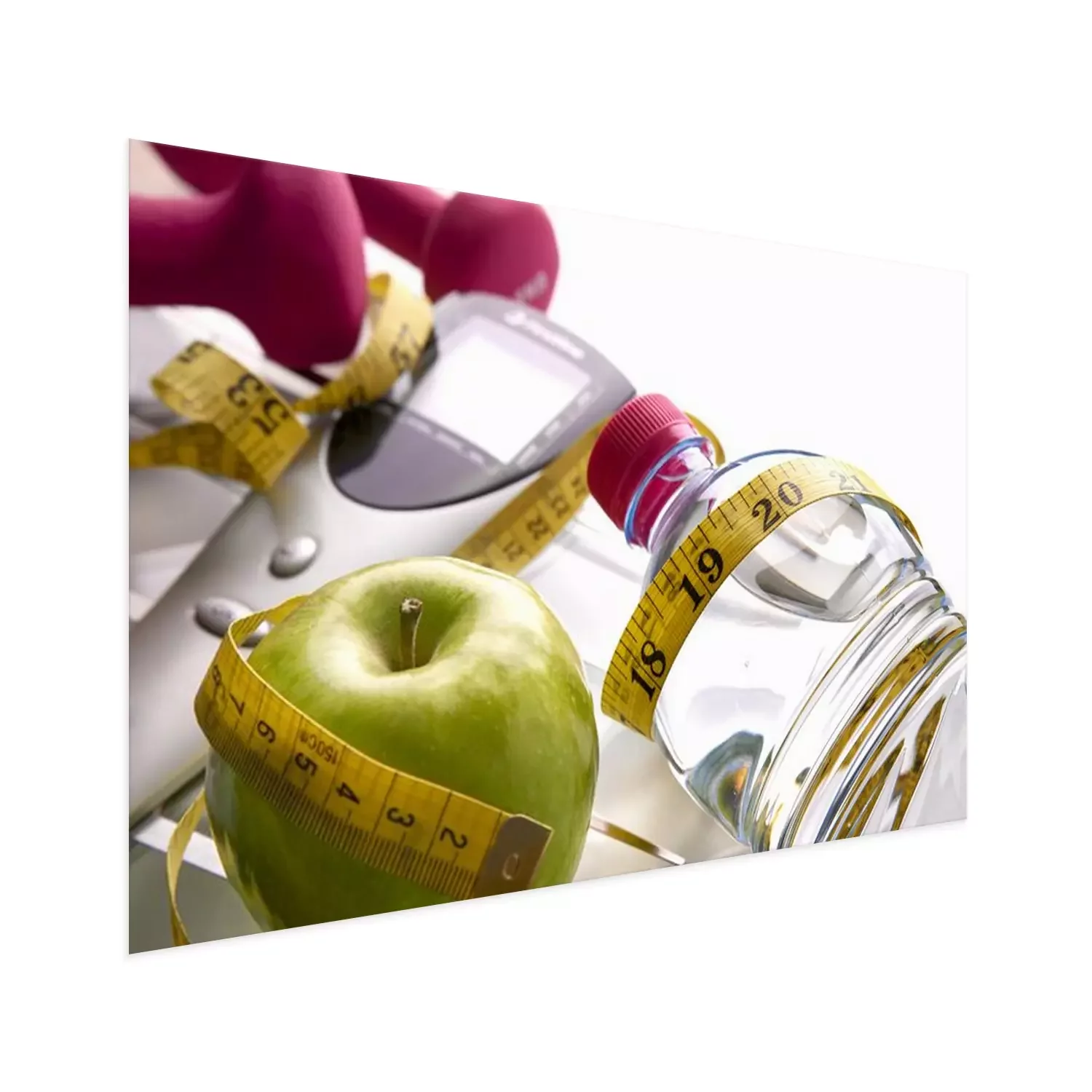 Poster: Schaal met halters fles appel en meetlint verhoogde weergave
