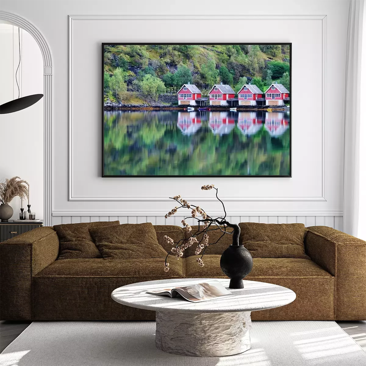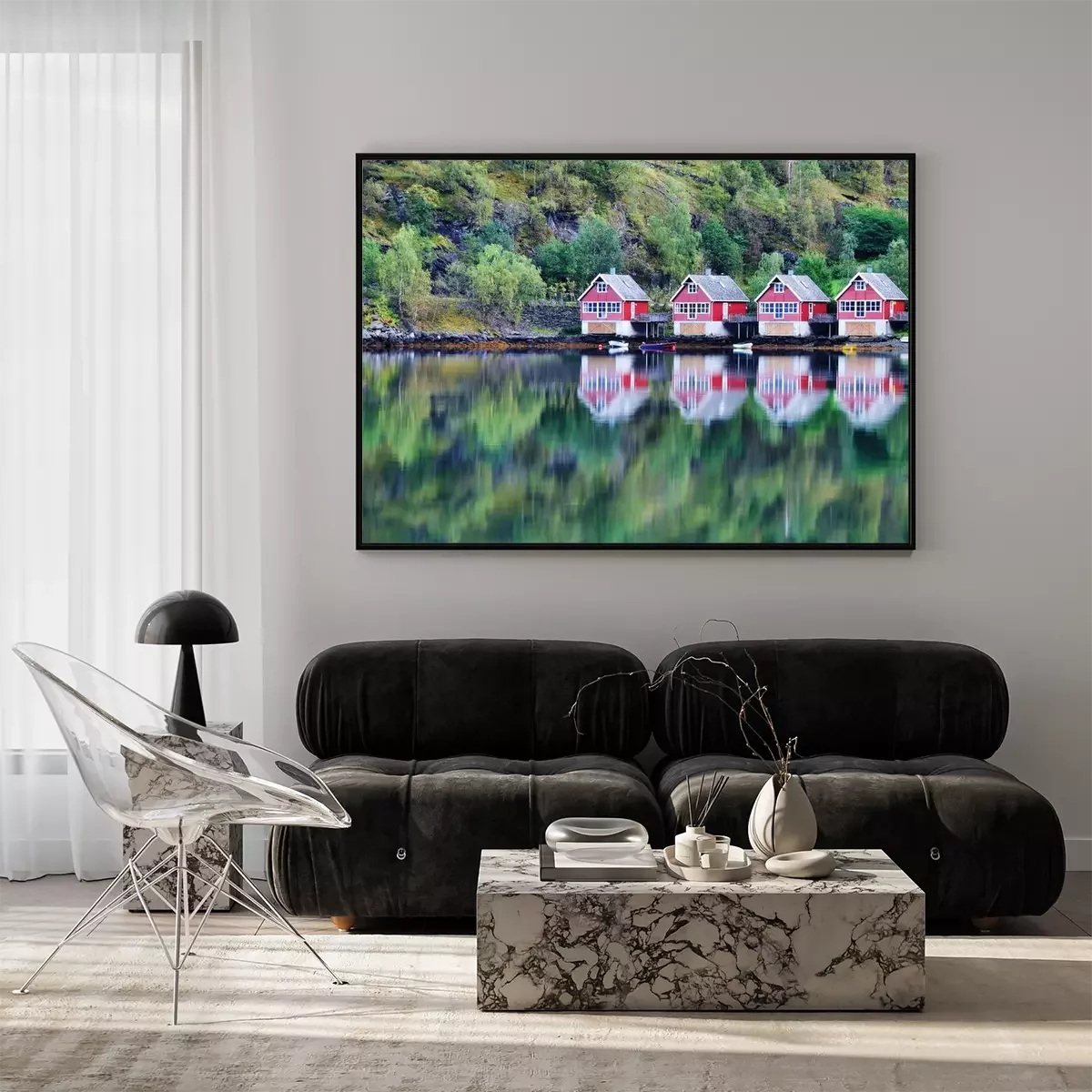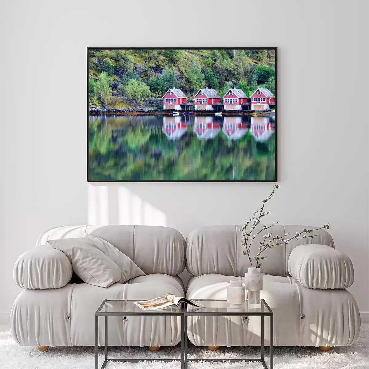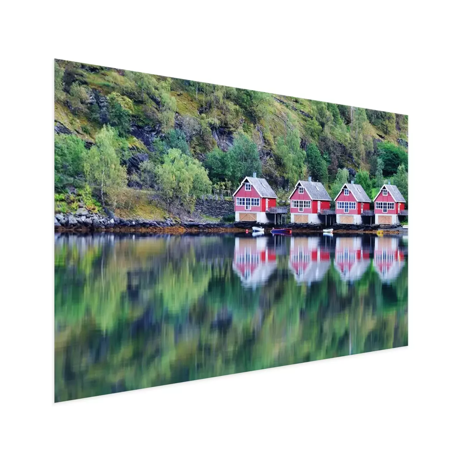 Poster Schilderachtig uitzicht op het meer en de visserij hutten in Flam, Noorwegen