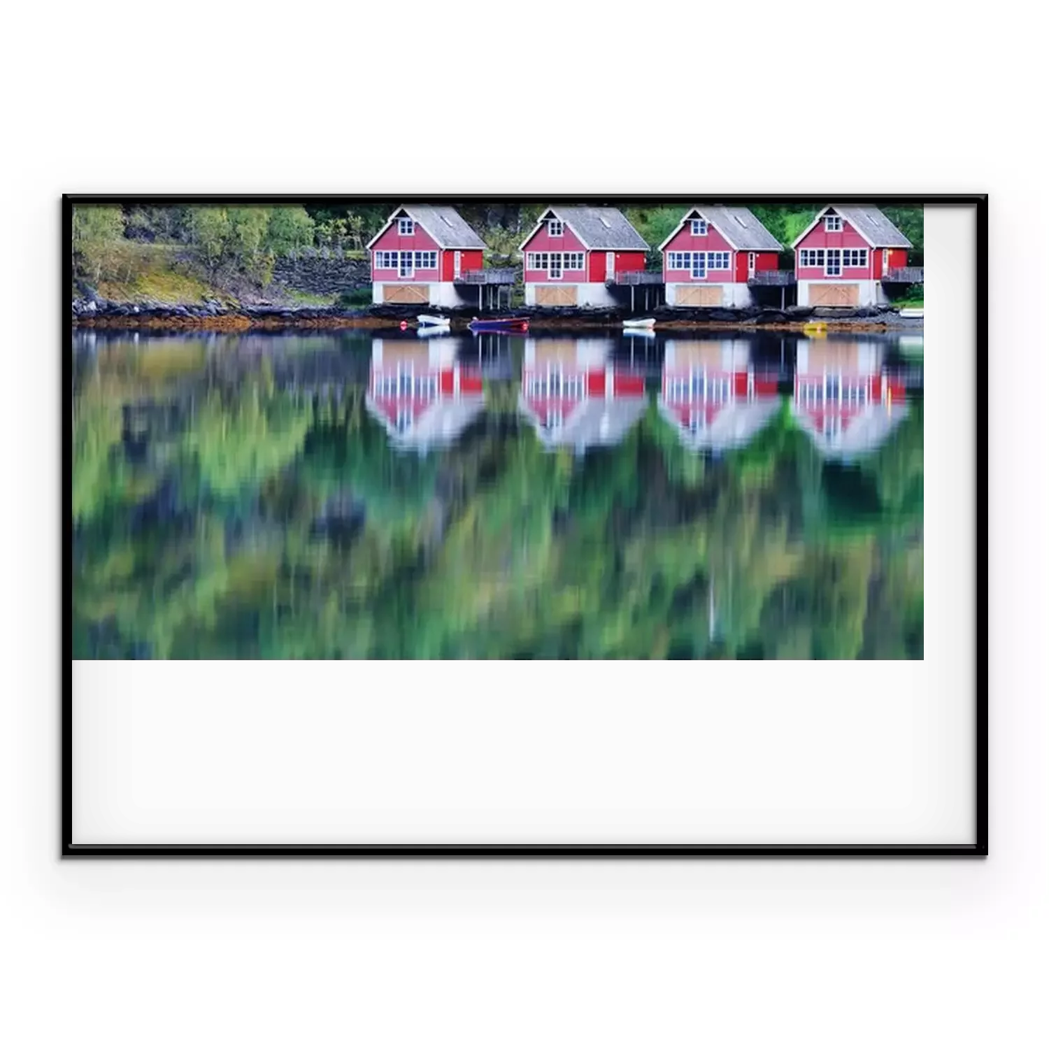 Poster: Schilderachtig uitzicht op het meer en de visserij hutten in Flam, Noorwegen