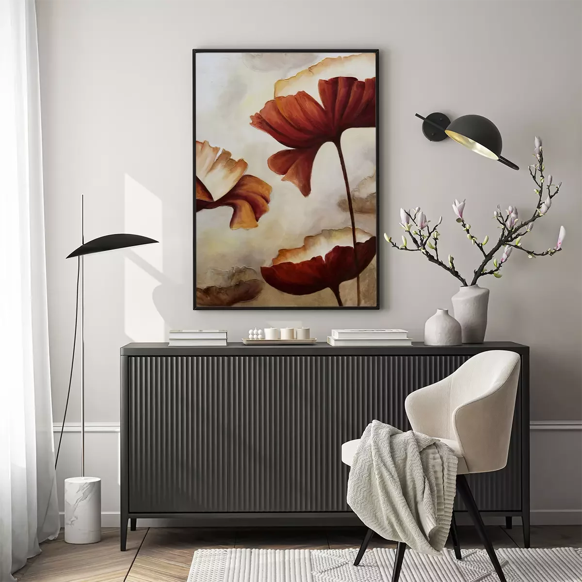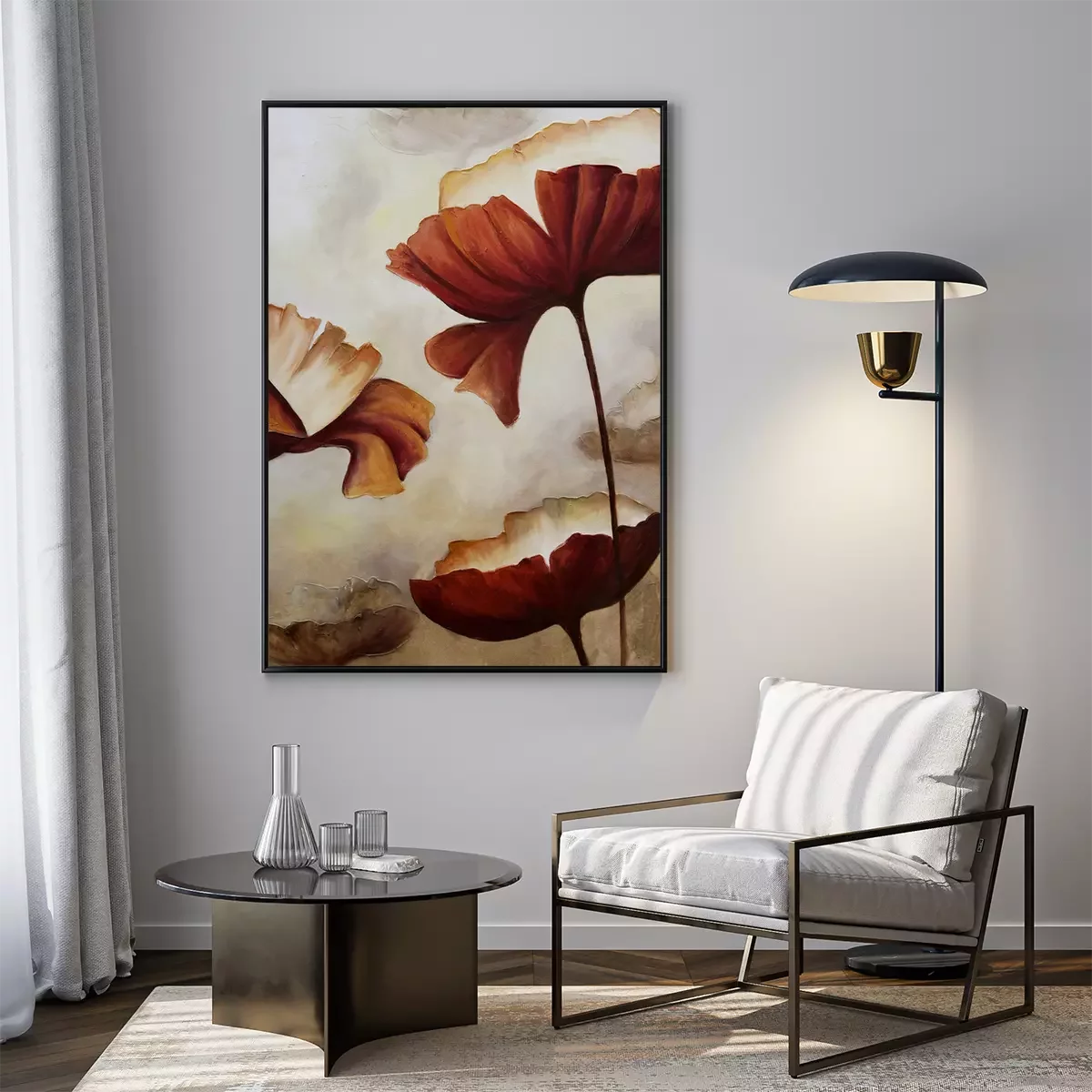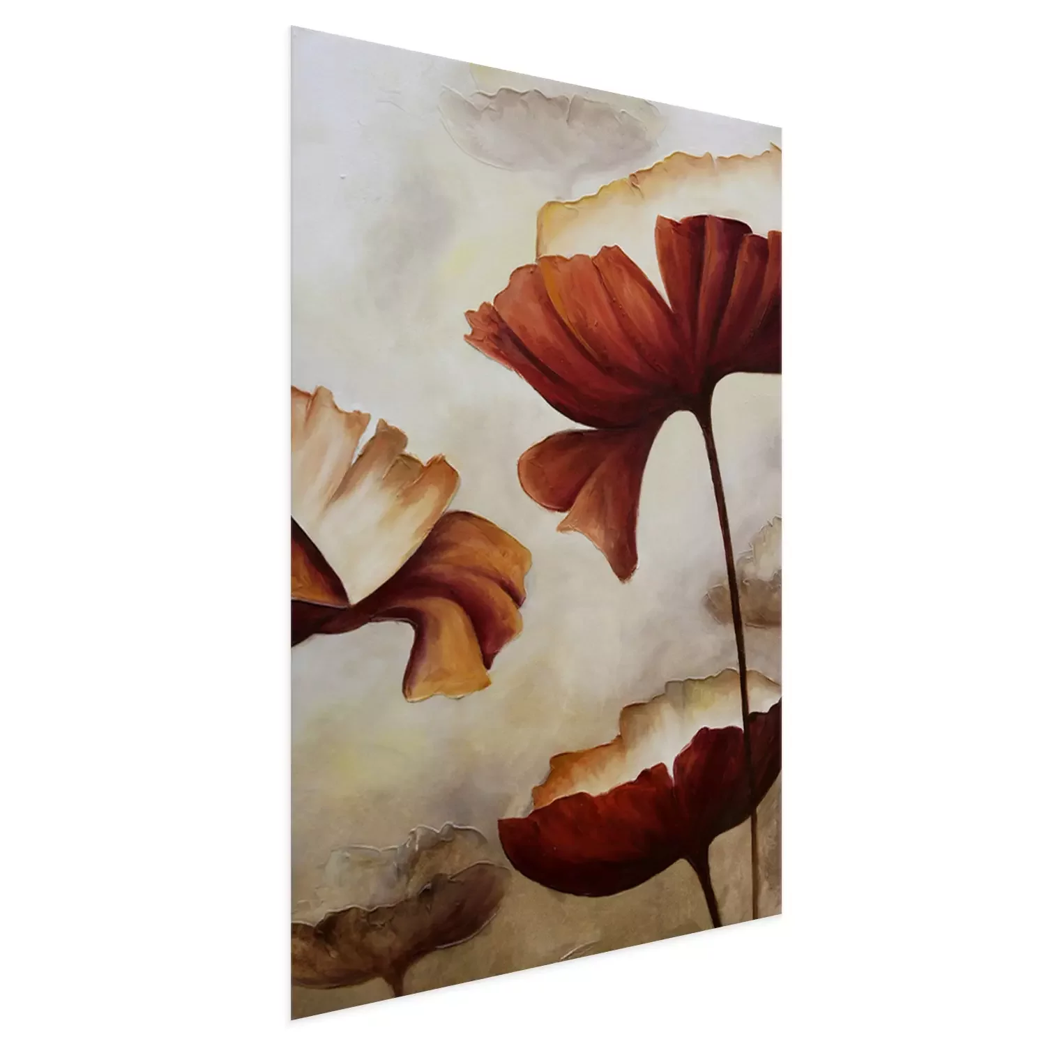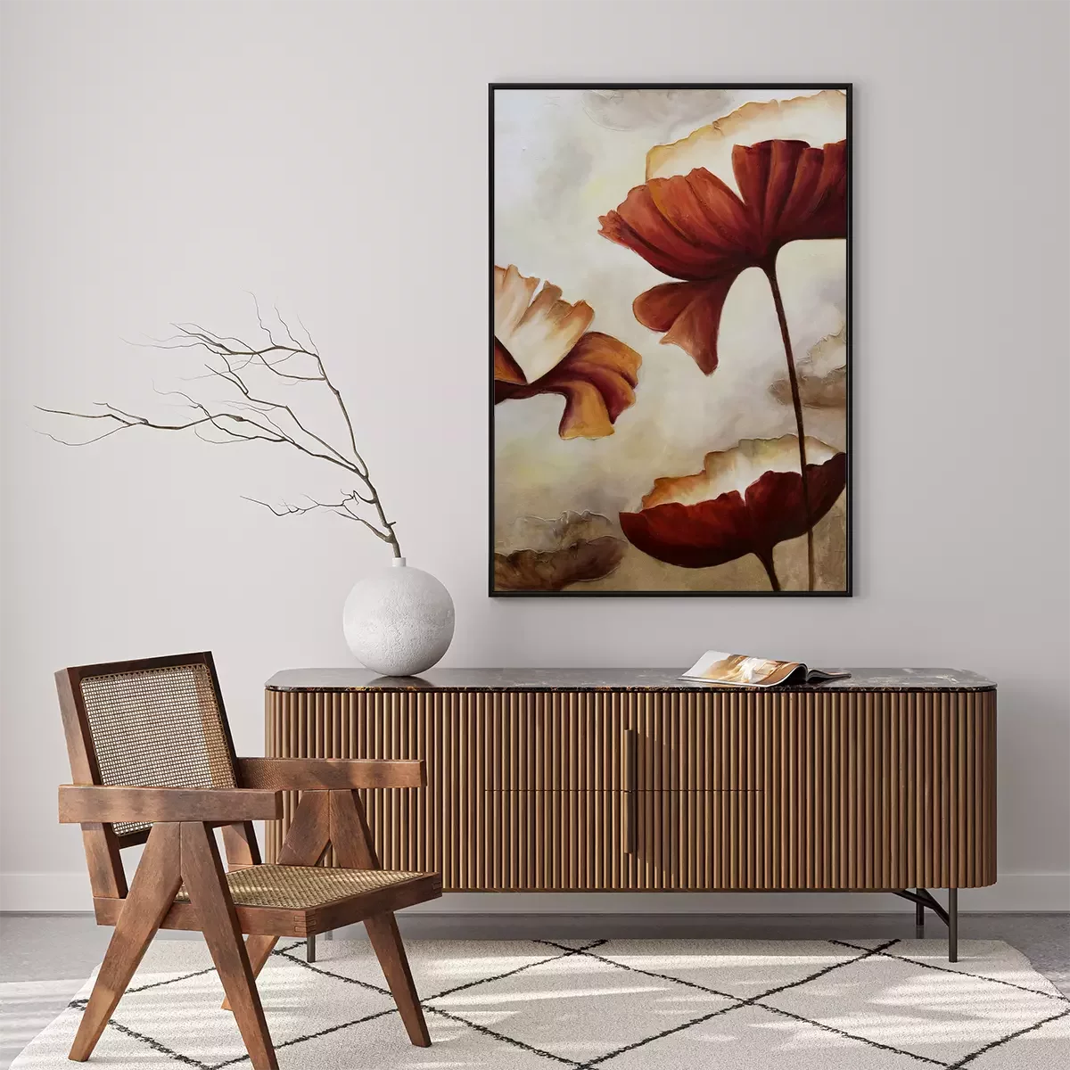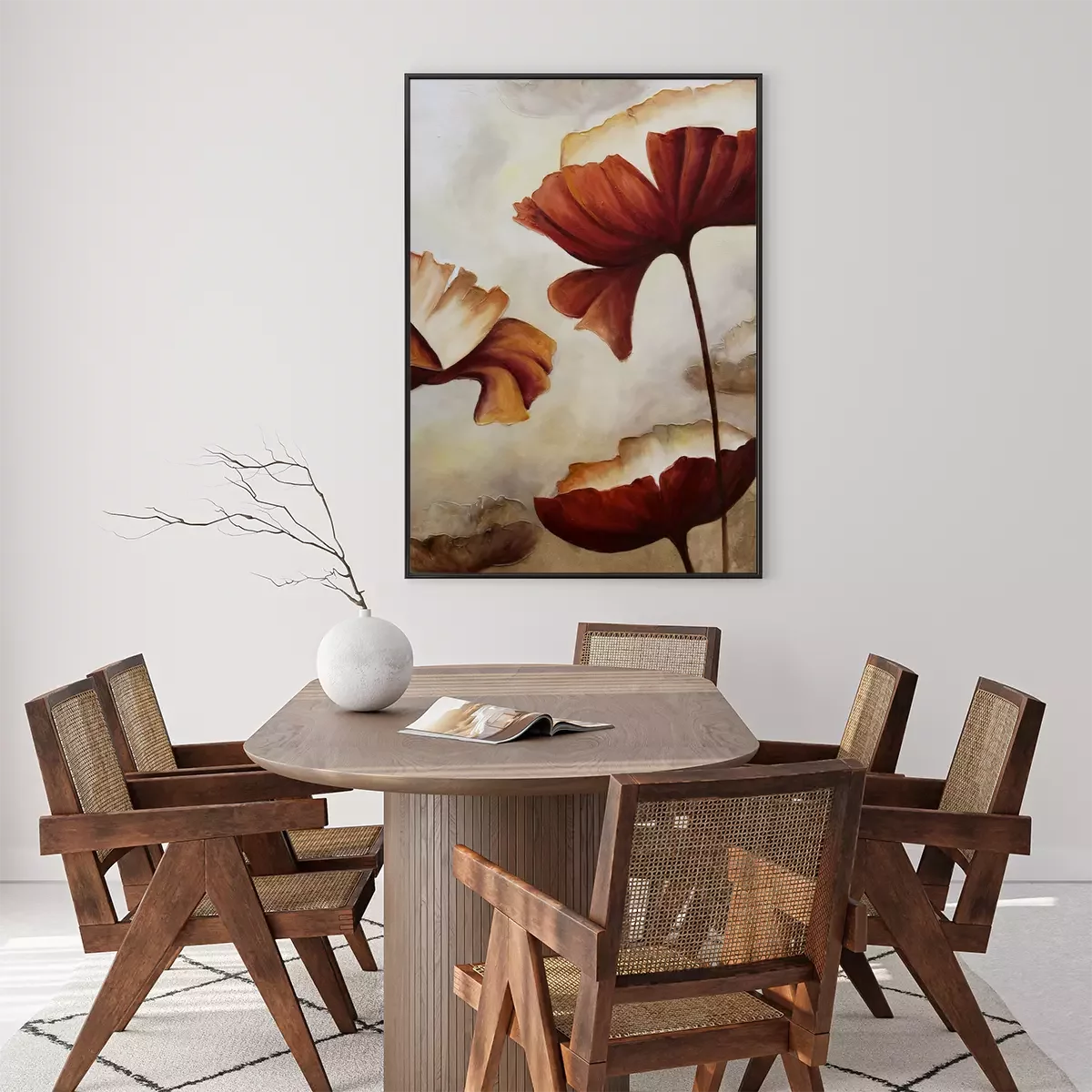 De poster retro met bloemenmotief die we hebben gekozen, heeft iets unieks. Hoewel de kleuren doen denken aan een sepiafoto, is de vorm van de klaprozen verrassend modern en minimalistisch, waardoor deze decoratie ergens tussen een hedendaagse en oude esthetiek valt. Dit zorgt ervoor dat dit ontwerp in verschillende interieurstijlen gebruikt kan worden, wat veel mogelijkheden biedt. Het is de moeite waard om te vermelden wat deze poster doet denken aan. Aquarel is het eerste wat in je opkomt als je naar deze muurdecoratie kijkt. Hoewel het een print is, imiteert het ontwerp perfect een schilderij met waterverf. Dit geeft de poster retro een artistiek karakter. Het is ook opmerkelijk dat bloemenmotieven tijdloos mooi zijn en nooit uit de mode raken. Vooral zulke ontwerpen die een moderne, zelfs licht abstracte uitstraling hebben. Voor welke interieurs raden we deze poster aan? Klaprozen passen uitstekend in een traditioneel of rustiek interieur, waar een warme kleurenpalet van beige, bruin en oranje de boventoon voert. Een interessante optie is om deze decoratie op te hangen in een industrieel ingerichte kamer. Op een betonnen muur krijgt deze poster een heel ander karakter. Aquarel met klaprozen past ook perfect in een romantisch ingerichte slaapkamer, vooral als je hem boven het bed hangt. Als het hoofdbord van het bed gevlochten is van riet, zal het hele interieur prachtig tot zijn recht komen. Voor dit ontwerp is het belangrijk om aandacht te besteden aan de juiste lijst. Een houten lijst past goed in een rustiek, romantisch, eco of traditioneel interieur, terwijl een zwarte aluminium lijst perfect zou zijn in een minimalistisch of industrieel interieur. Dankzij het unieke bloemenontwerp van deze poster zullen de klaprozen een langdurige decoratie zijn die bewoners niet zal vervelen en nooit uit de mode zal raken. Het elegante karakter van het ontwerp maakt het ook een uitstekende decoratieve optie voor kantoren, cafés, wachtkamers of verschillende soorten werkruimtes.