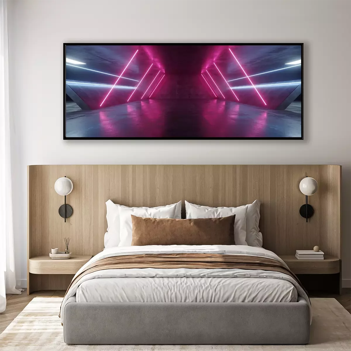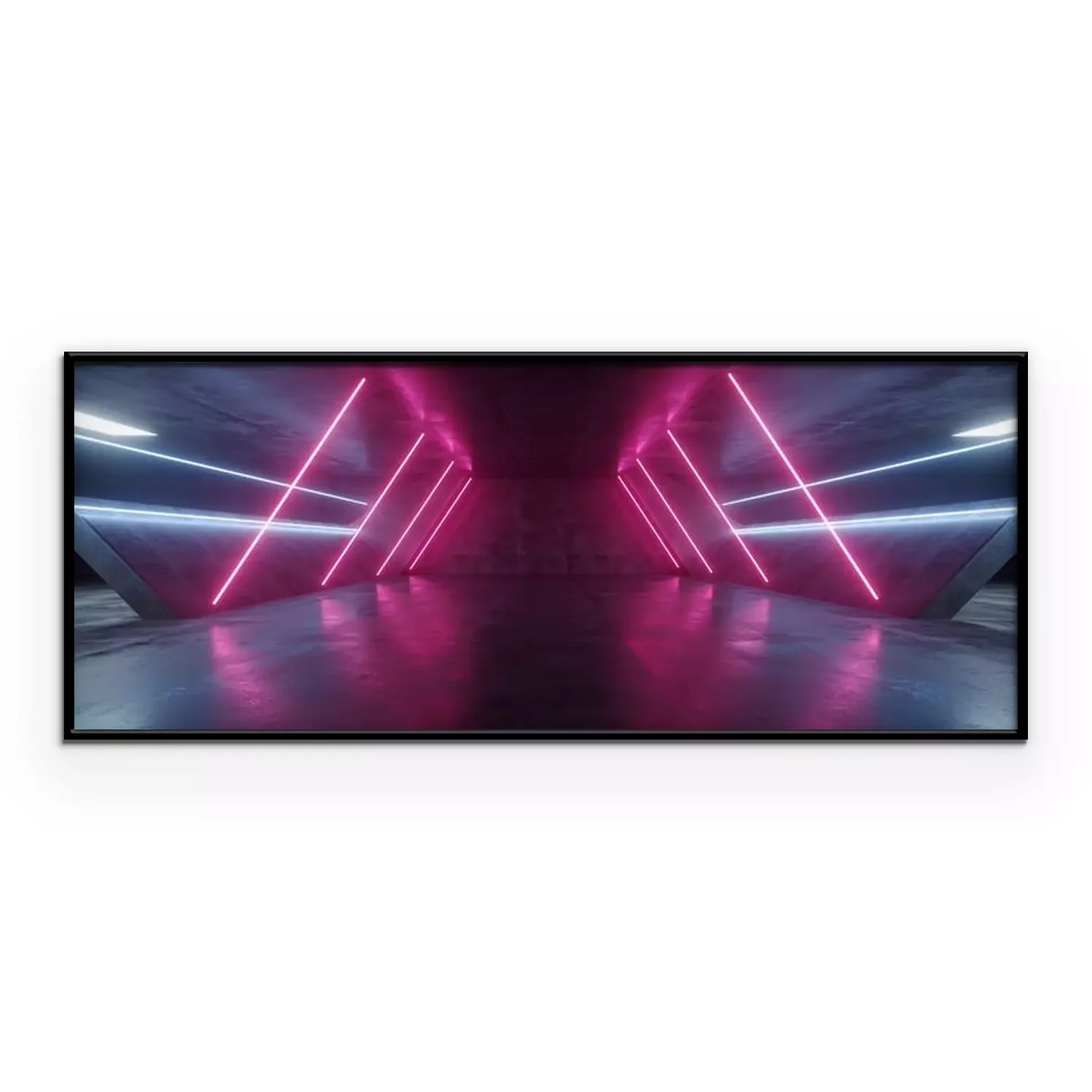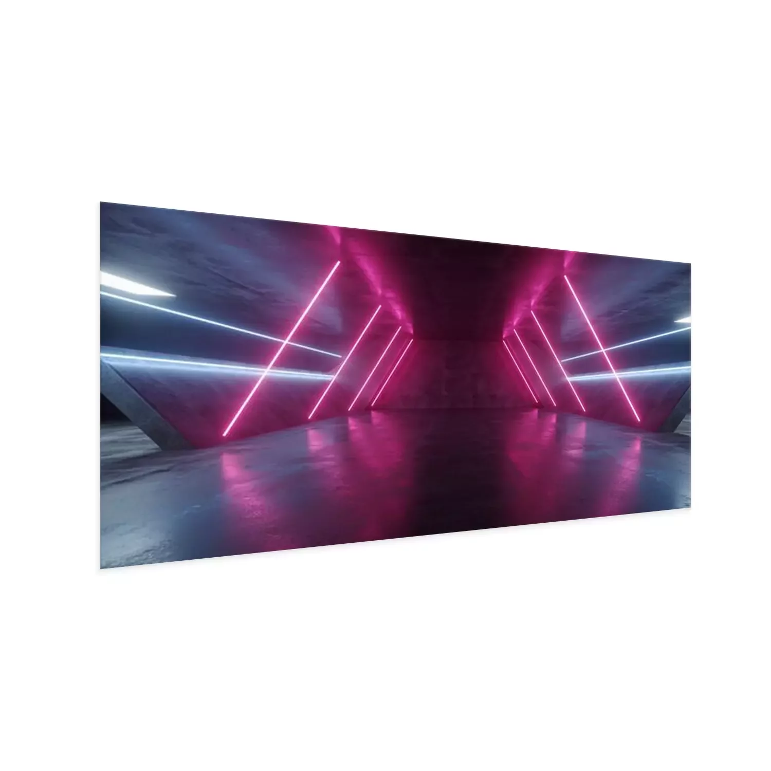 Poster Sci Fi Futuristic Alien Tunnel Ship Corridor Underground Laser Purple Blue Neon Light Lines On Grunge Reflective Concrete Empty Space Background 3D Rendering