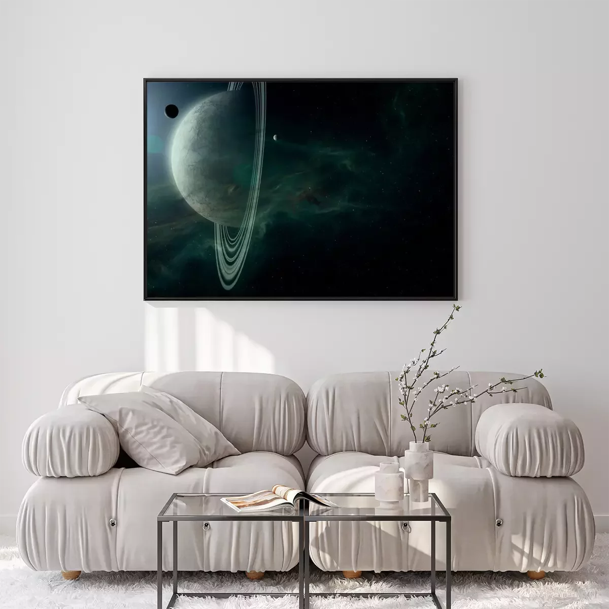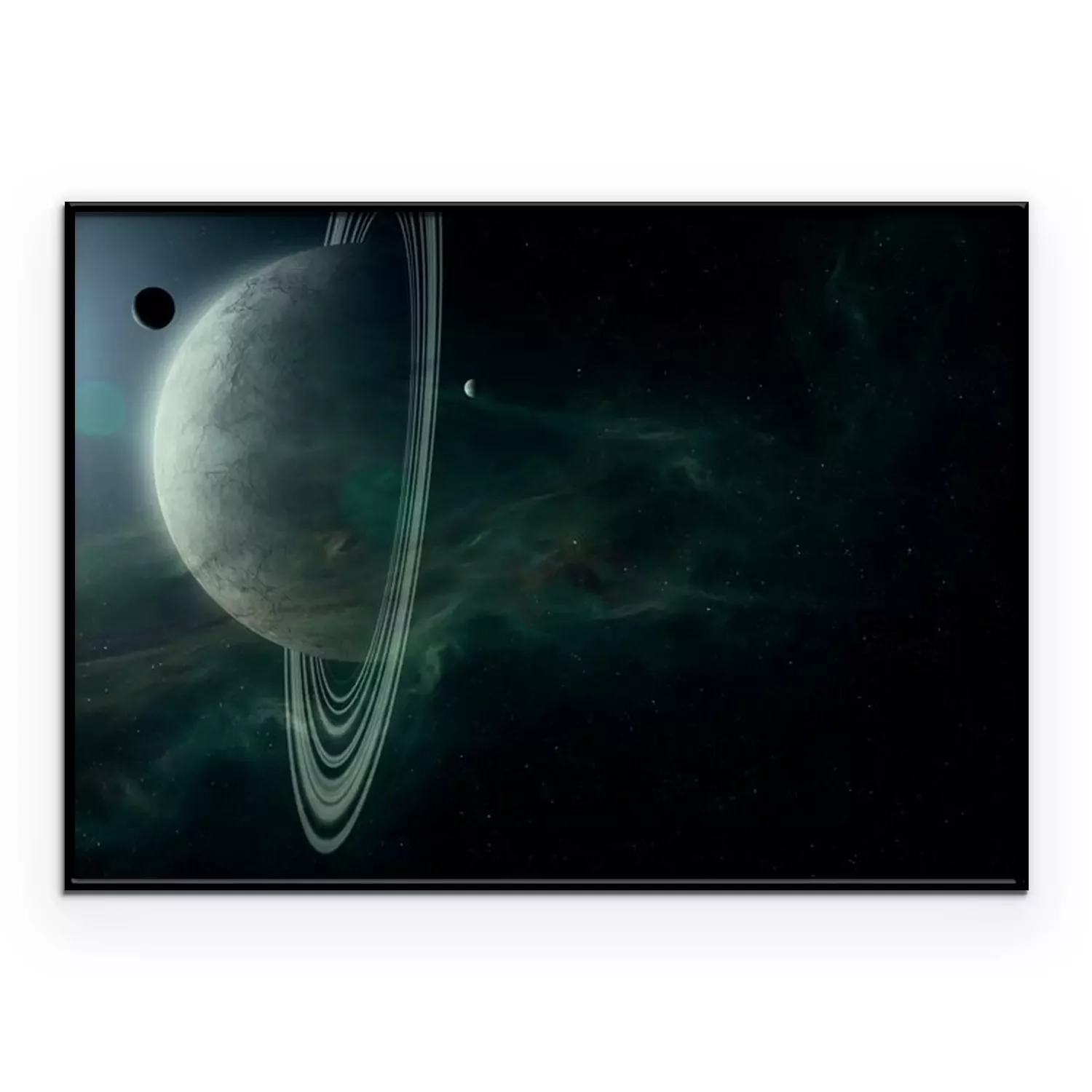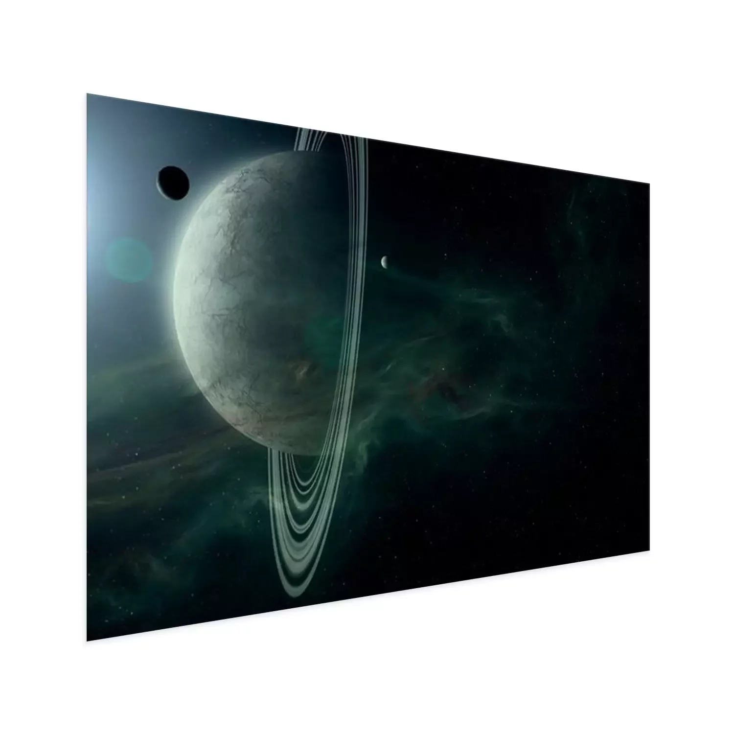 Poster: science fiction space scene, planet with rings and moons in bright star light astronomy background digital illustration (no NASA images used)