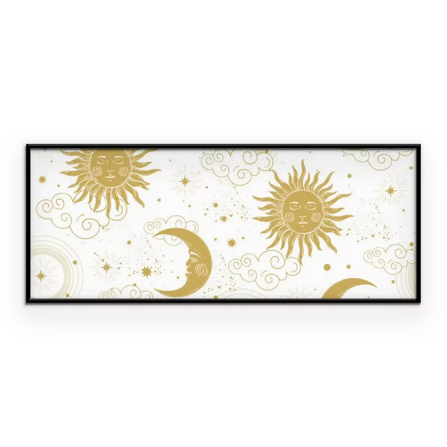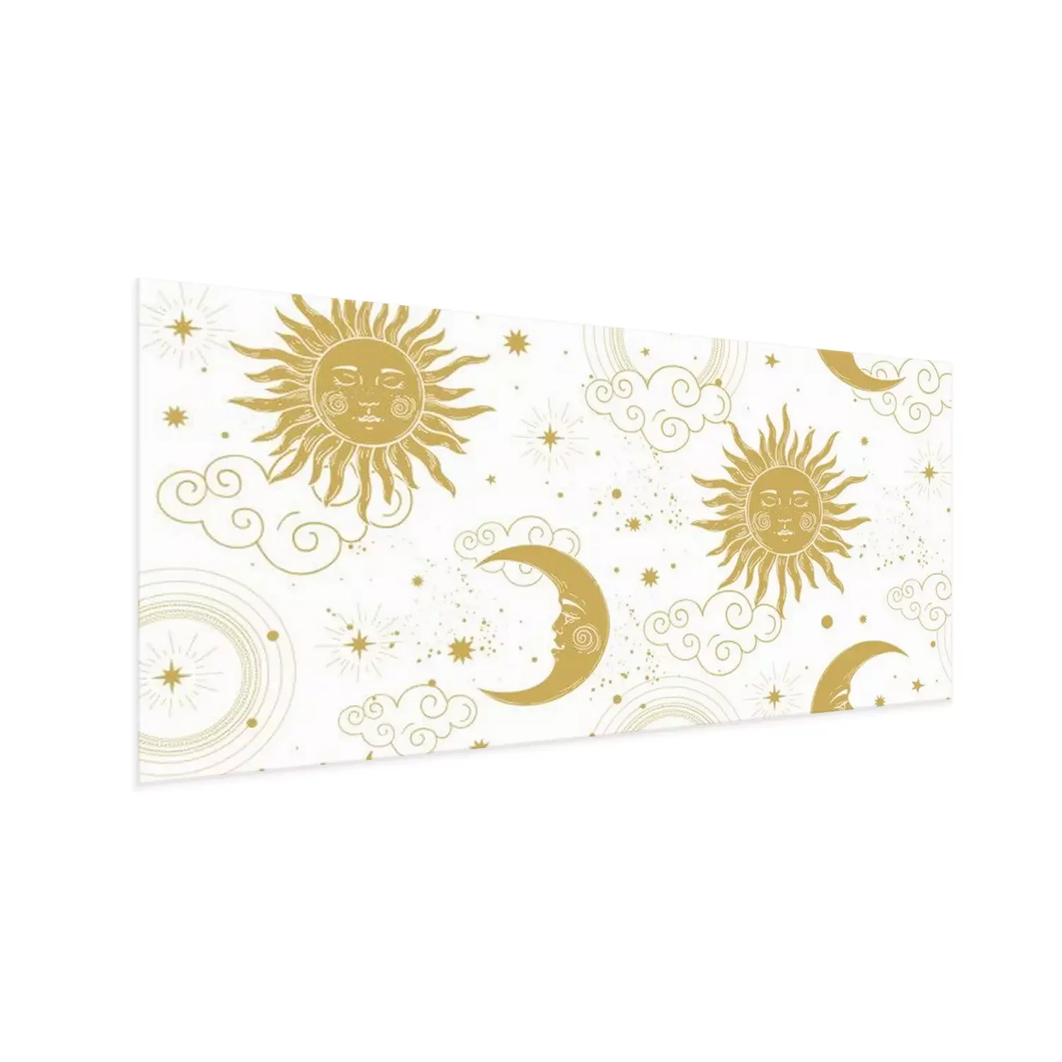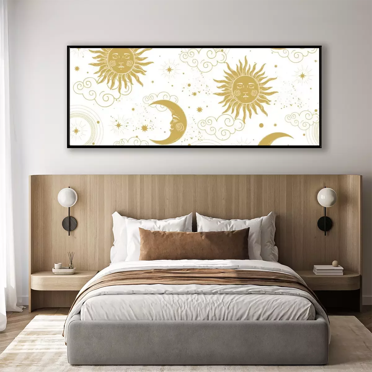 Poster Seamless celestial pattern with golden sun and crescent moon on white background, vintage boho ornament for astrology and tarot. Modern vector hand drawing illustration.