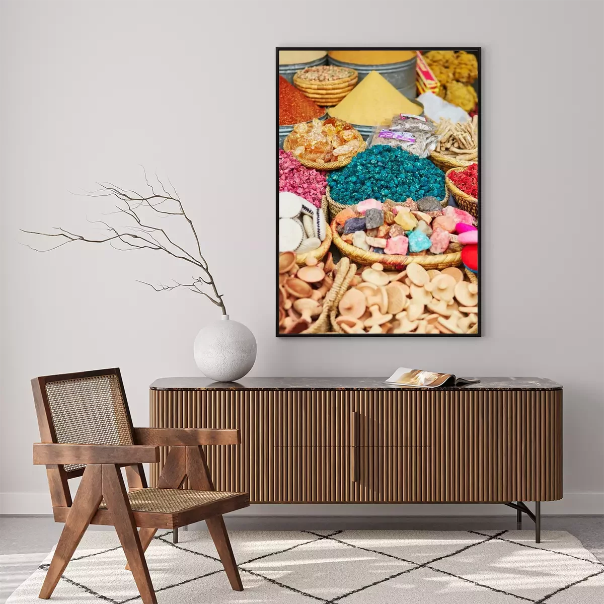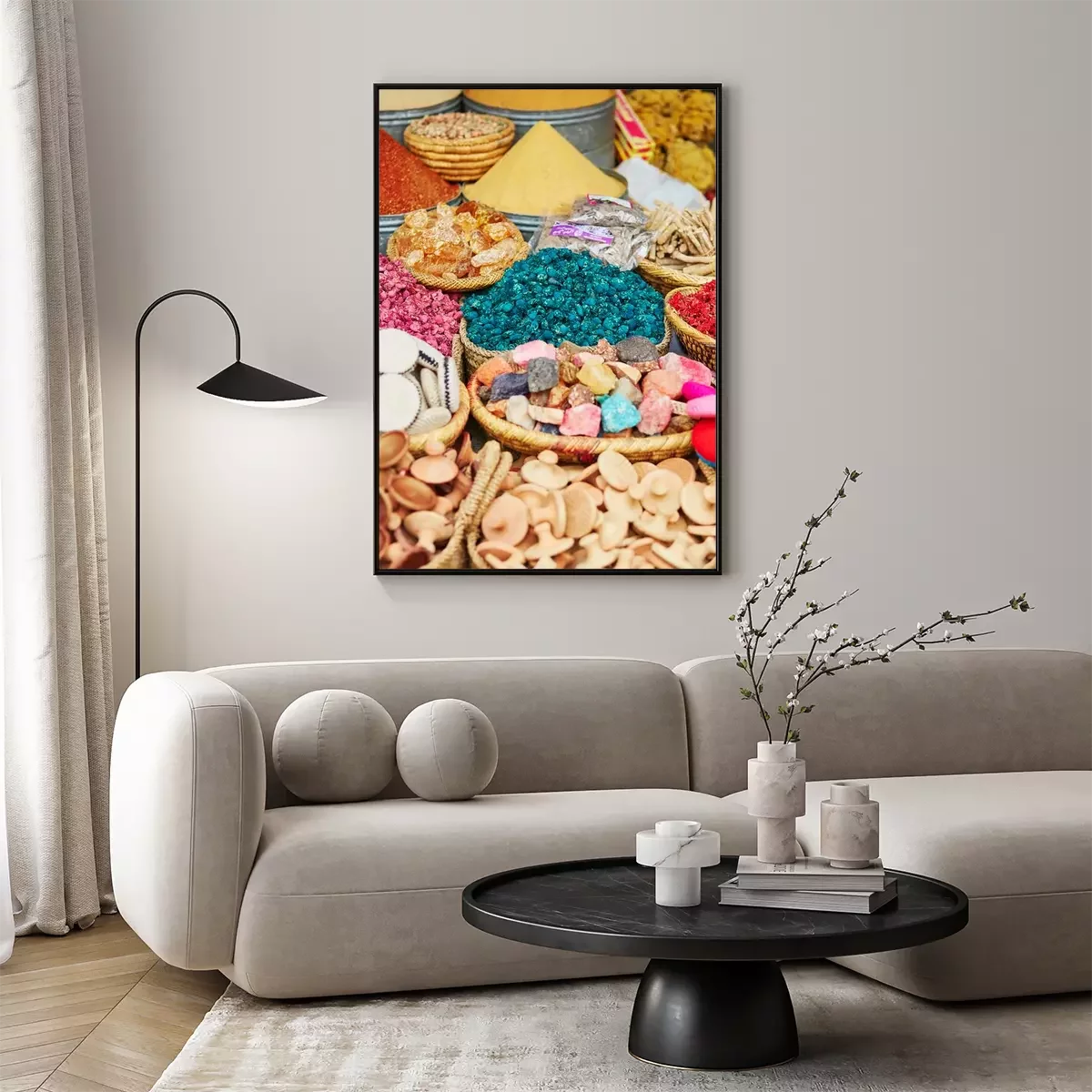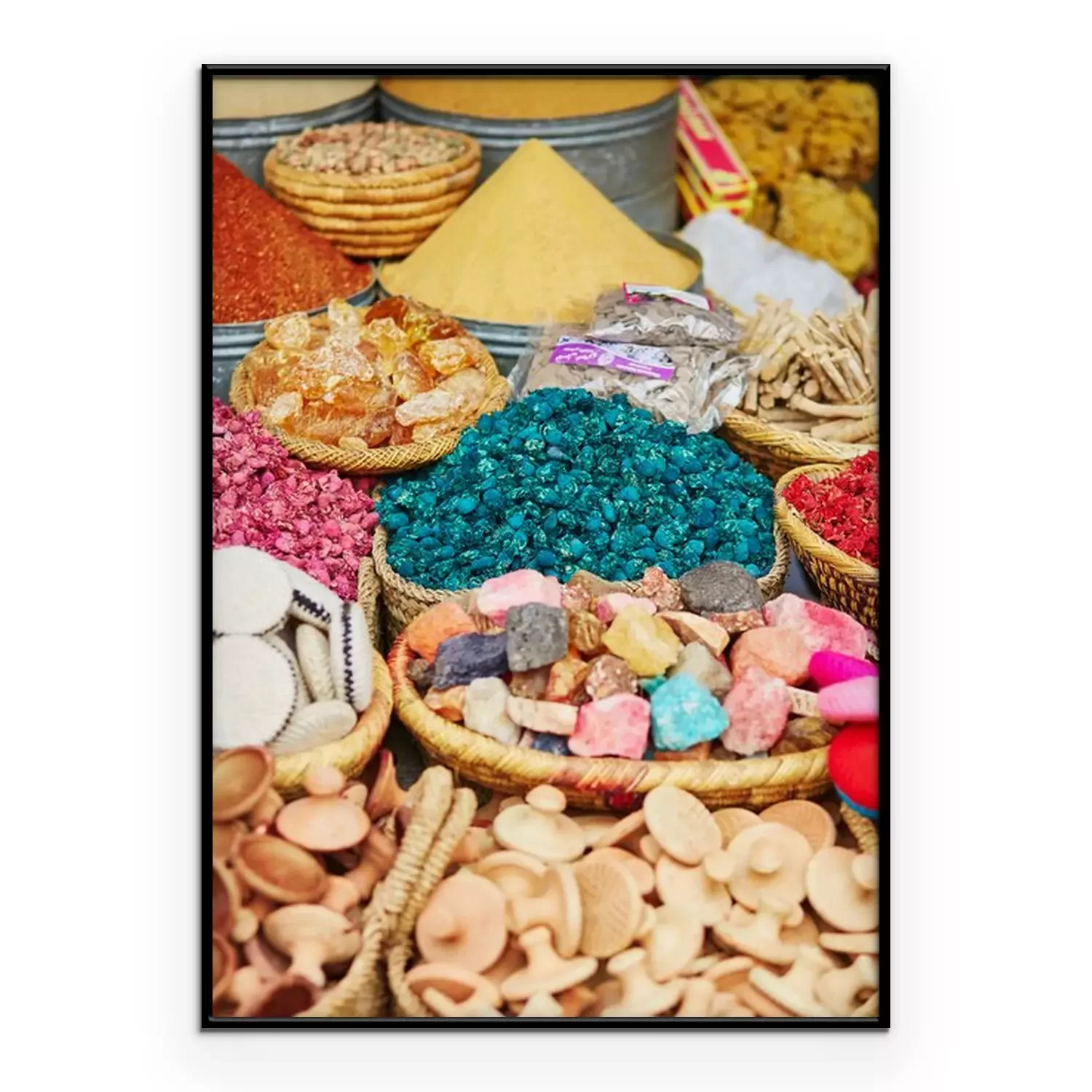 Poster: Selectie van kruiden op een traditionele Marokkaanse markt