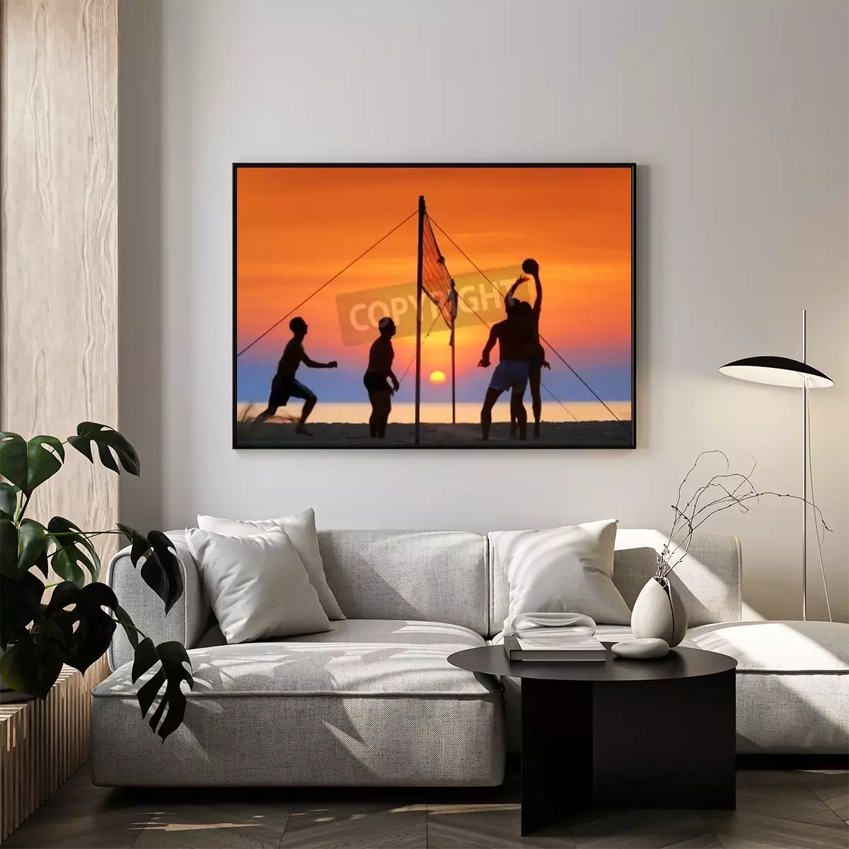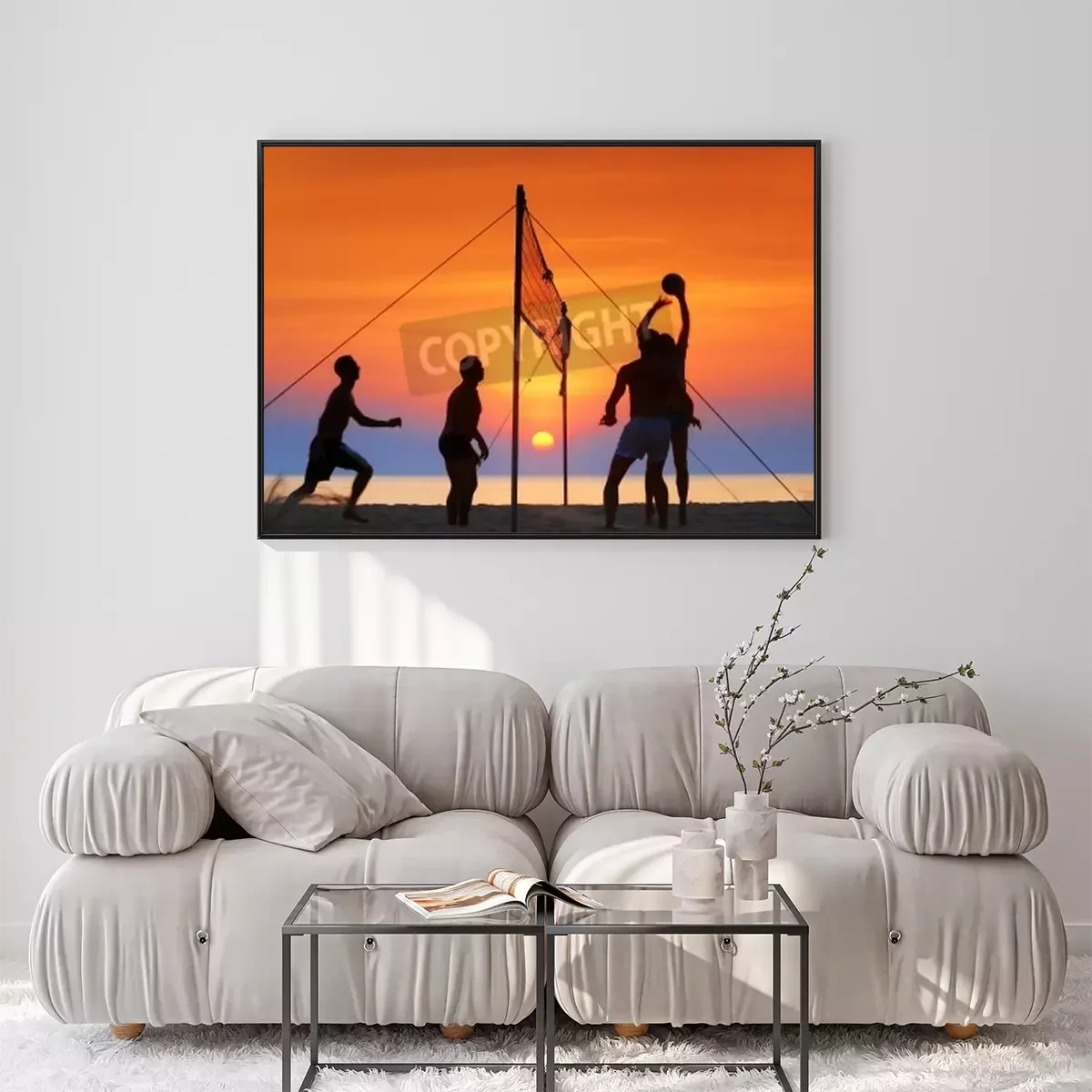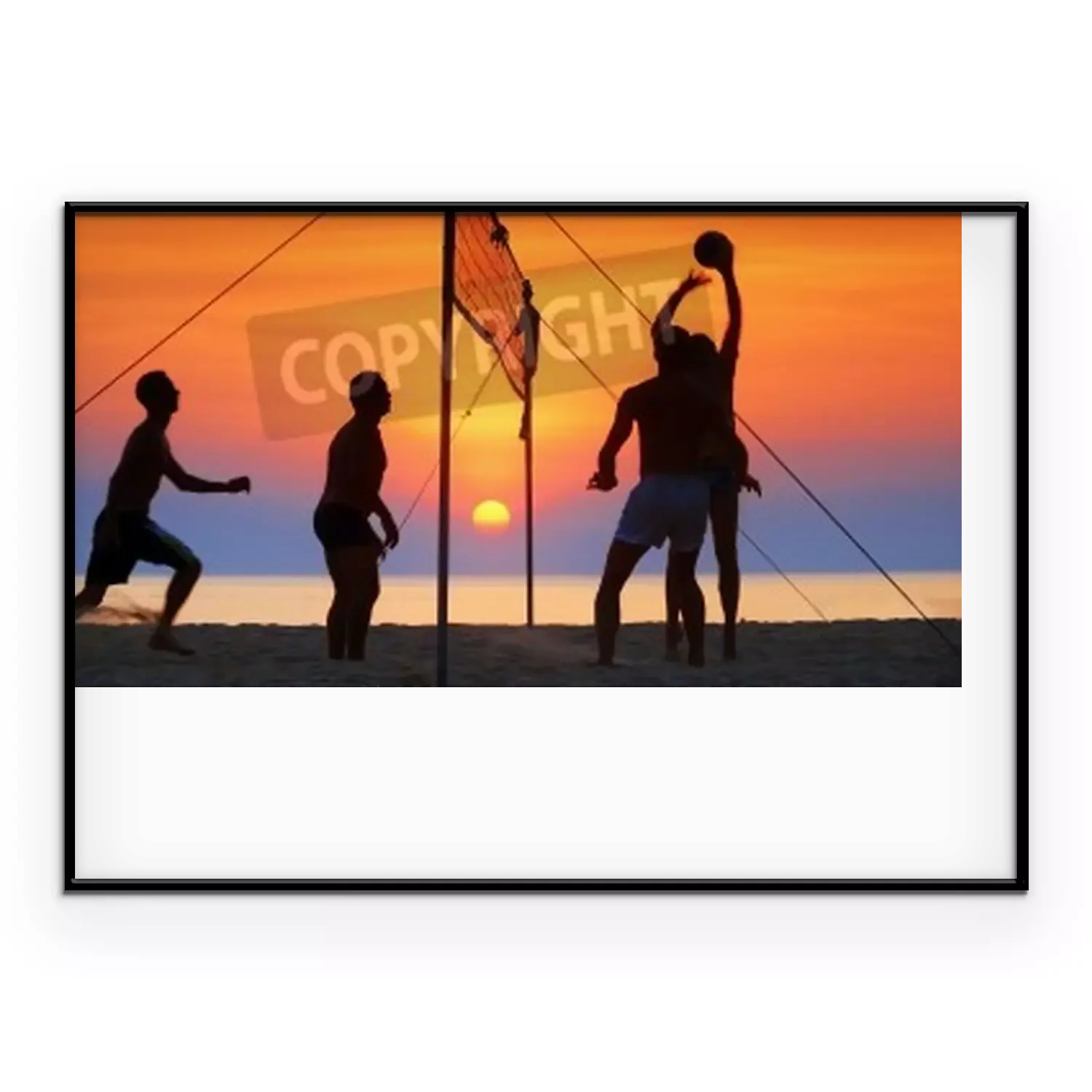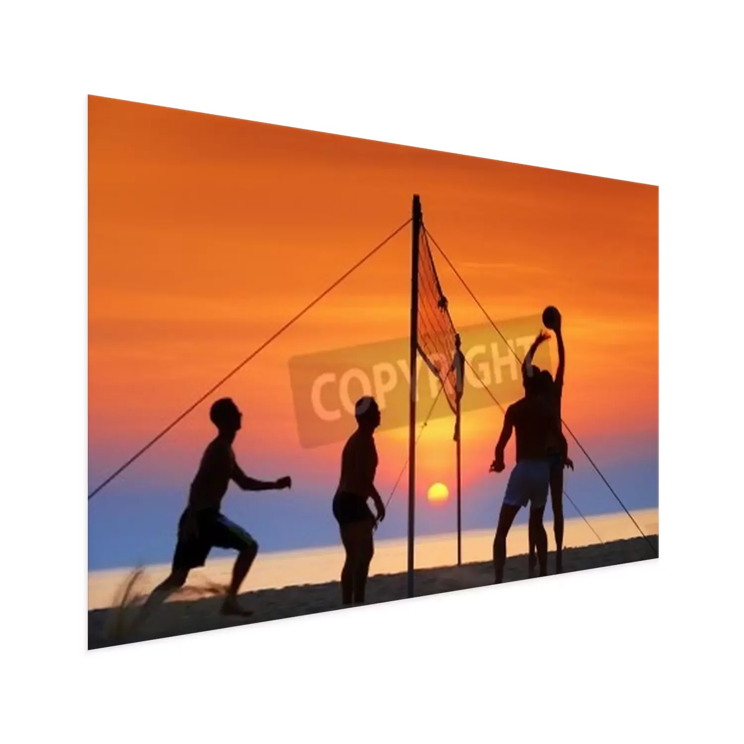 Poster: silhouet beachvolleyballen. Sunset tijd