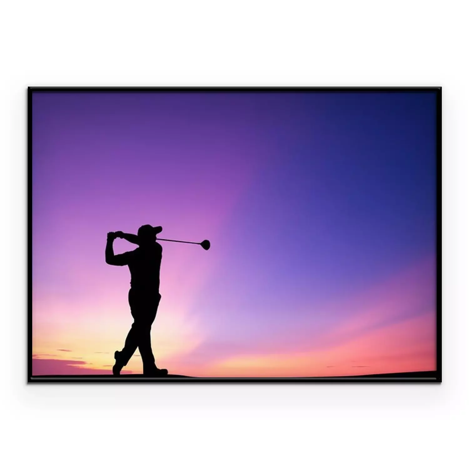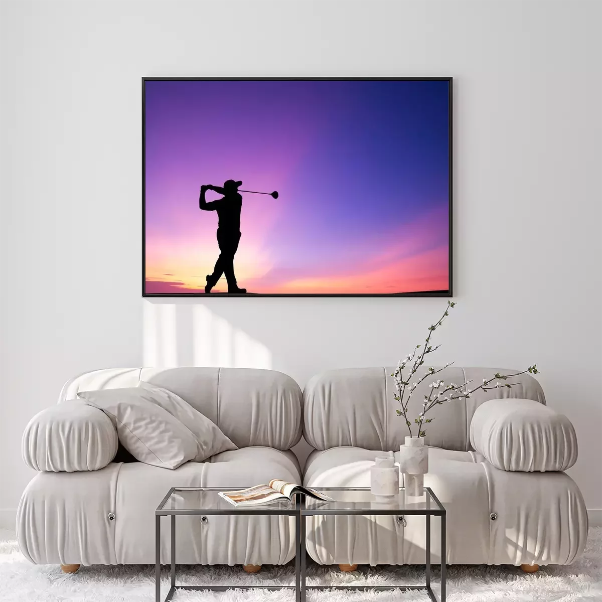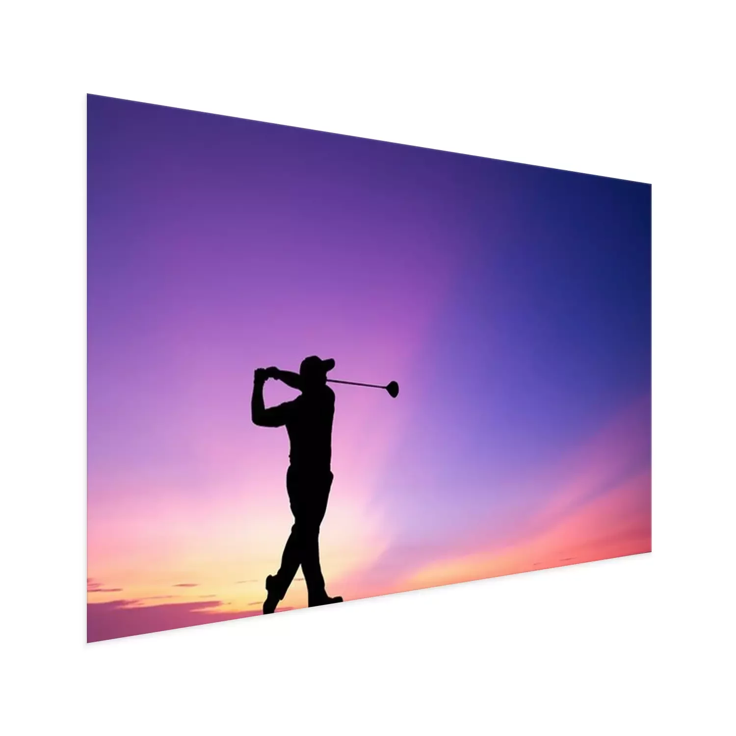 Poster: silhouet golfspeler golfen tijdens de prachtige zonsondergang