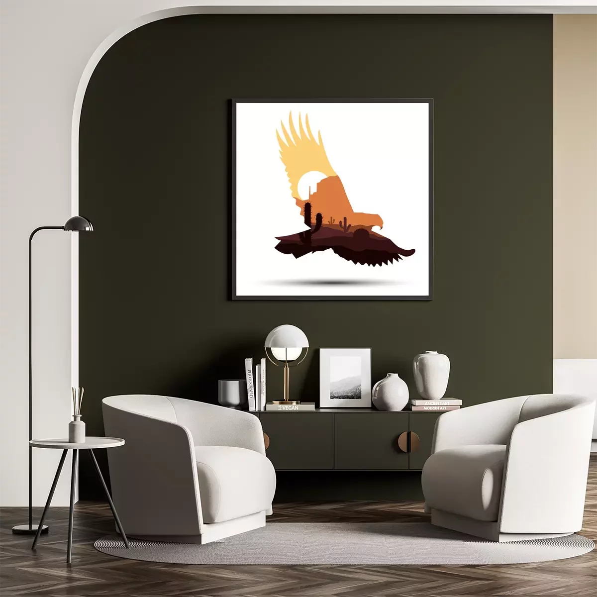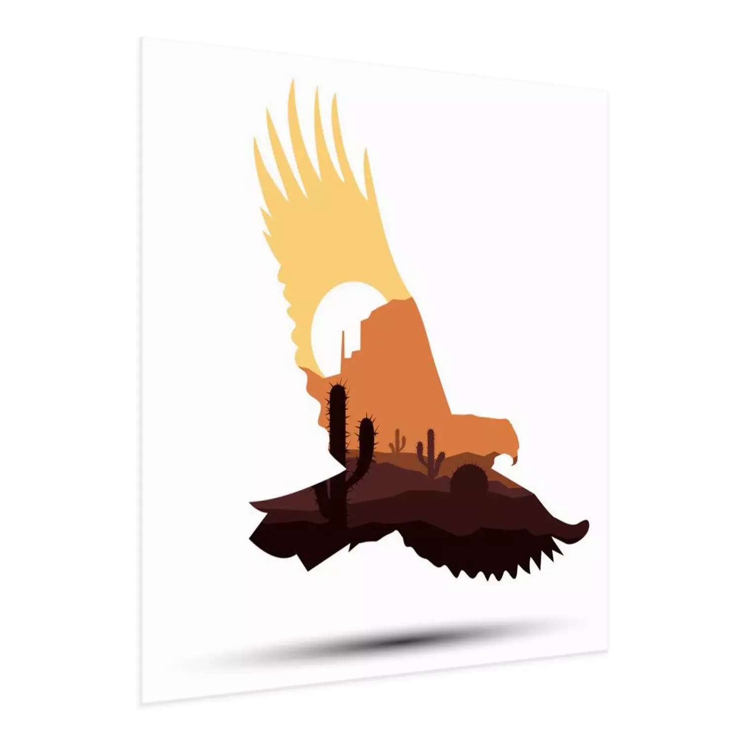 Poster: Silhouet van adelaar met naaldbomen op de achtergrond van avondhemel.