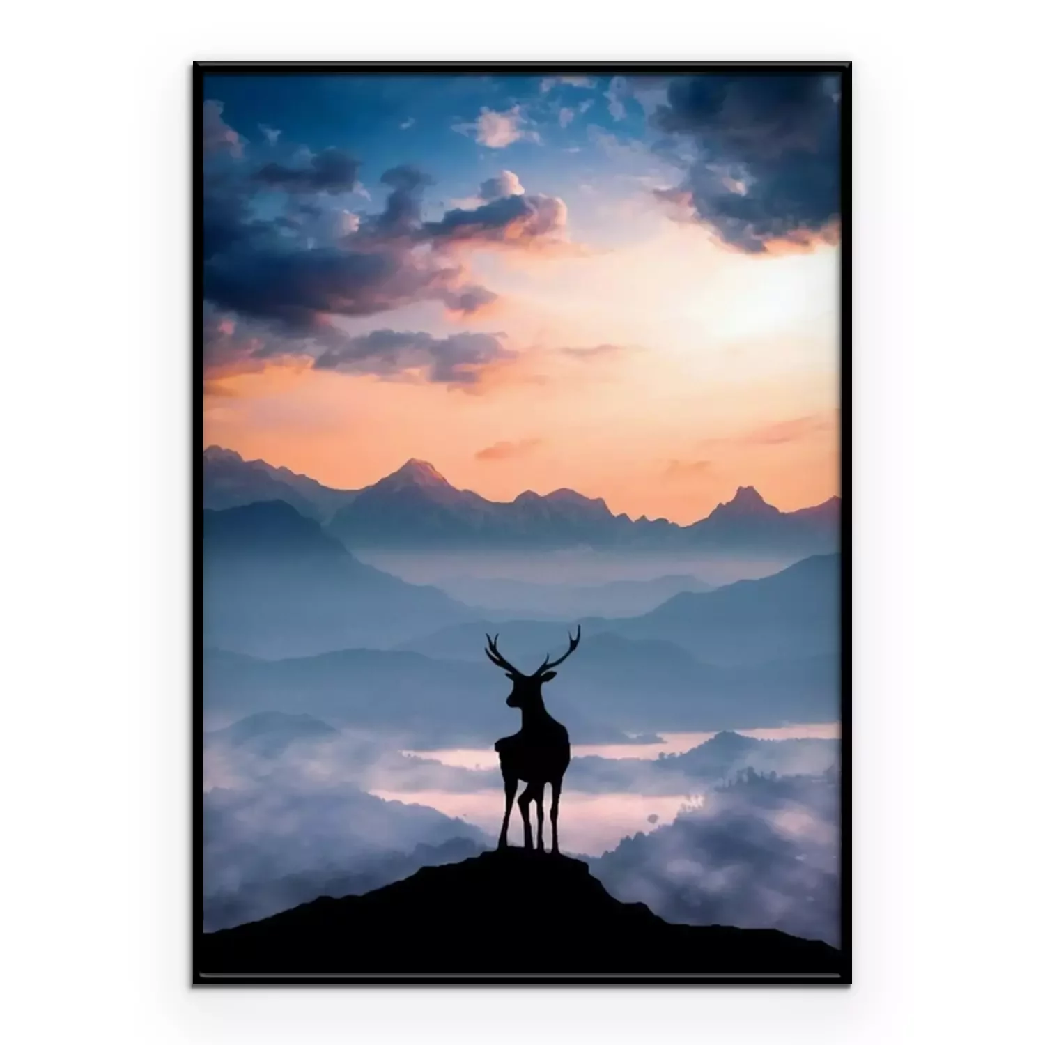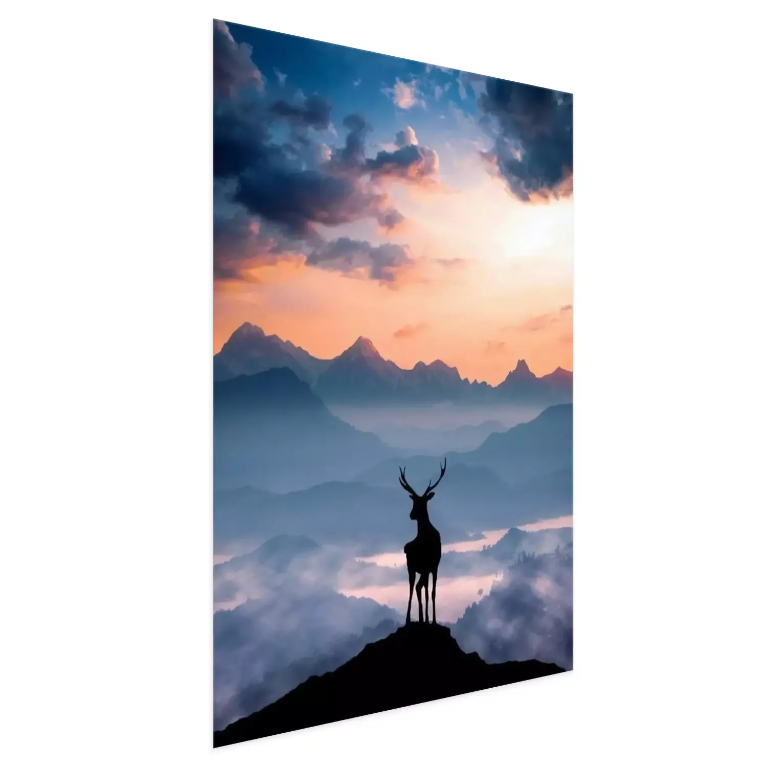 Poster: Silhouet van een hert op een bergtop bij zonsondergang