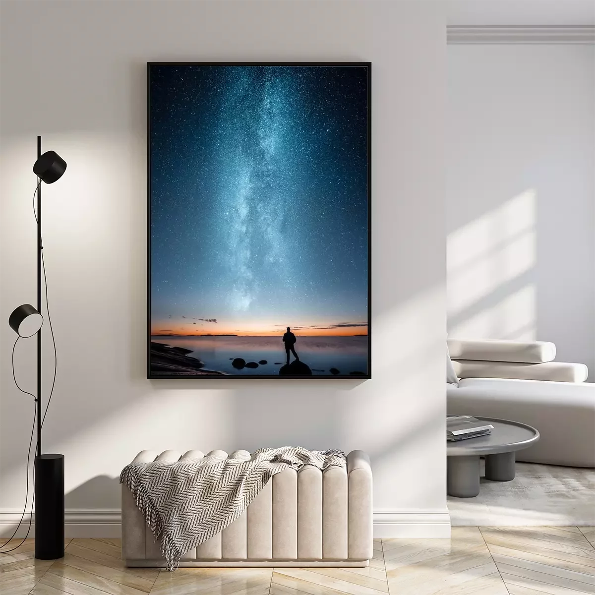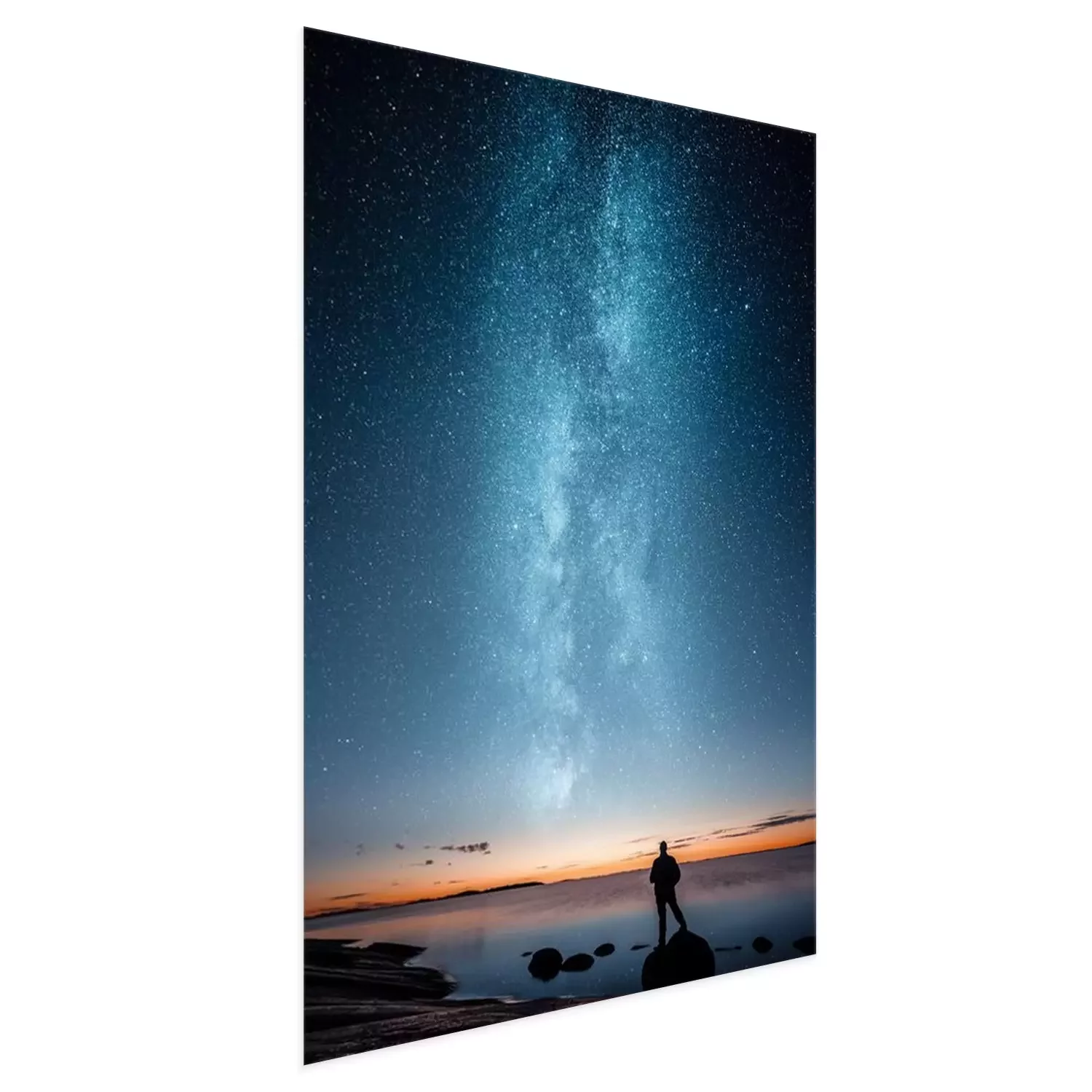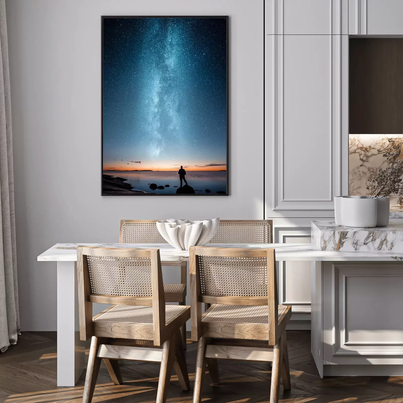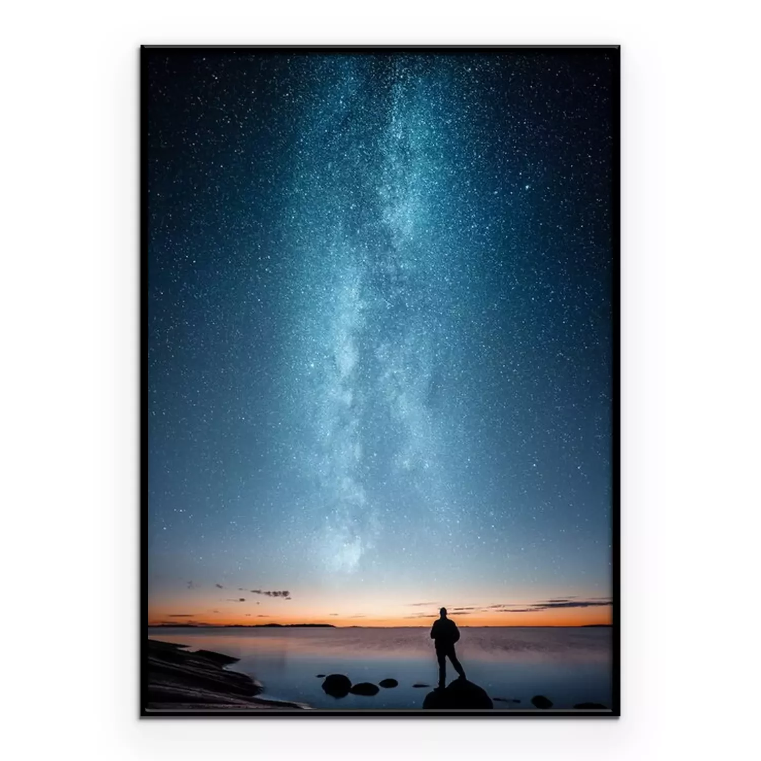 Poster: Silhouette of a man standing on a rock by a sea and looking at sunset and stars