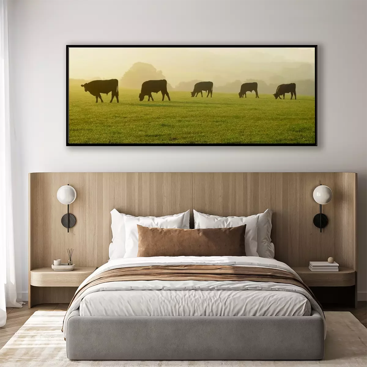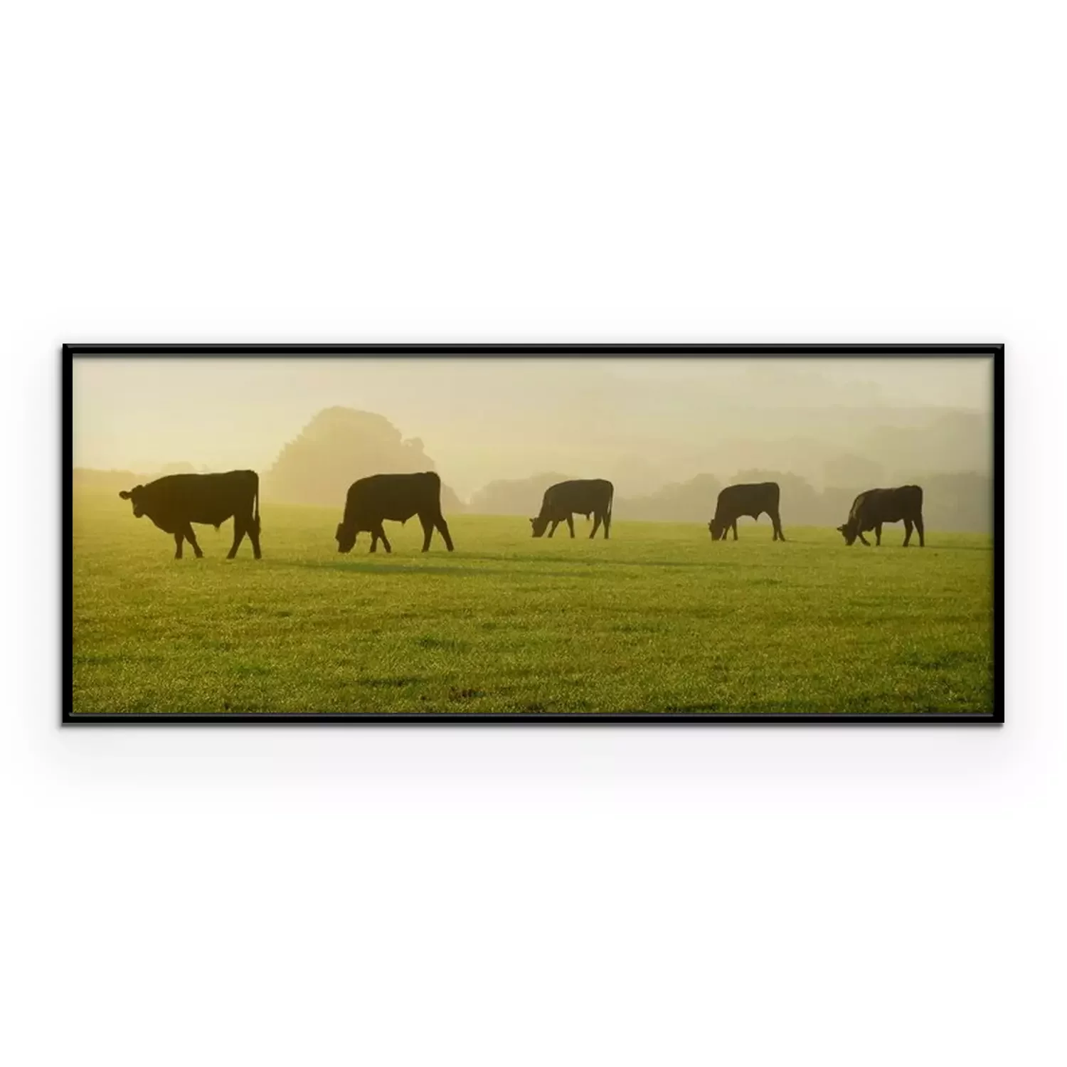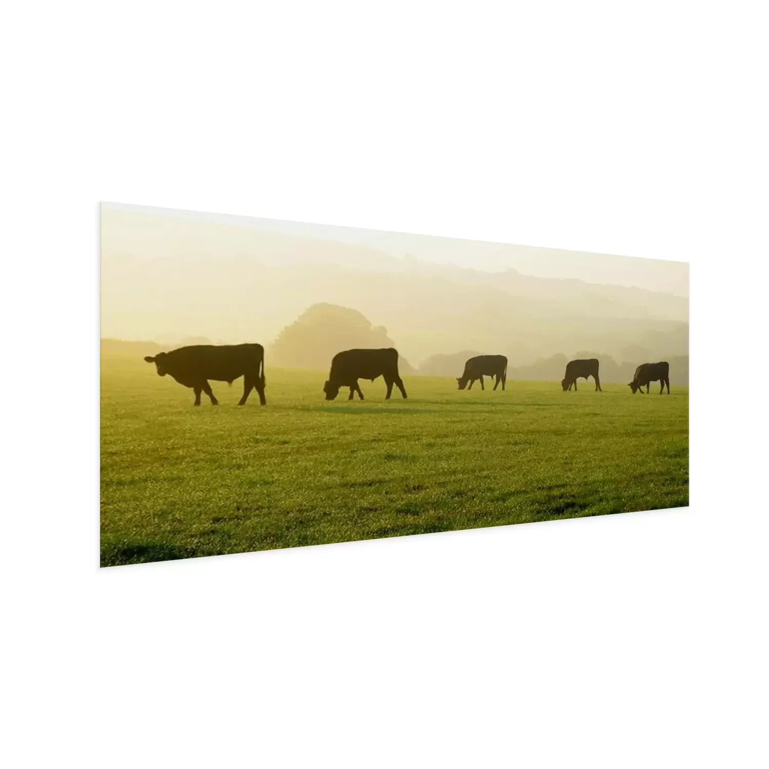 Poster: Silhouetten van koeien op een ochtendlijke groene weide