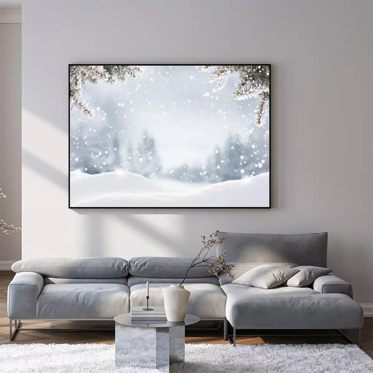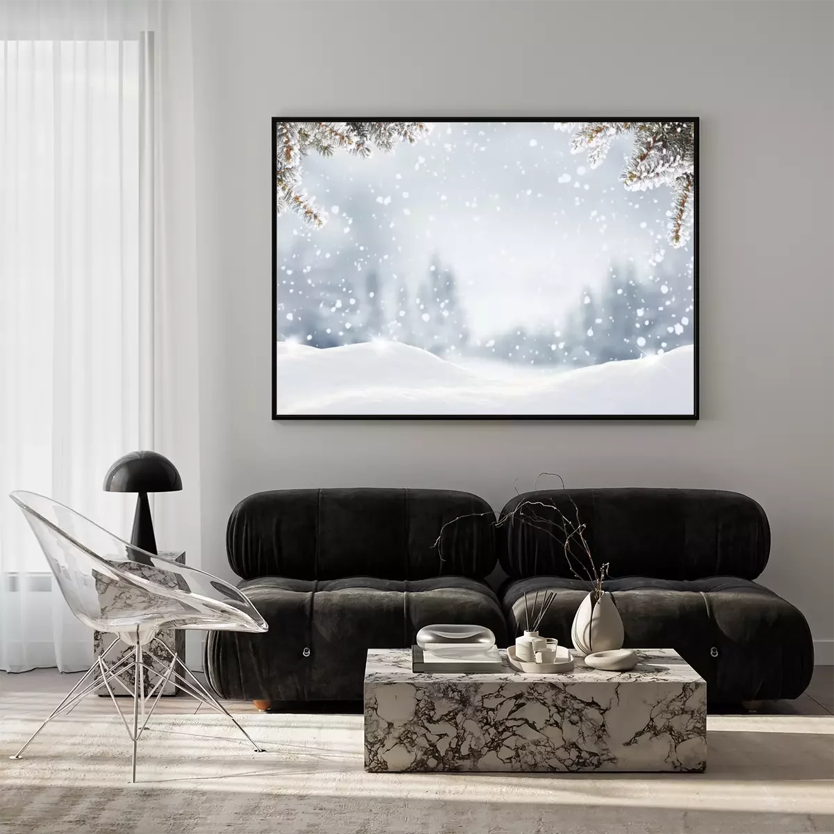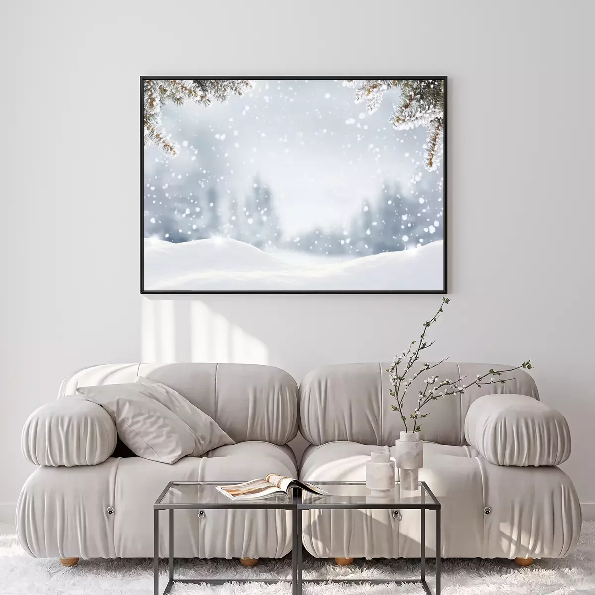 Poster: Sneeuwvlokken vallen van een naaldboom