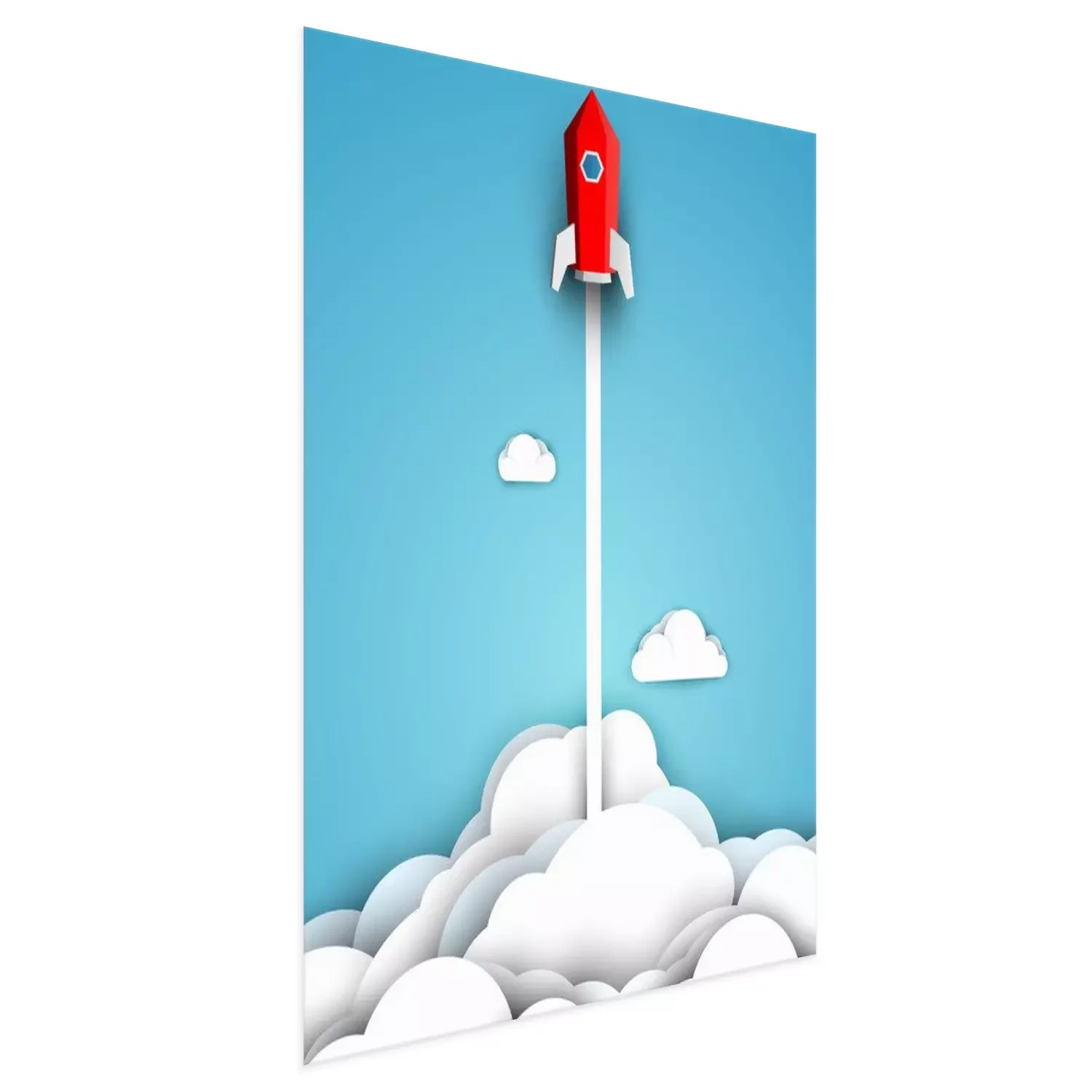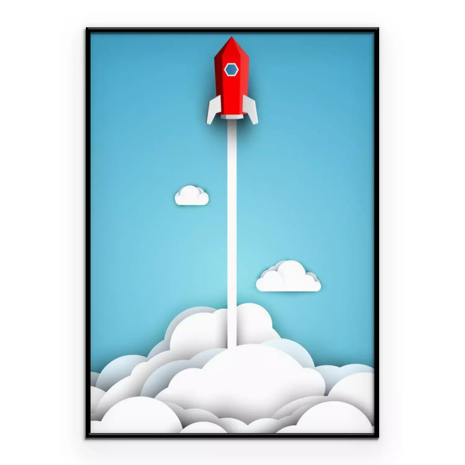 Poster Space red rocket fly up in blue sky with cloud. Science concept inspiration. Paper art cartoon 3d realistic trendy craft style. Modern origami design template. Funny cute vector illustration.