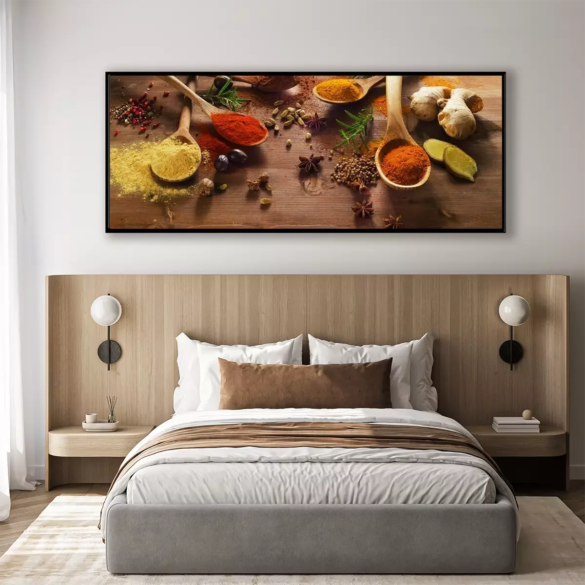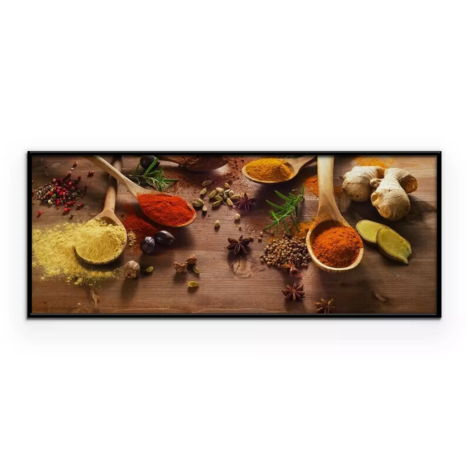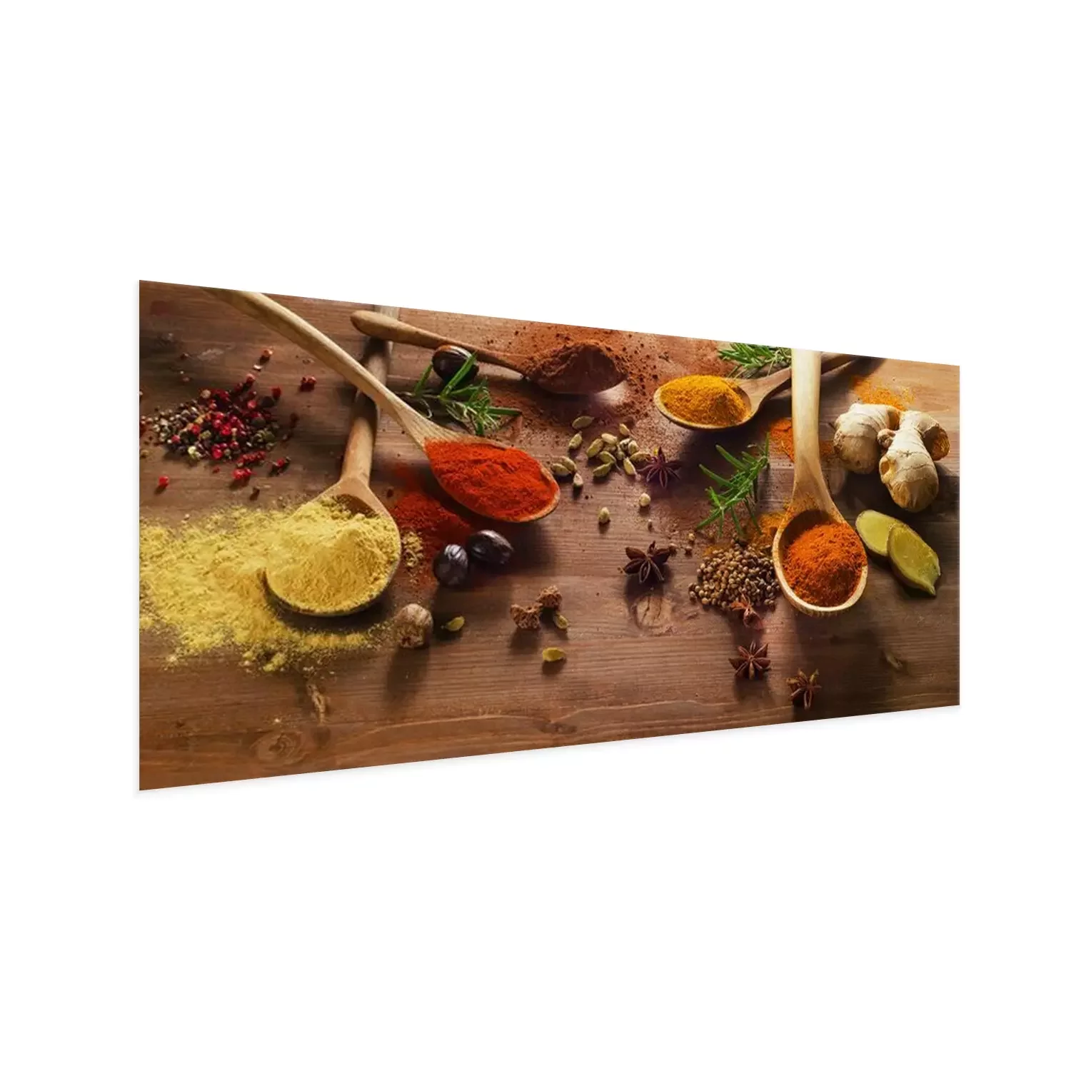 Poster: Specerijen en kruiden op houten tafel.
