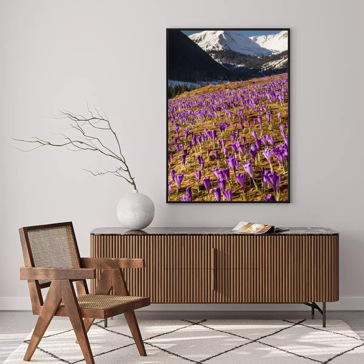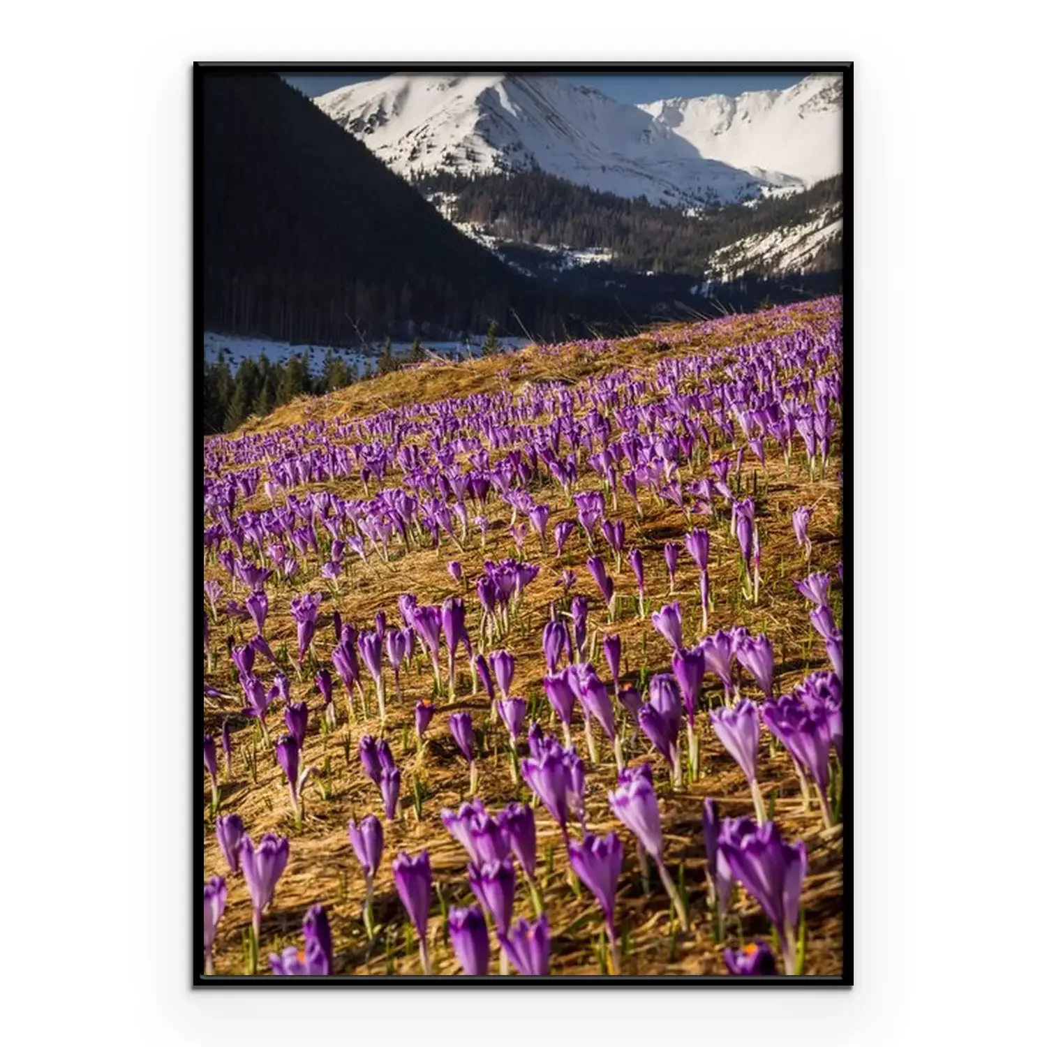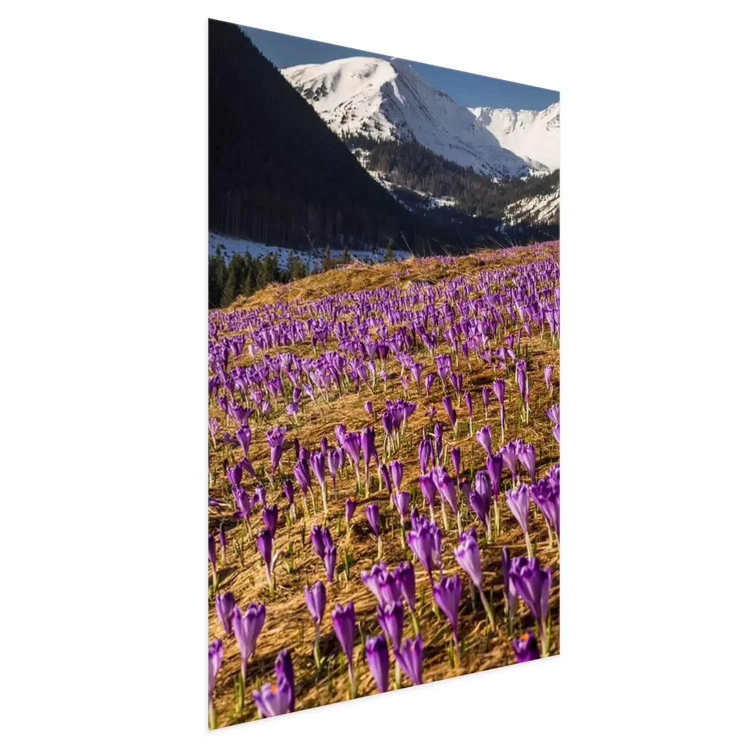 Poster Spring in Tatry Mountains in Poland. Crocuses in meadows and snow in mountains.