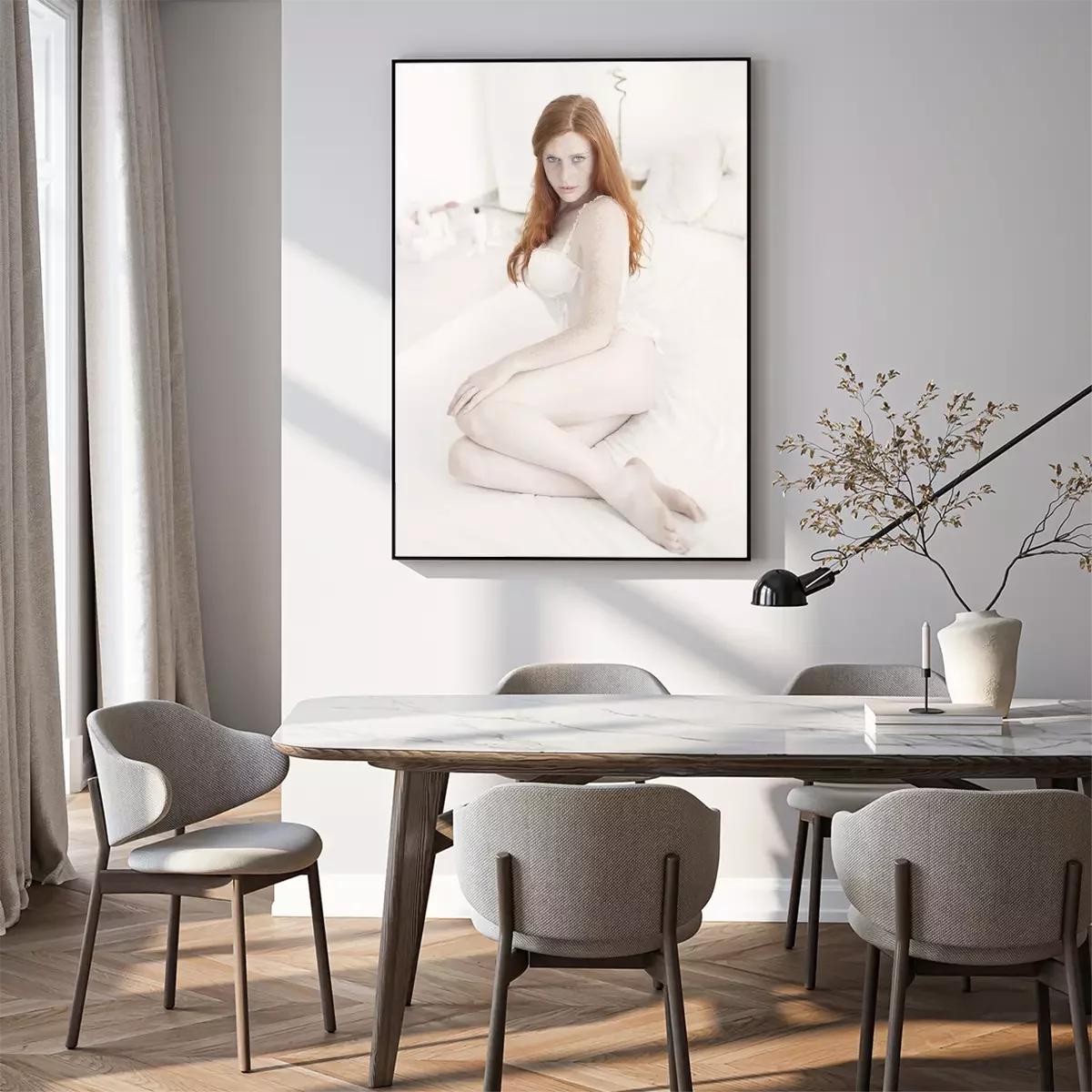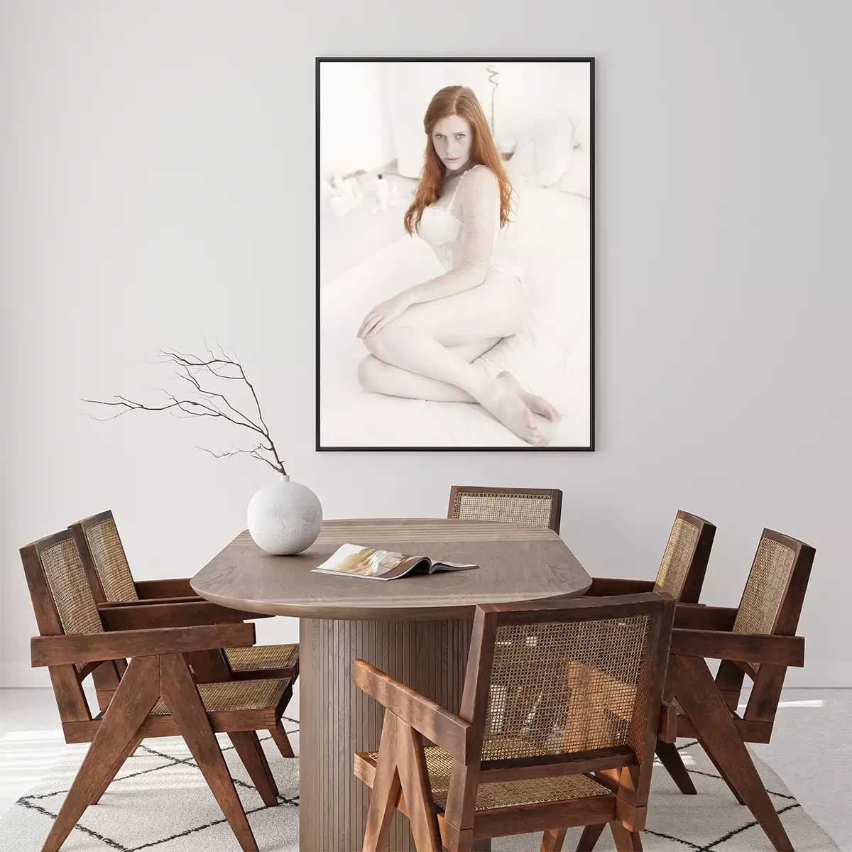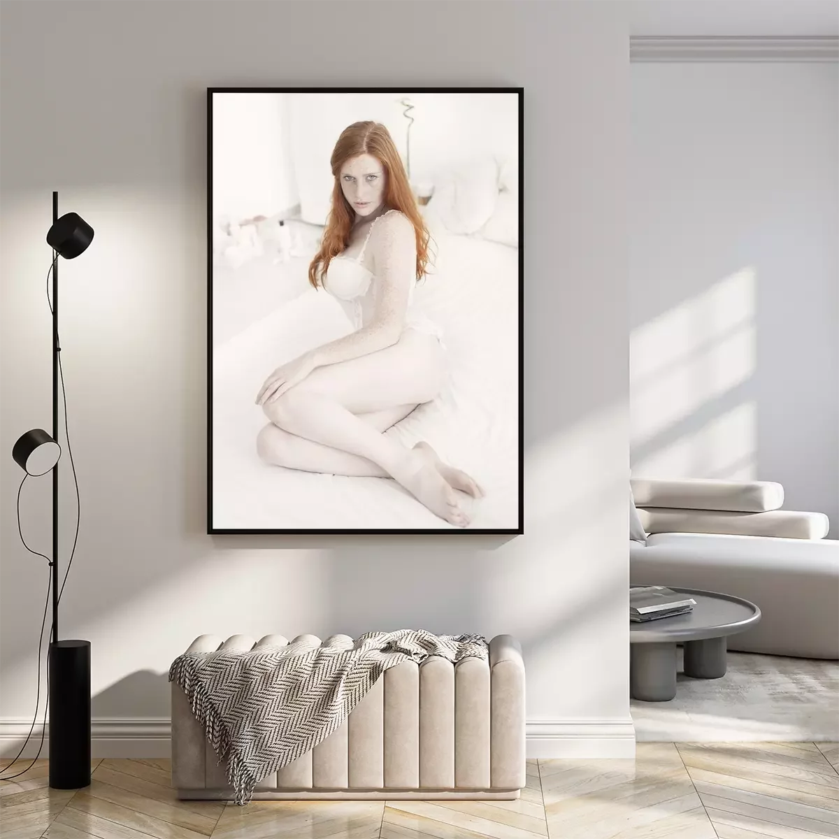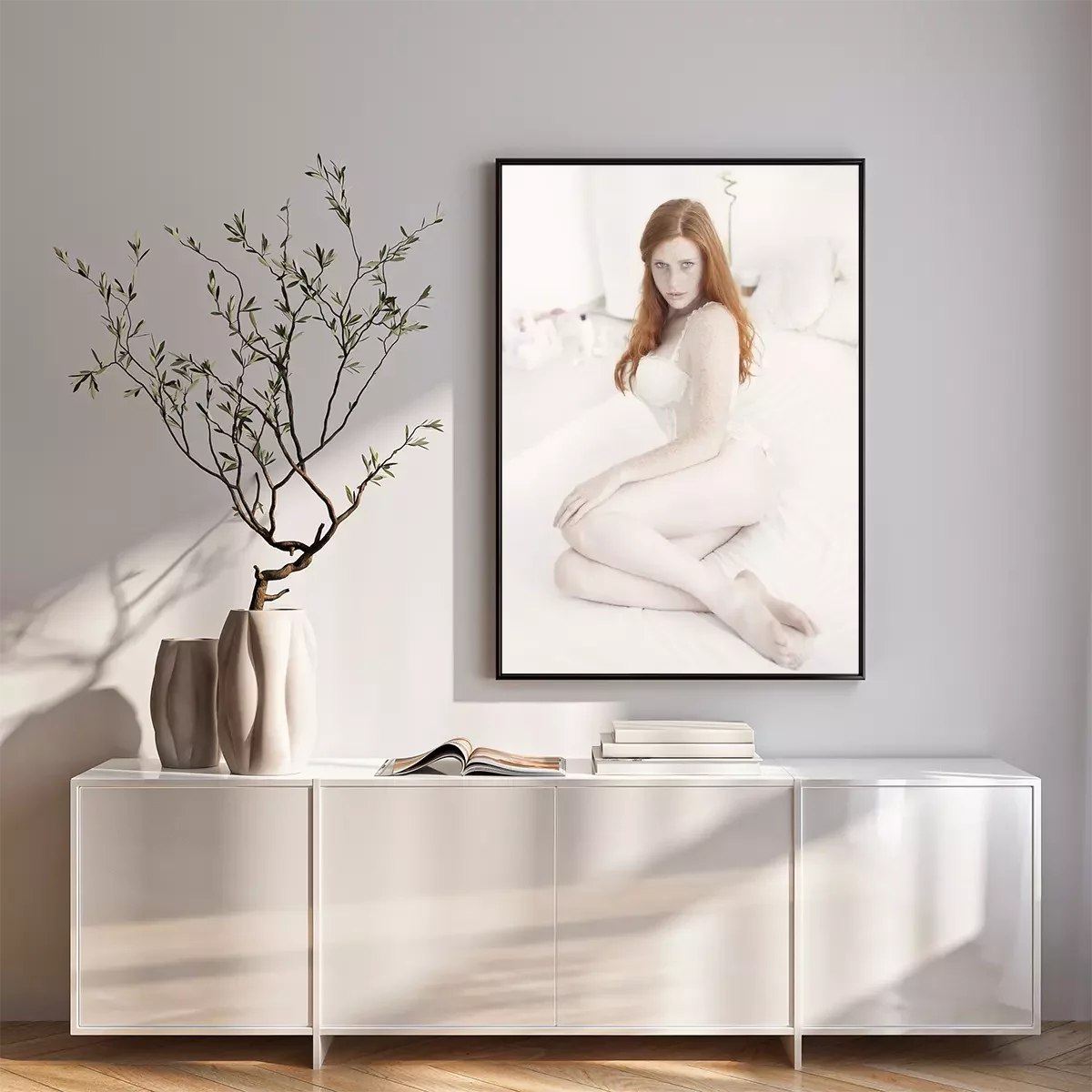 Poster: Sproeten roodharige in een slaapkamer bij zonsondergang