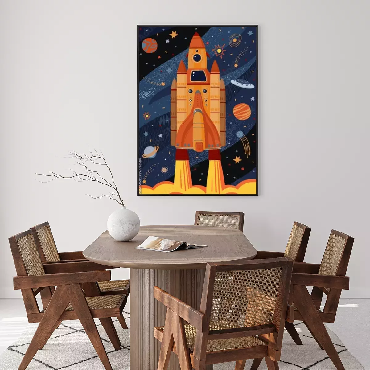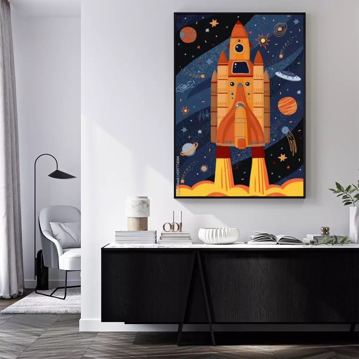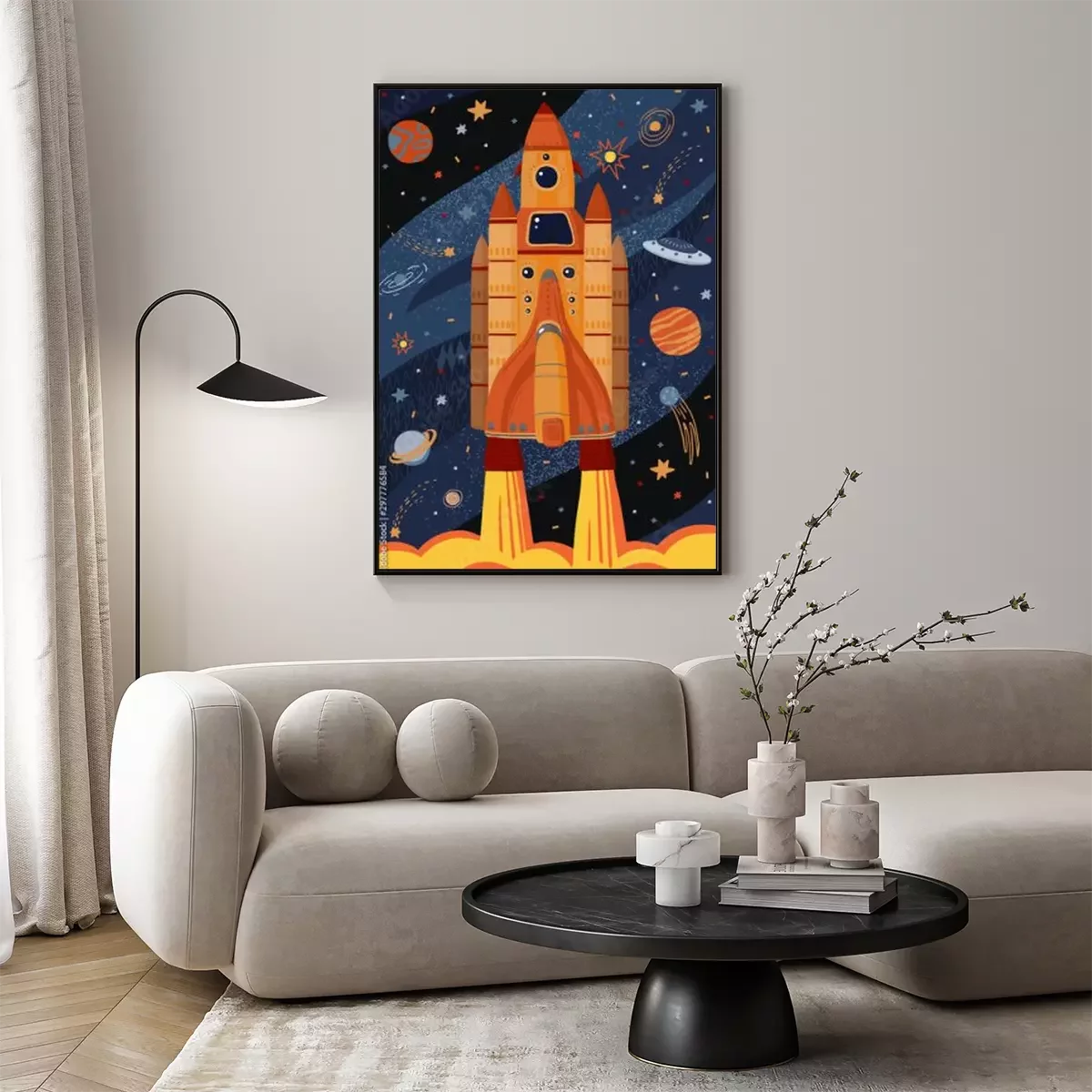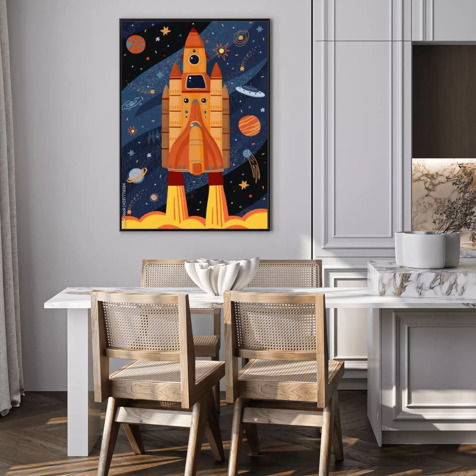 Een creatieve decoratie hoeft geen ongebruikelijke vorm te hebben – een interessante poster kan precies de juiste keuze zijn. Ruimte is een populair thema dat talloze decoratiemogelijkheden biedt. Deze poster is een ideale decoratie voor een jongenskamer, waar hij met zijn cartoonachtige stijl een speelse sfeer creëert en doet denken aan favoriete animatiefilms. Bij het ophangen van de illustratie in het slaapgedeelte van de kamer is het de moeite waard om de verschillende elementen die op de poster worden weergegeven te benadrukken. Ruimte en de planeten die erop zijn afgebeeld, kunnen extra worden geaccentueerd met accessoires zoals een nachtlampje in de vorm van de maan of beddengoed met een galactisch patroon. Bovendien zal de raket, die op de poster opvalt door zijn contrastrijke kleuren, de kamer levendiger maken en een van de centrale elementen van het interieur worden. Dit effect kan worden benut door de decoratie lager aan de muur te hangen om een achtergrond voor de speelhoek te creëren. Tegelijkertijd maakt het dynamische ontwerp van de illustratie de poster ook een geweldige toevoeging aan een tienerkamer. De Ruimte in cartoonstijl weergegeven maakt de illustratie tot een creatieve decoratie – de ingelijste poster kan op een boeken- of platenrek worden geplaatst of in de buurt van een spelconsole worden opgehangen. Een andere decoratie-idee is het creëren van een thematische galerij op de muur. Door de illustratie tussen foto's van de ruimte of vergelijkbare afbeeldingen te plaatsen, wordt op een creatieve manier de poster in de schijnwerpers gezet. De tekening komt bijzonder goed tot zijn recht in een rode of gele lijst, die de compositie afrondt en mooi aansluit bij de kleuren van de afbeelding. Deze opstelling, die moderne illustraties combineert met klassieke fotografie, geeft de tienerkamer een unieke en persoonlijke uitstraling. Daarnaast zal de raket op de poster, dankzij zijn heldere kleur, dienen als een visueel verlichtend element in de kamer. Dit is vooral voordelig wanneer de illustratie in een donkerder interieur wordt opgehangen.