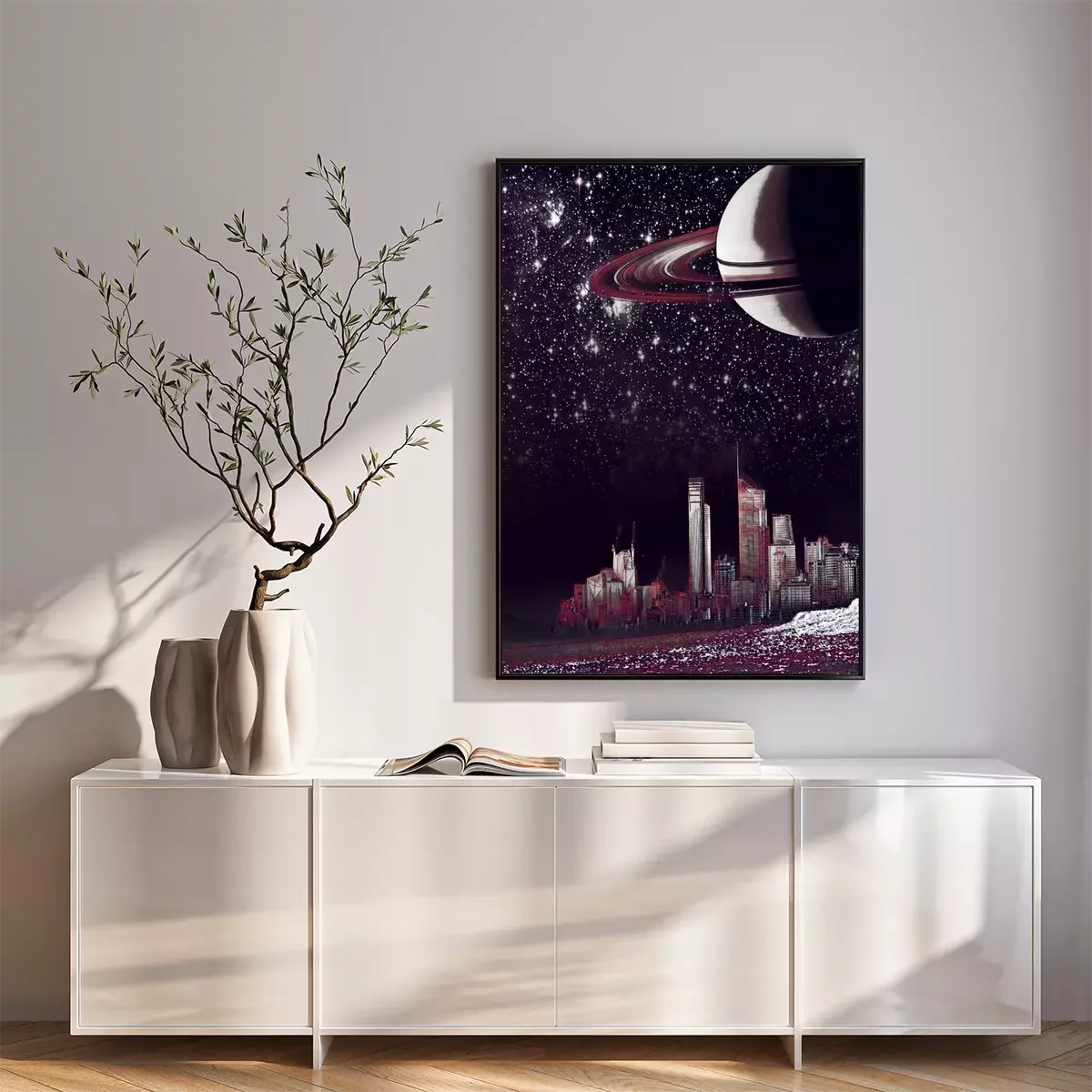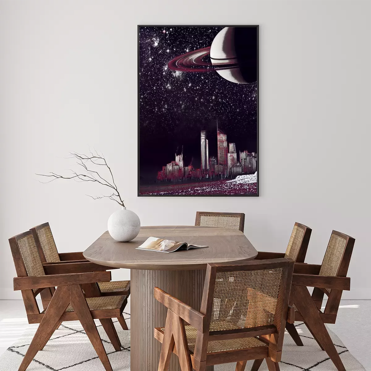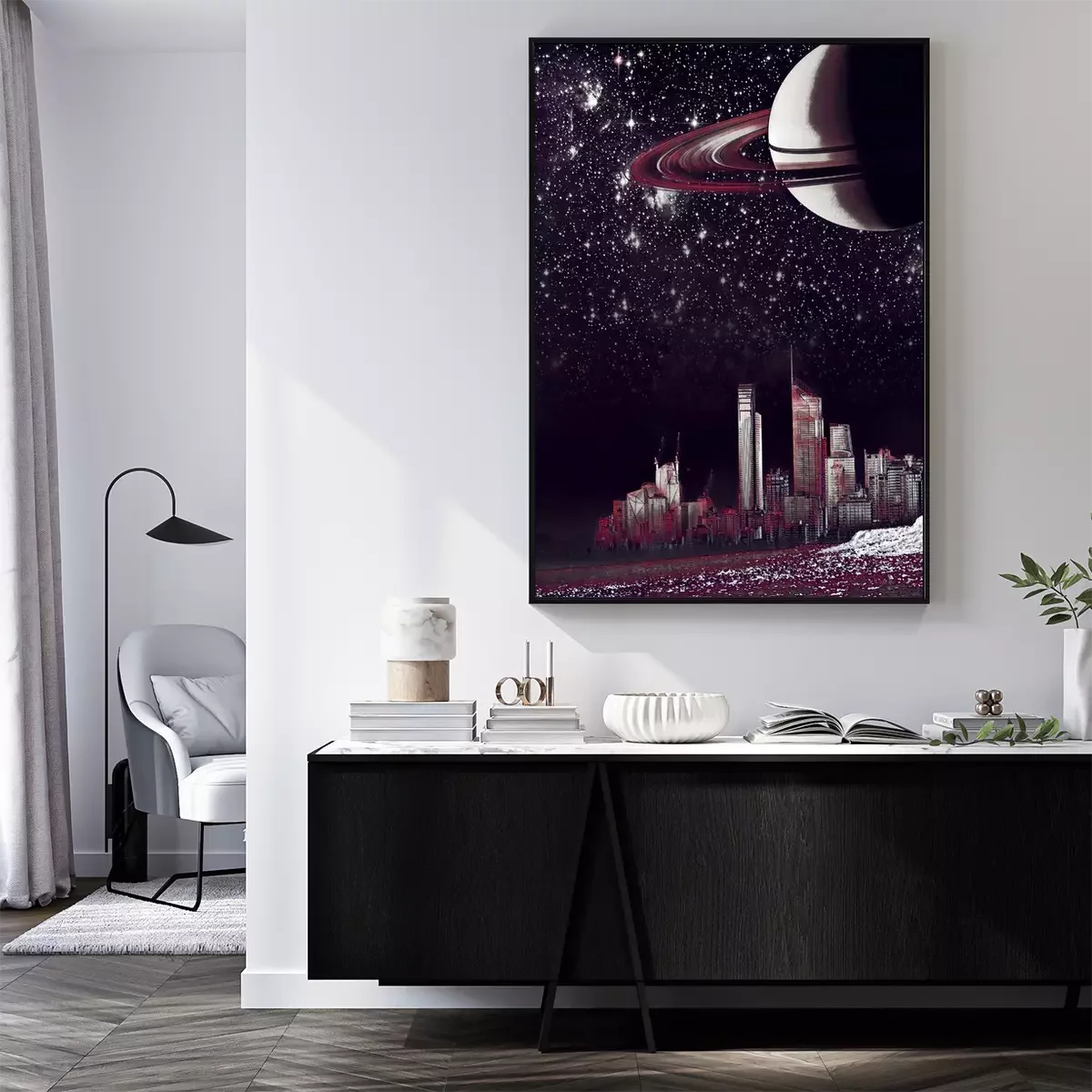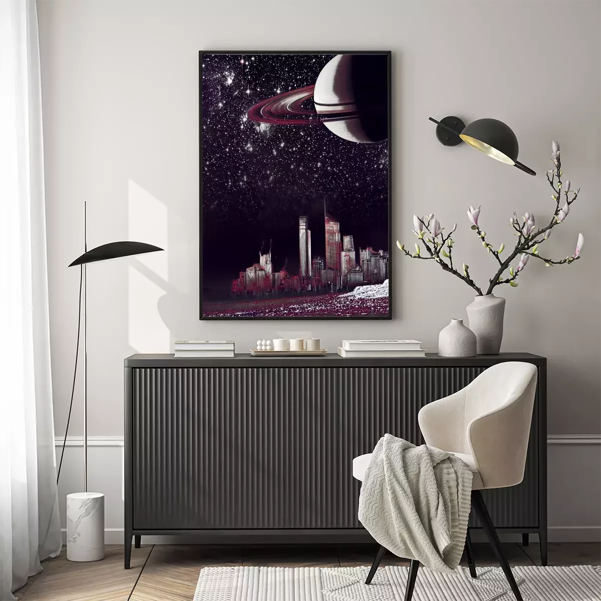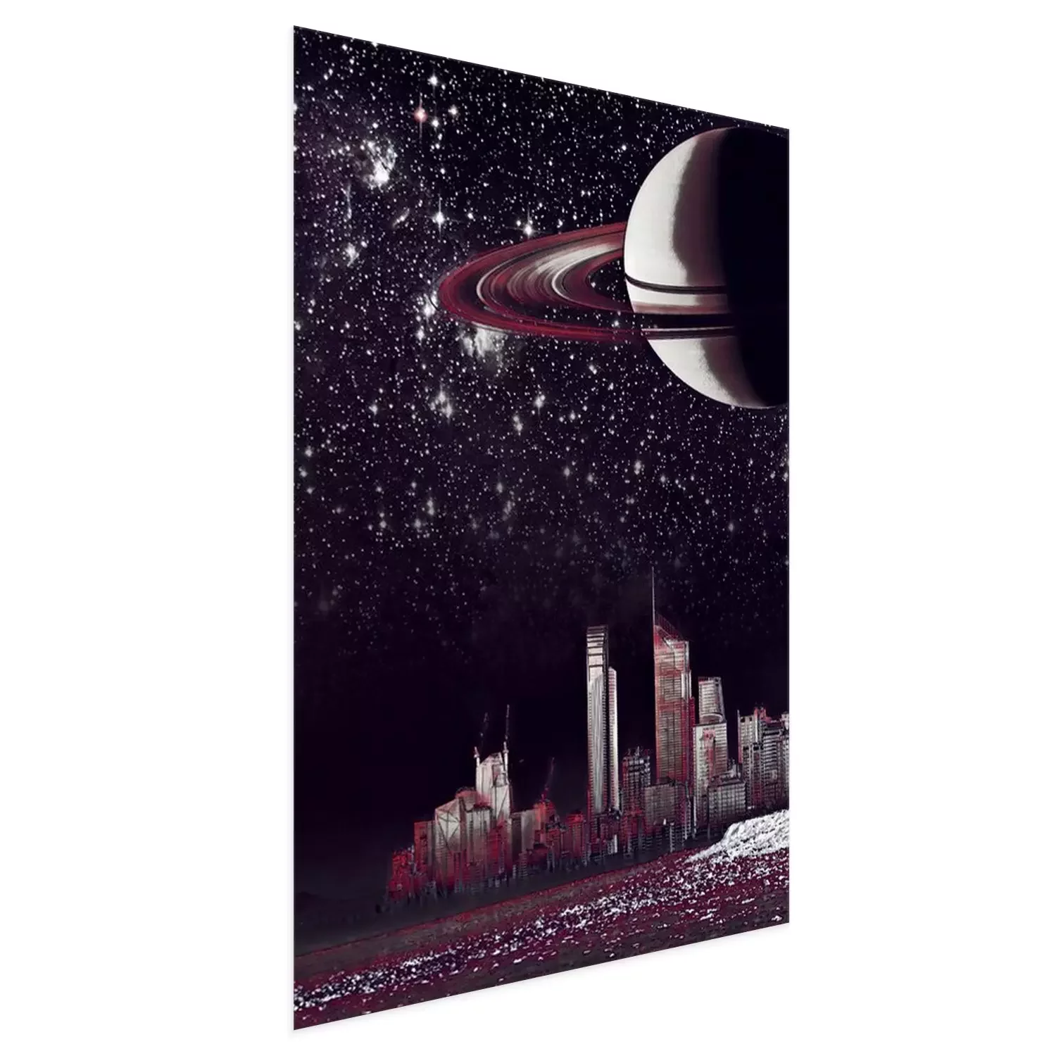 Poster: Stad 's nachts in het licht van de planeet