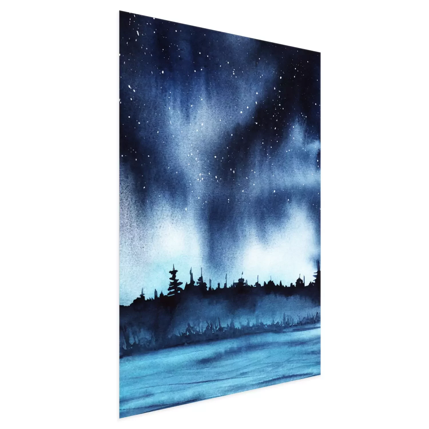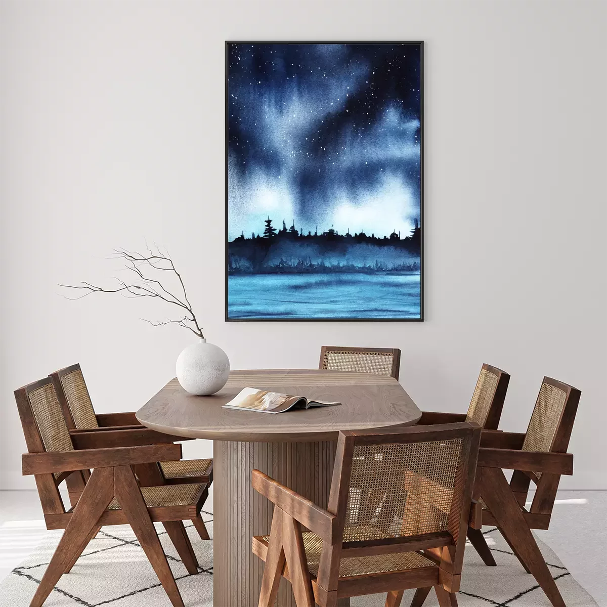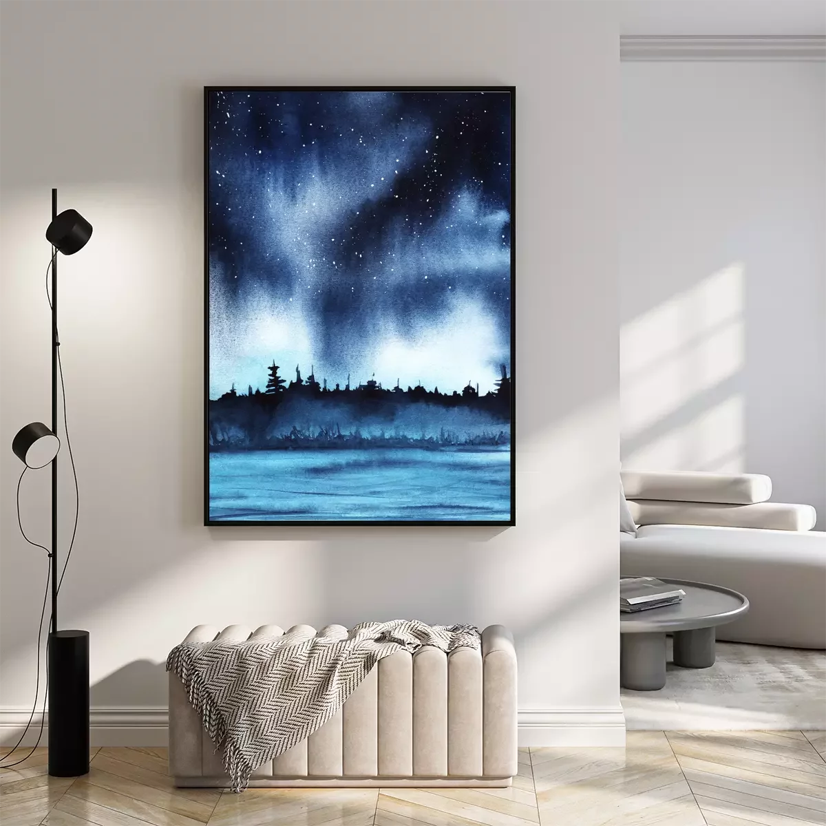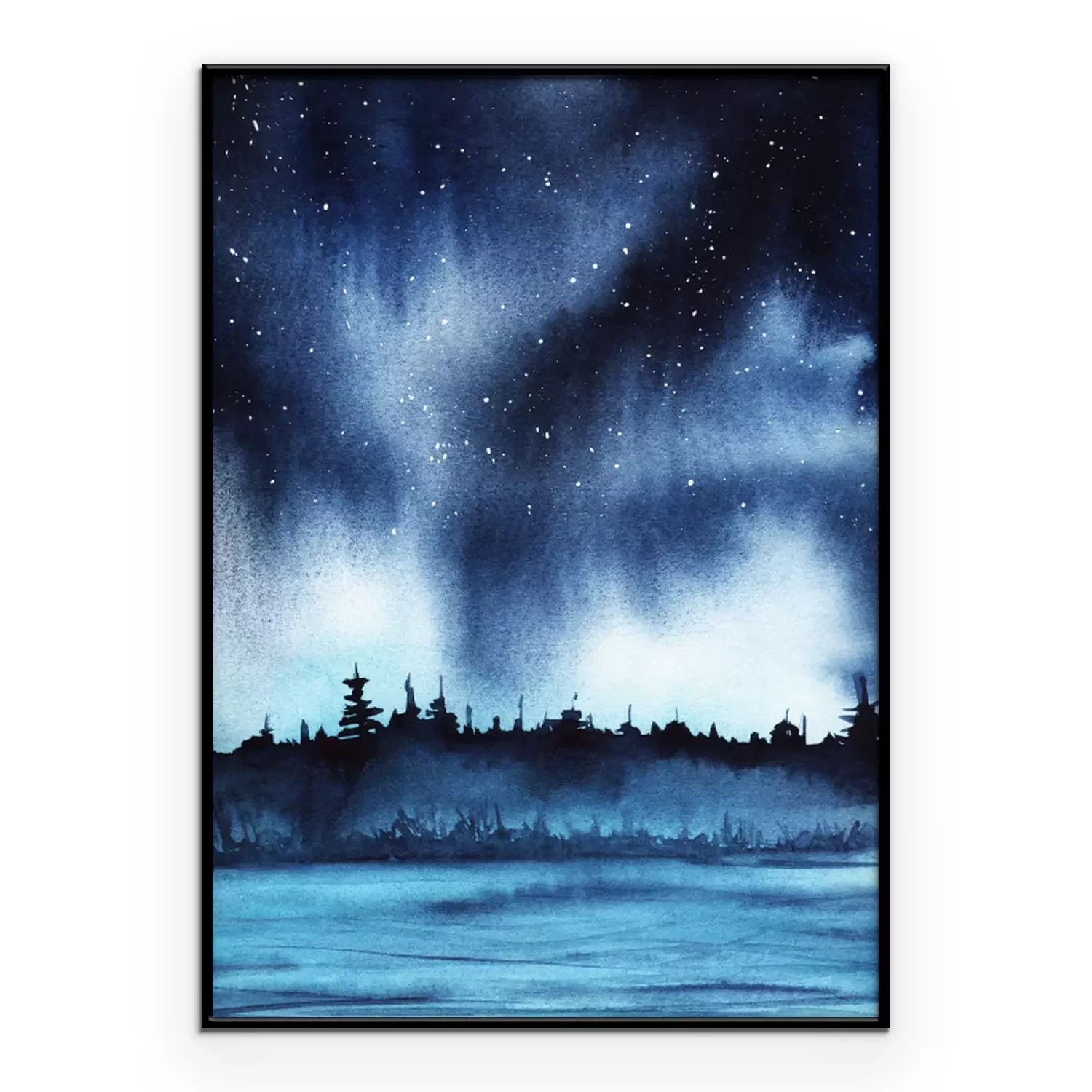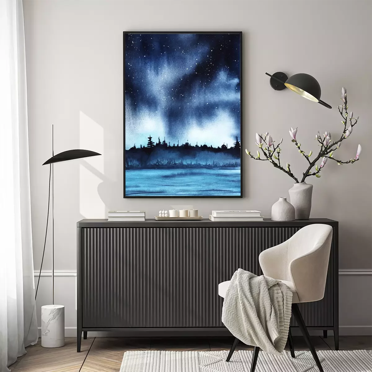 Gedrukte wanddecoraties kunnen doen denken aan kleine kunstwerken, net zoals de door ons gekozen posters. Sterrennacht wordt gepresenteerd alsof het een aquarel is. Het patroon weerspiegelt perfect het uiterlijk van waterverf, die geen sterke kleurvlek op het papier creëert, maar zachtjes vervaagt over het oppervlak, waardoor hier en daar een halftransparant effect ontstaat. Aan de ene kant is dit een opvallende poster. Sterrennacht en de donkere bomenlijn zullen een sterk dominant element in de kamer worden. Aan de andere kant – dankzij de aquarelachtige stijl – straalt het patroon een zekere lichtheid uit, waardoor het zelfs in een kleine ruimte goed zal staan. De blauwe tint waarin het patroon is gehouden, biedt veel mogelijkheden voor decoratie. Het zal goed tot zijn recht komen in combinatie met zowel koele grijstinten als warme bruintinten of beiges. Wat de aandacht trekt, is de uitstraling van de hemel die de poster weergeeft. Sterren worden getoond op lichtgevende strepen, die doen denken aan het noorderlicht. Dit maakt dat het patroon perfect past in een Scandinavisch interieur. Het helpt om een sfeer van wilde, noordelijke natuur in de inrichting te brengen. Een aspect om op te letten is ook de minimalistische uitstraling van de poster. Meer, dat zich op de voorgrond bevindt, wordt pas na een tijdje zichtbaar. De monochrome kleurschakering en vereenvoudigde vormen geven het geheel een kunstzinnig, niet-realistisch uiterlijk. Hierdoor zal zo'n poster perfect passen in een minimalistisch interieur. Meer, met zijn zacht golvende oppervlak, brengt een kalmerende sfeer, en in combinatie met de rustgevende blauwe tinten wordt het een decoratie die perfect aansluit bij de inrichting van een slaapkamer. De finishing touch van deze wanddecoratie kan een eenvoudige zwarte aluminium lijst zijn, waarin deze poster prachtig tot zijn recht zal komen. Sterren op de aquarelillustratie krijgen hierdoor een elegante omlijsting, waardoor deze decoratie een indrukwekkend element in de kamer zal zijn.