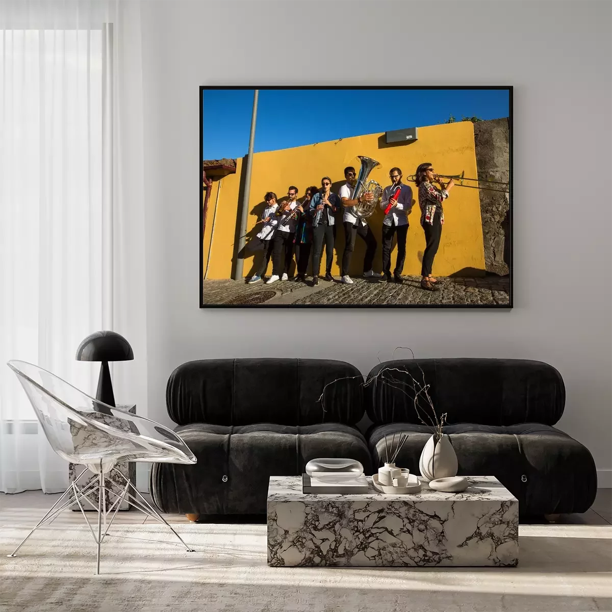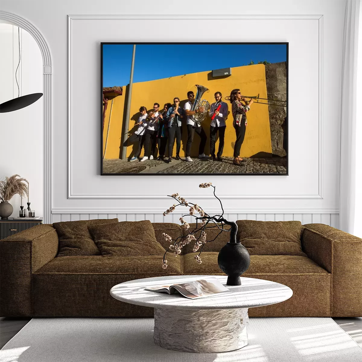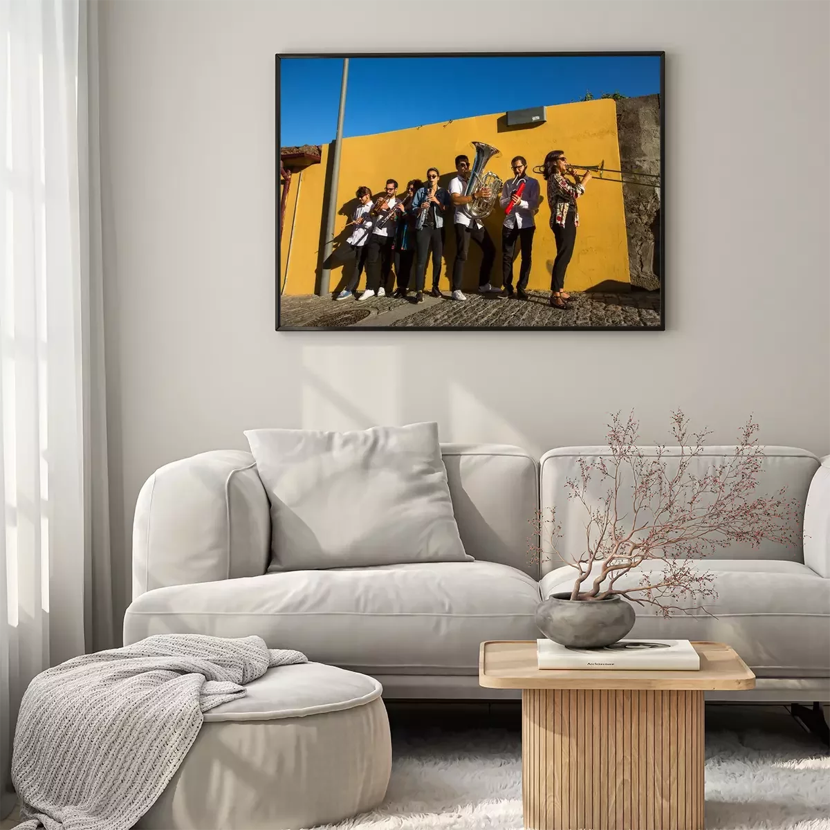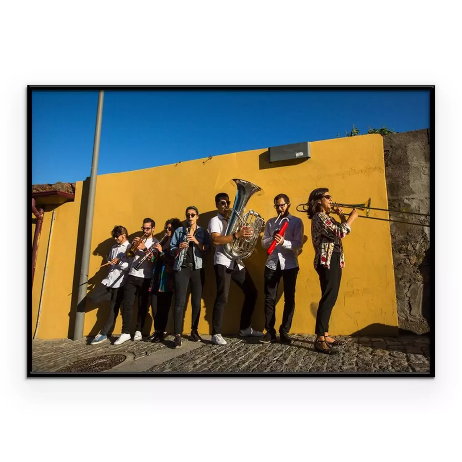 Poster: Streets musicians play music in the street of old downtown, Portugal.