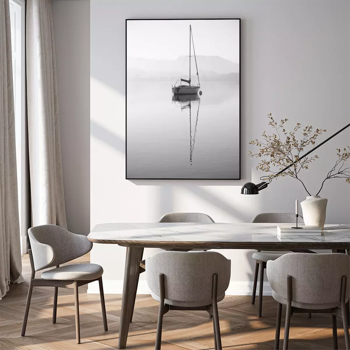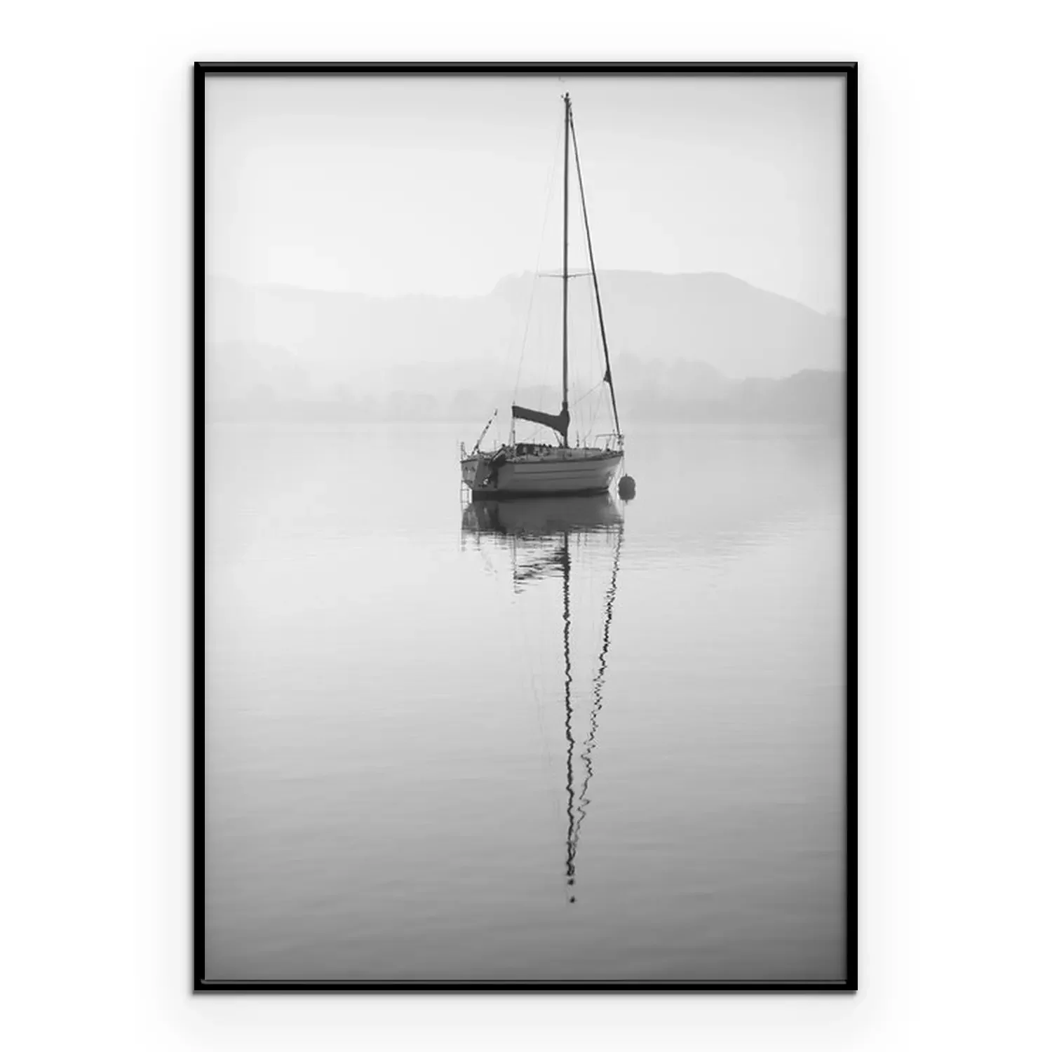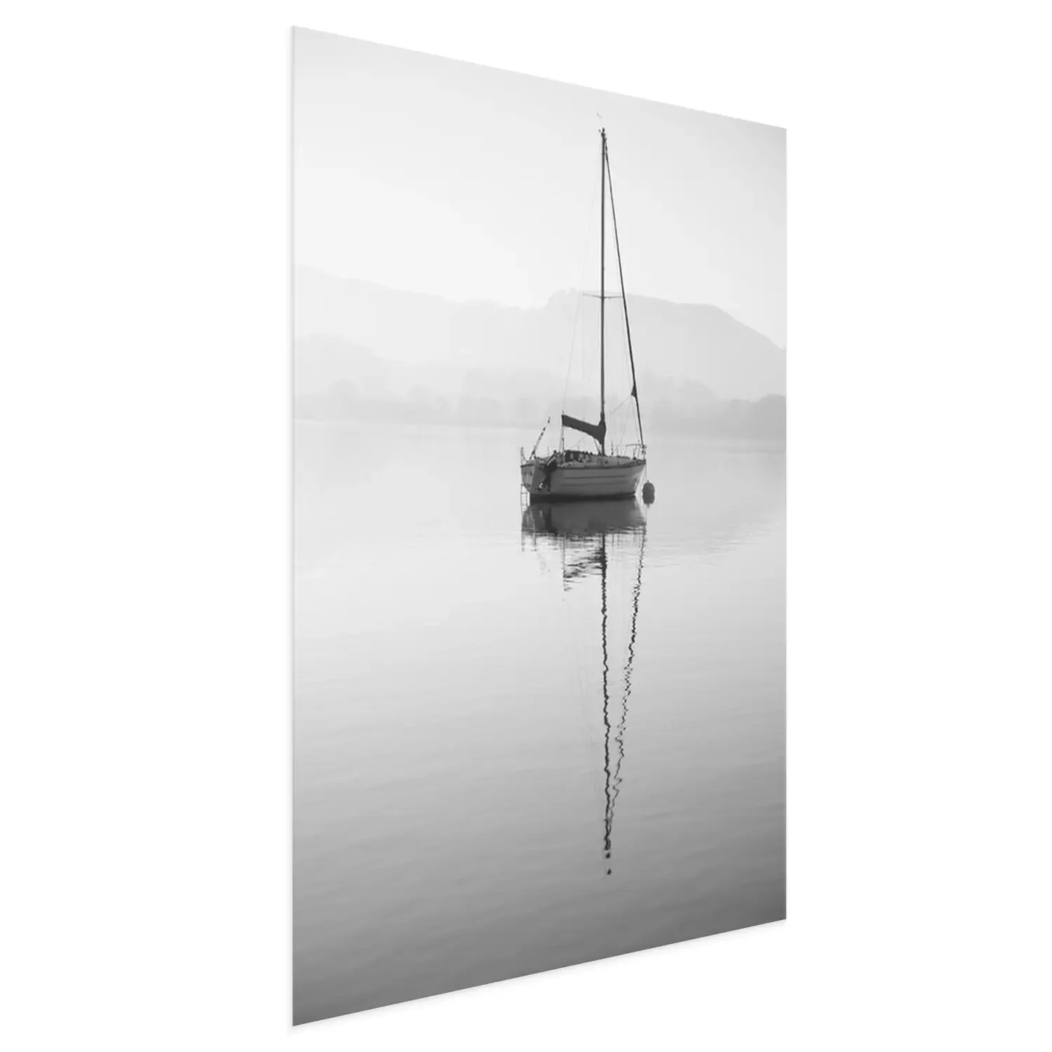 Poster: Stunning unplugged fine art landscape image of sailing yacht sitting still in calm lake water in Lake District during peaceful misty Autumn Fall sunrise