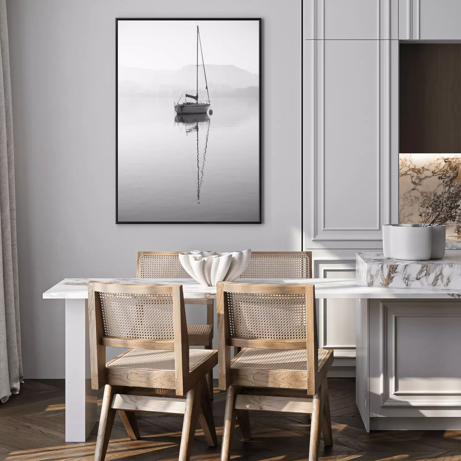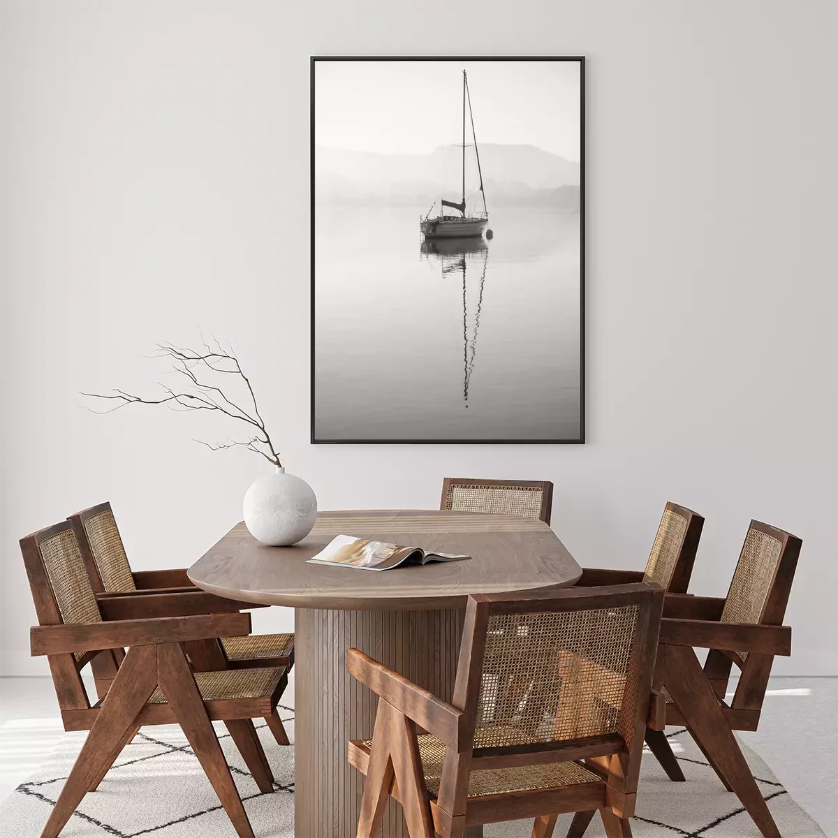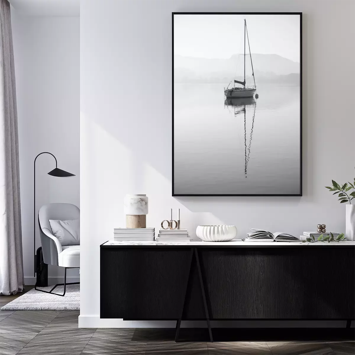 Poster: Stunning unplugged fine art landscape image of sailing yacht sitting still in calm lake water in Lake District during peaceful misty Autumn Fall sunrise