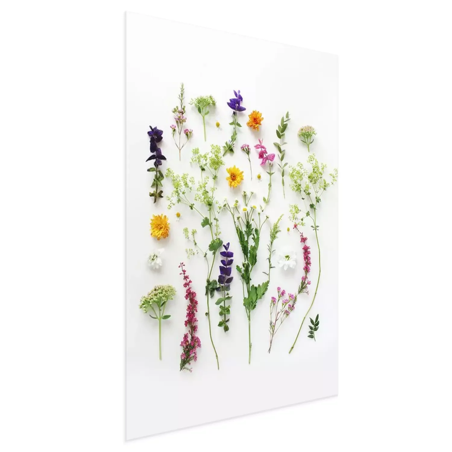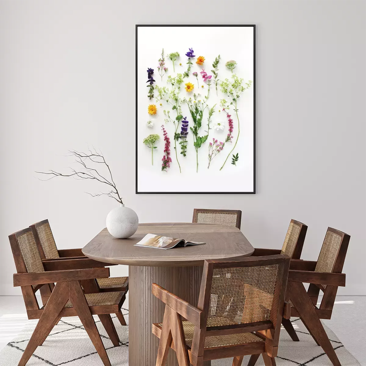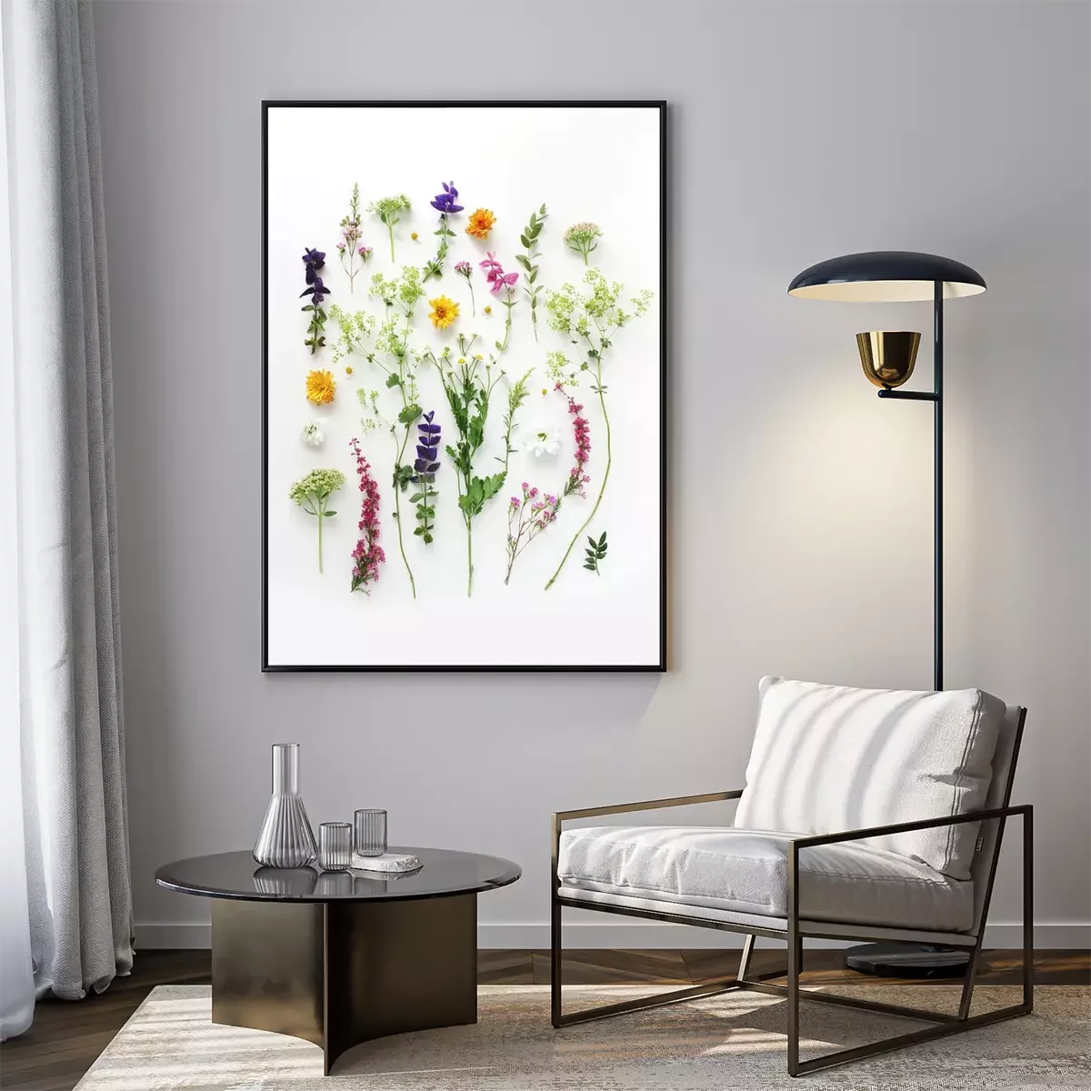 Poster: Summer botanical pattern. Floral composition of fewerfew, erica, sage and chrysanthemum flowers and green alchemilla plants on white wooden background. Styled stock photo. Flat lay, top view, vertical