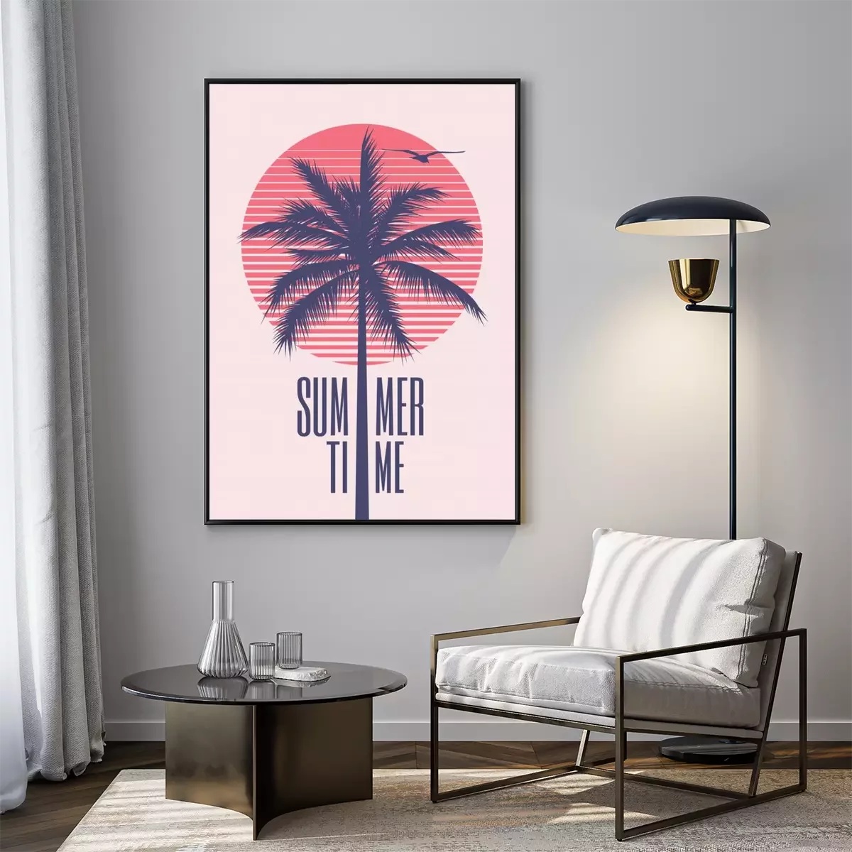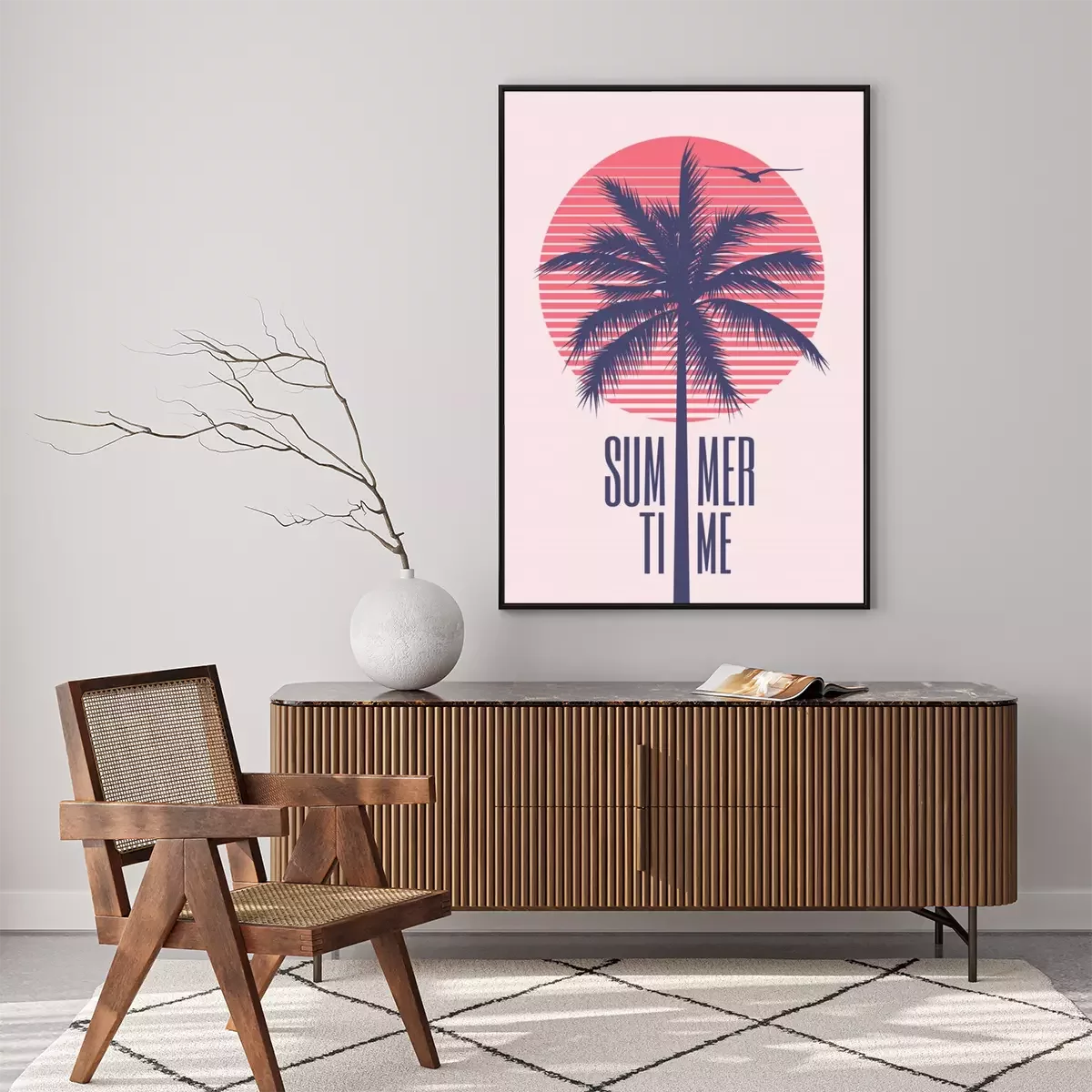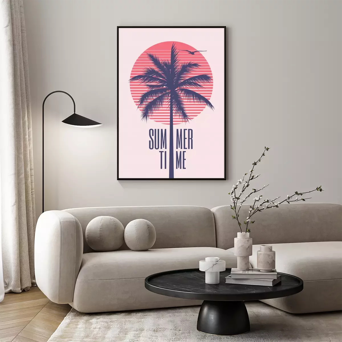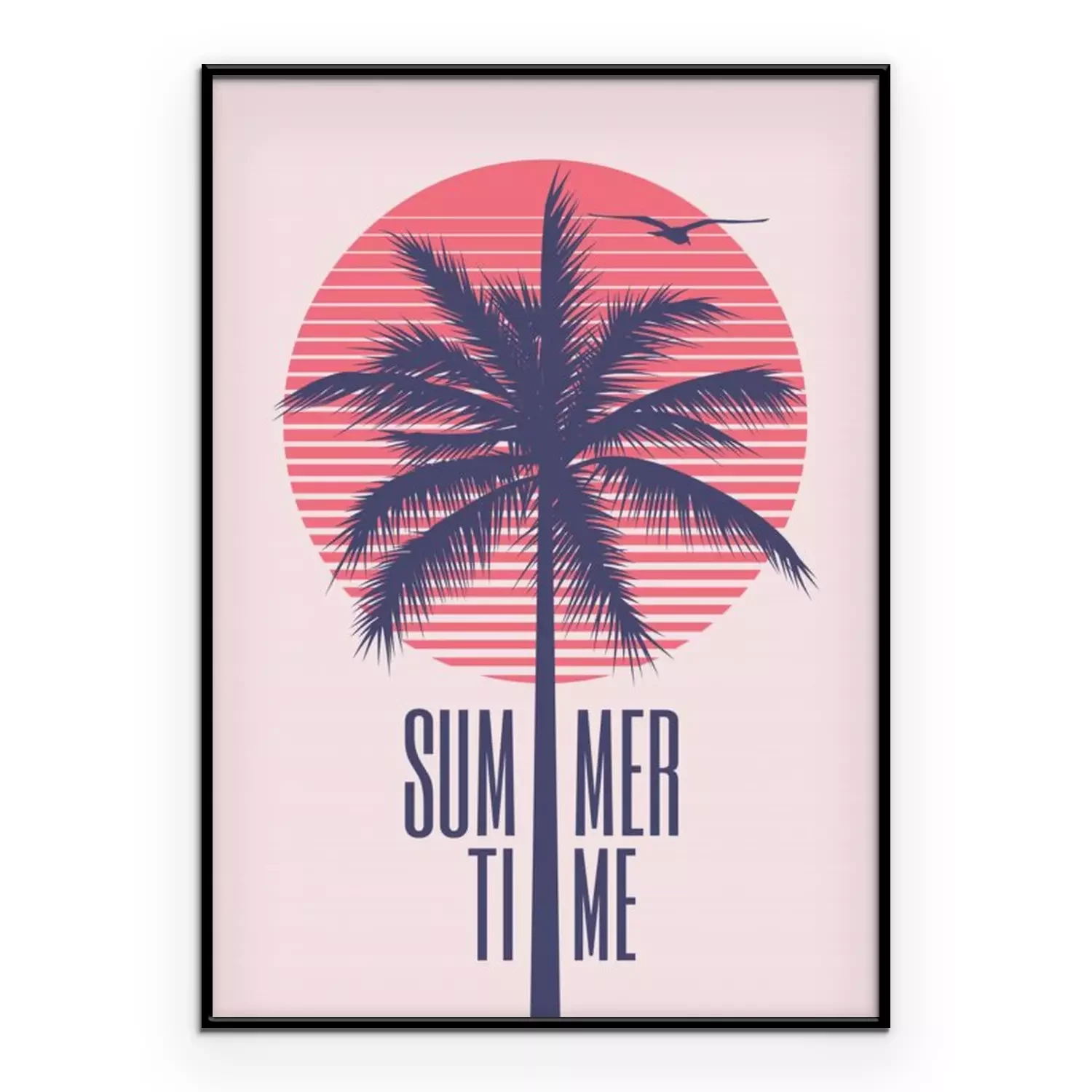 Poster: Summer time minimalistic vintage styled poster design template with palm silhouette and red sun on background for summer party or event. Vector illustration