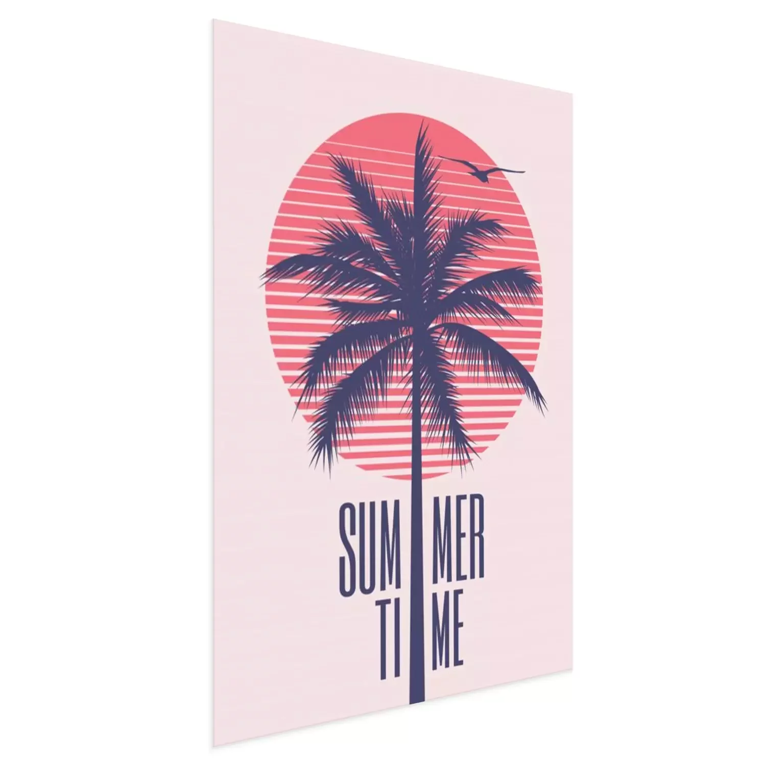 Poster Summer time minimalistic vintage styled poster design template with palm silhouette and red sun on background for summer party or event. Vector illustration