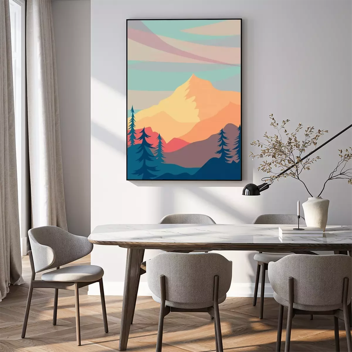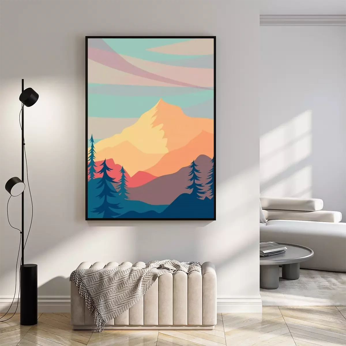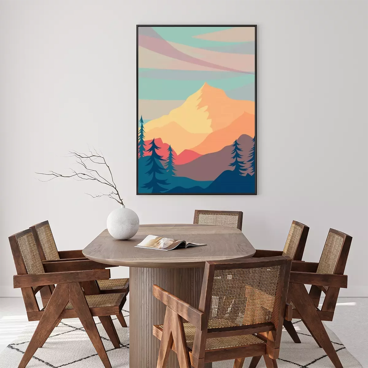 Poster sunny landscape with mountains. warm illustration with hills, trees and clouds. Vector horizontal background