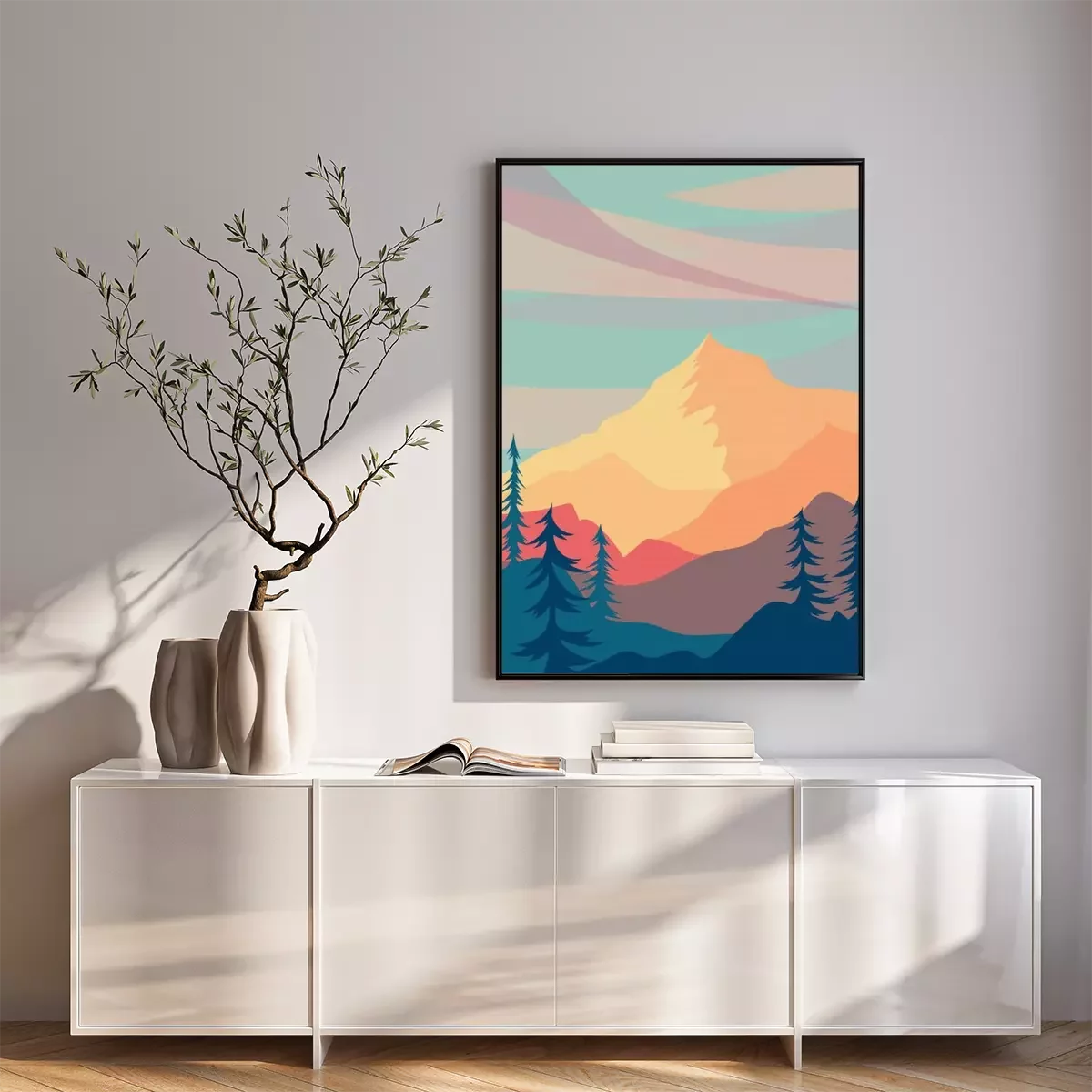 Poster: sunny landscape with mountains. warm illustration with hills, trees and clouds. Vector horizontal background