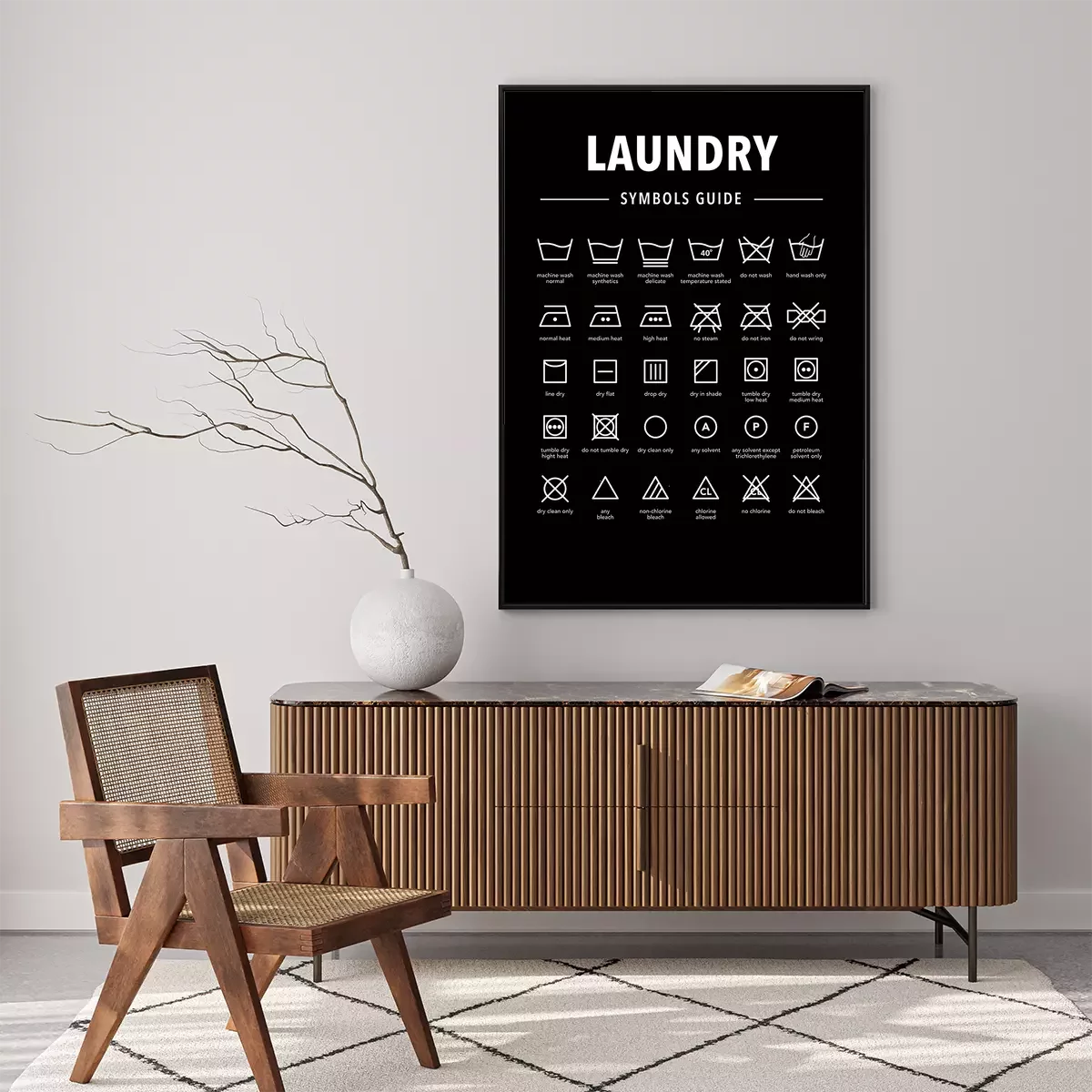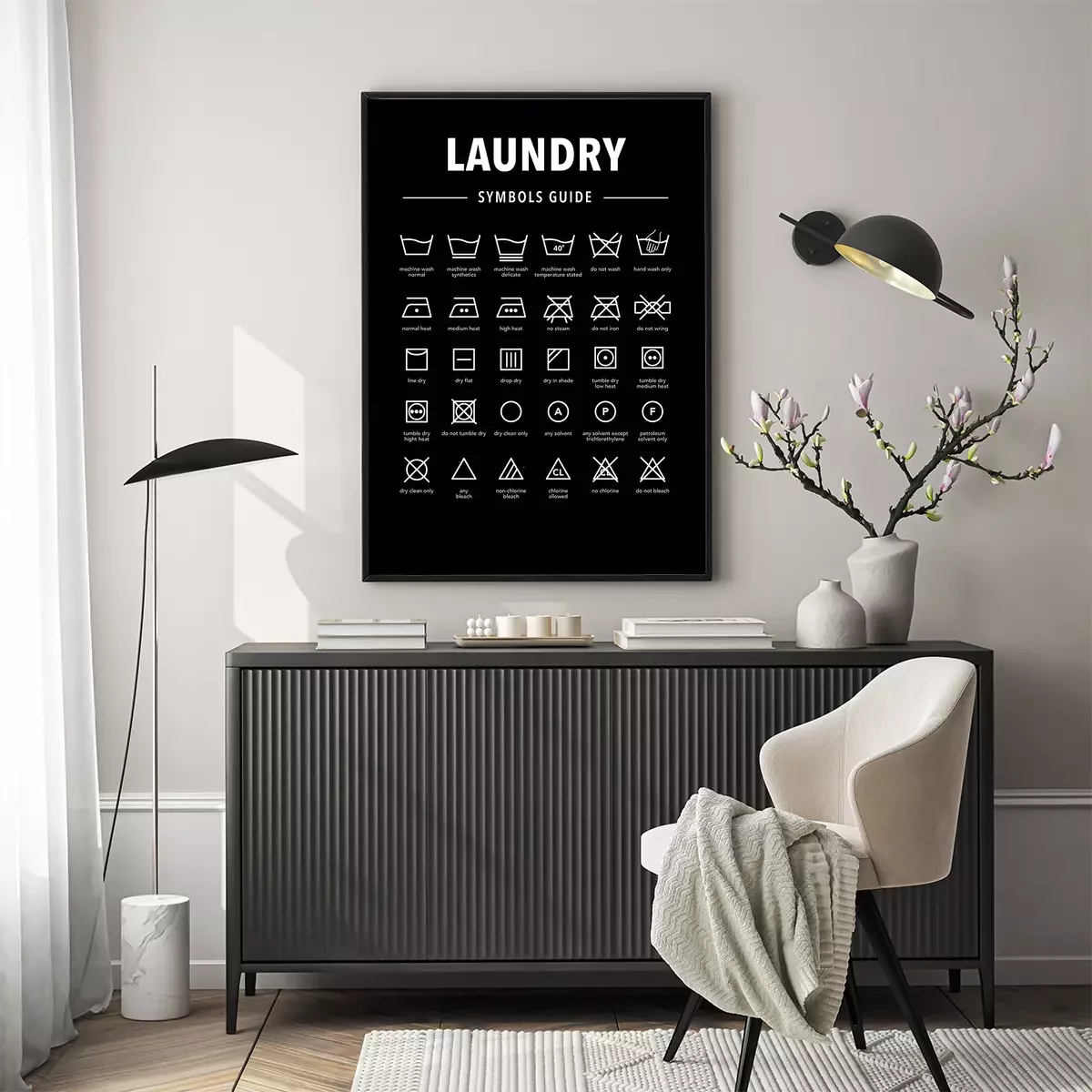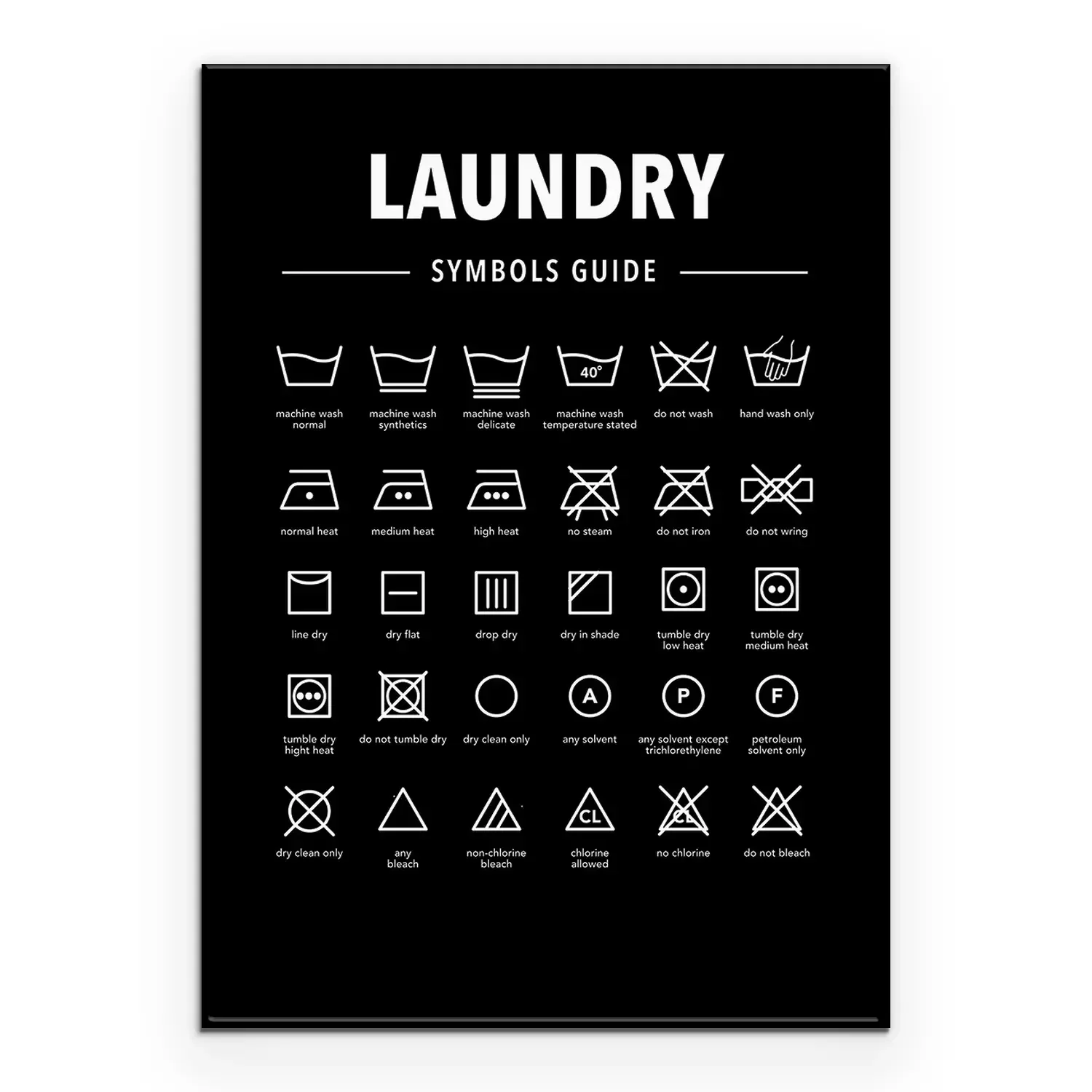 Poster: Symbolen van wasinstructies op een zwarte achtergrond